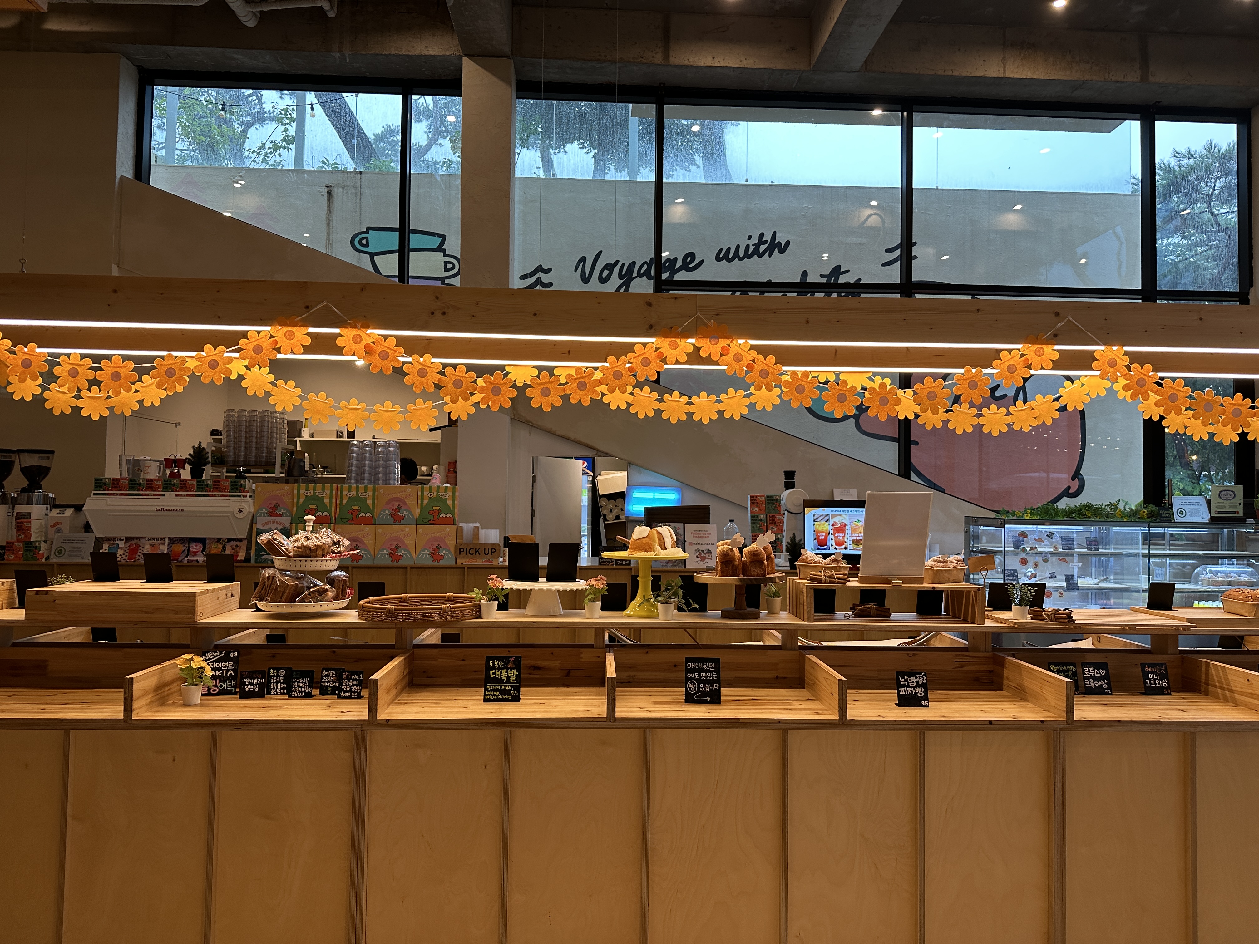 1층과 2층 사이에는 넓은 테이블이 있으며, 2층은 통유리로 된 뷰가 좋은 좌석들이 많아 대부분의 손님들이 이곳에서 커피를 마십니다. 2층과 3층 사이에는 어린이 쿠킹클래스를 위한 룸이 있으며, 3층은 루프탑으로 되어 있지만 비가 많이 내려서 나갈 수 없었습니다. 비 오는 날에도 야외 테이블과 조명, 도봉산이 보이는 풍경이 멋졌습니다.