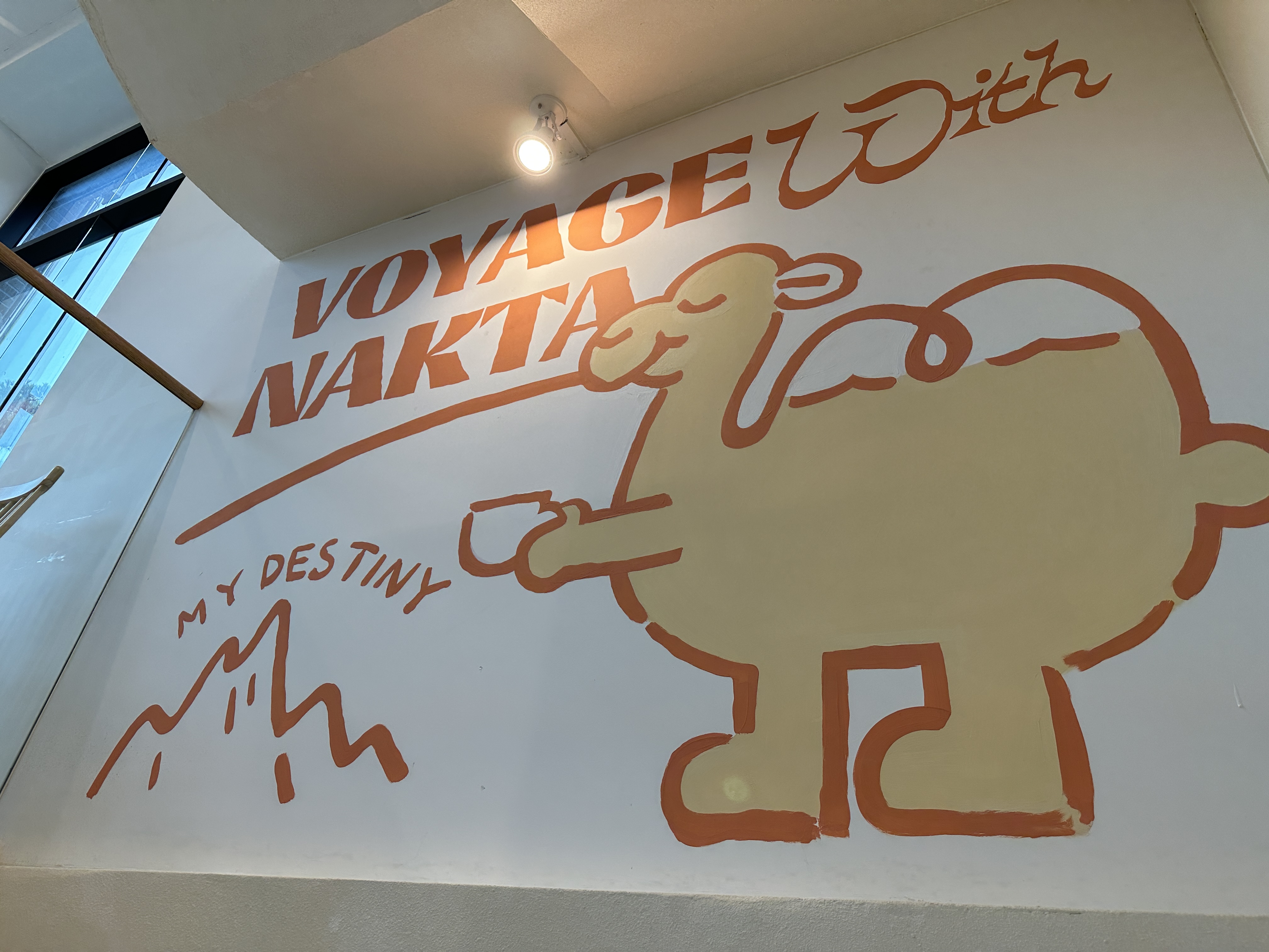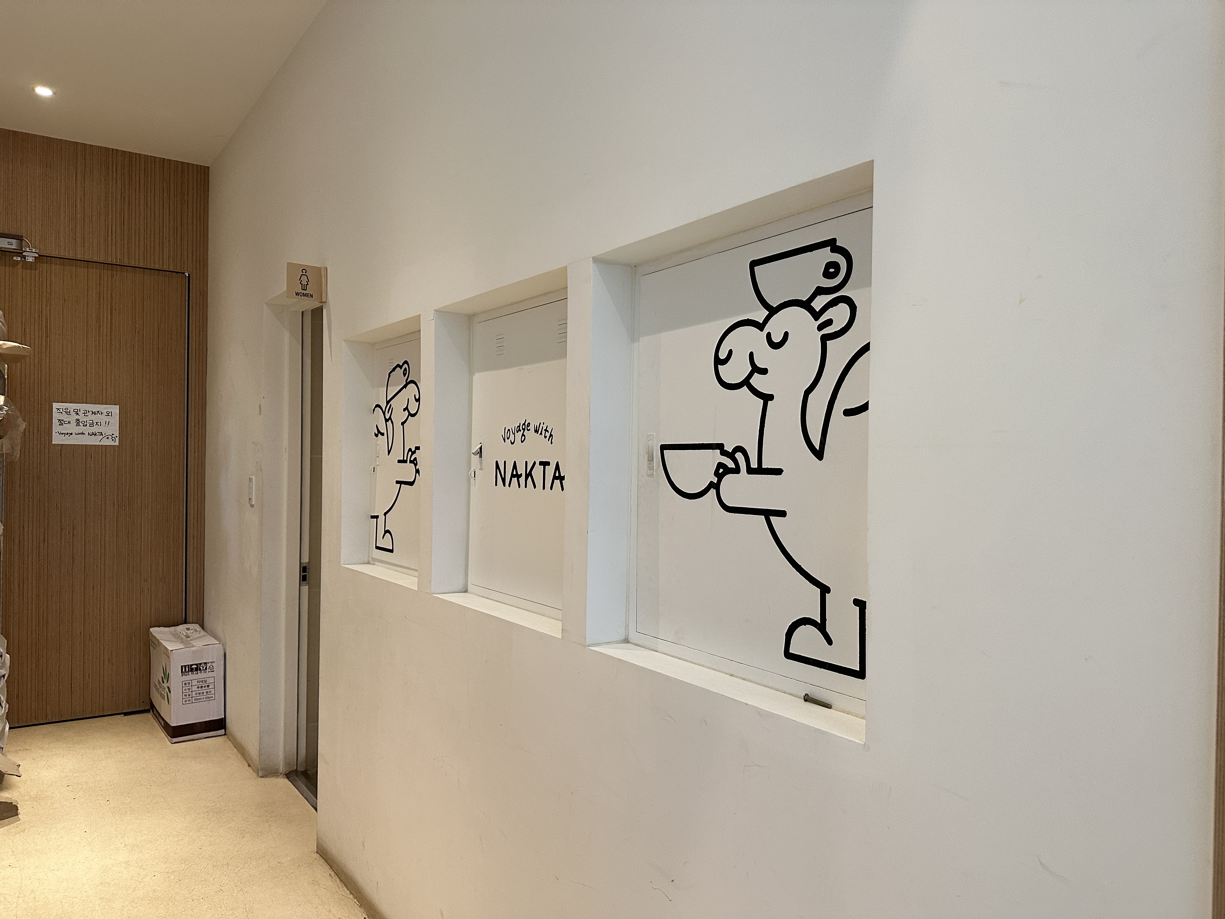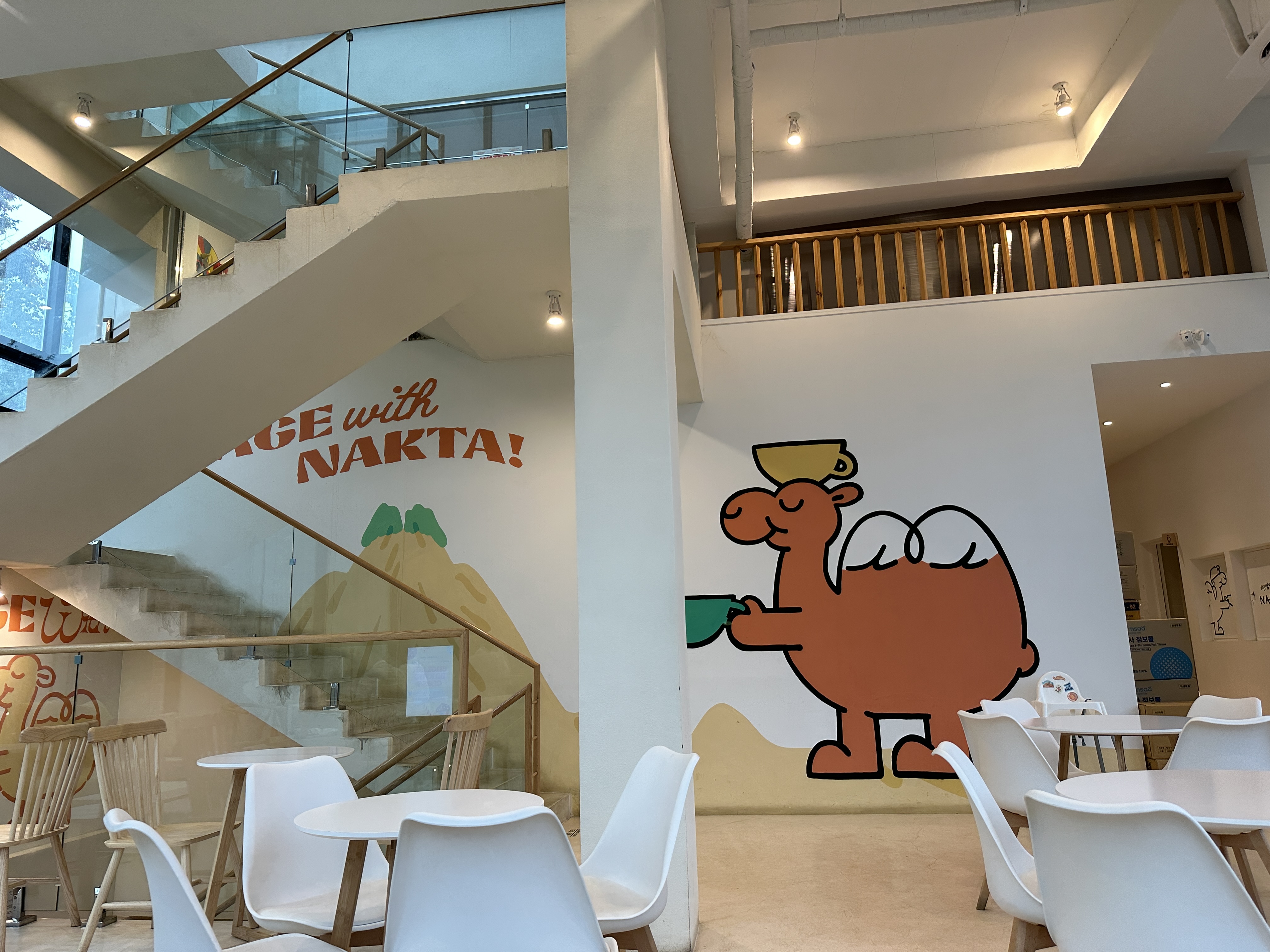 주차장에 도착하니 안내요원이 계셨고, 주차 자리가 넉넉해 원하는 자리에 주차할 수 있었습니다. 베이지색 벽돌 건물에 살구색 낙타 그림이 반겨주었는데, 머그잔을 머리에 쓰고 커피를 들고 걷는 귀여운 모습이었습니다. 이 낙타 그림은 나크타 카페의 시그니처로, 외부 벽과 내부 장식, 다양한 굿즈에서 찾아볼 수 있습니다.