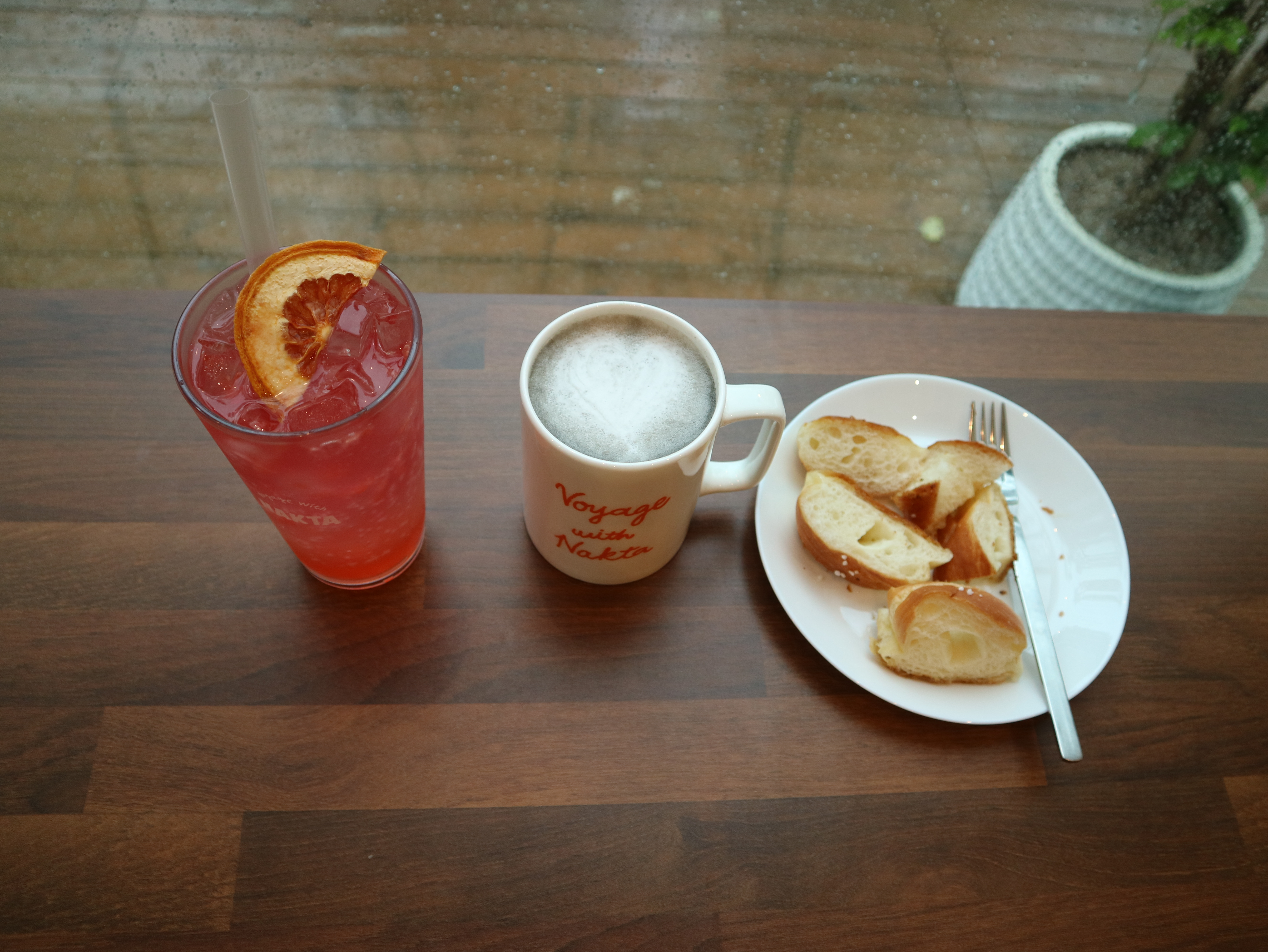 저는 플라밍고 자몽에이드와 나크타 쌍봉 라떼, 시오빵을 주문했습니다. 플라밍고 자몽에이드는 투명한 유리잔에 자몽시럽과 탄산수가 섞여 익숙한 맛이었습니다. 나크타 쌍봉 라떼는 하얀색 머그잔에 아몬드 크림이 올려져 고소하고 부드러운 맛이었습니다. 시오빵은 바로 데워줘서 무척 고소하고 바삭했습니다.