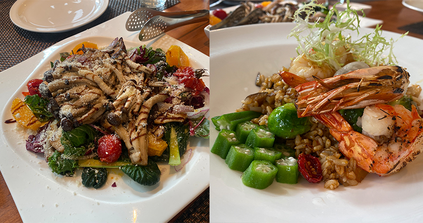 구운 버섯이 이렇게 맛있을 줄 몰랐어요. 치즈가루와 시금치, 과일과 어우러진 식감과 맛이 일품이었어요. 귀리 새우 오크라 볶음밥은 아삭아삭한 귀리가 식감을 더해주더라고요.
