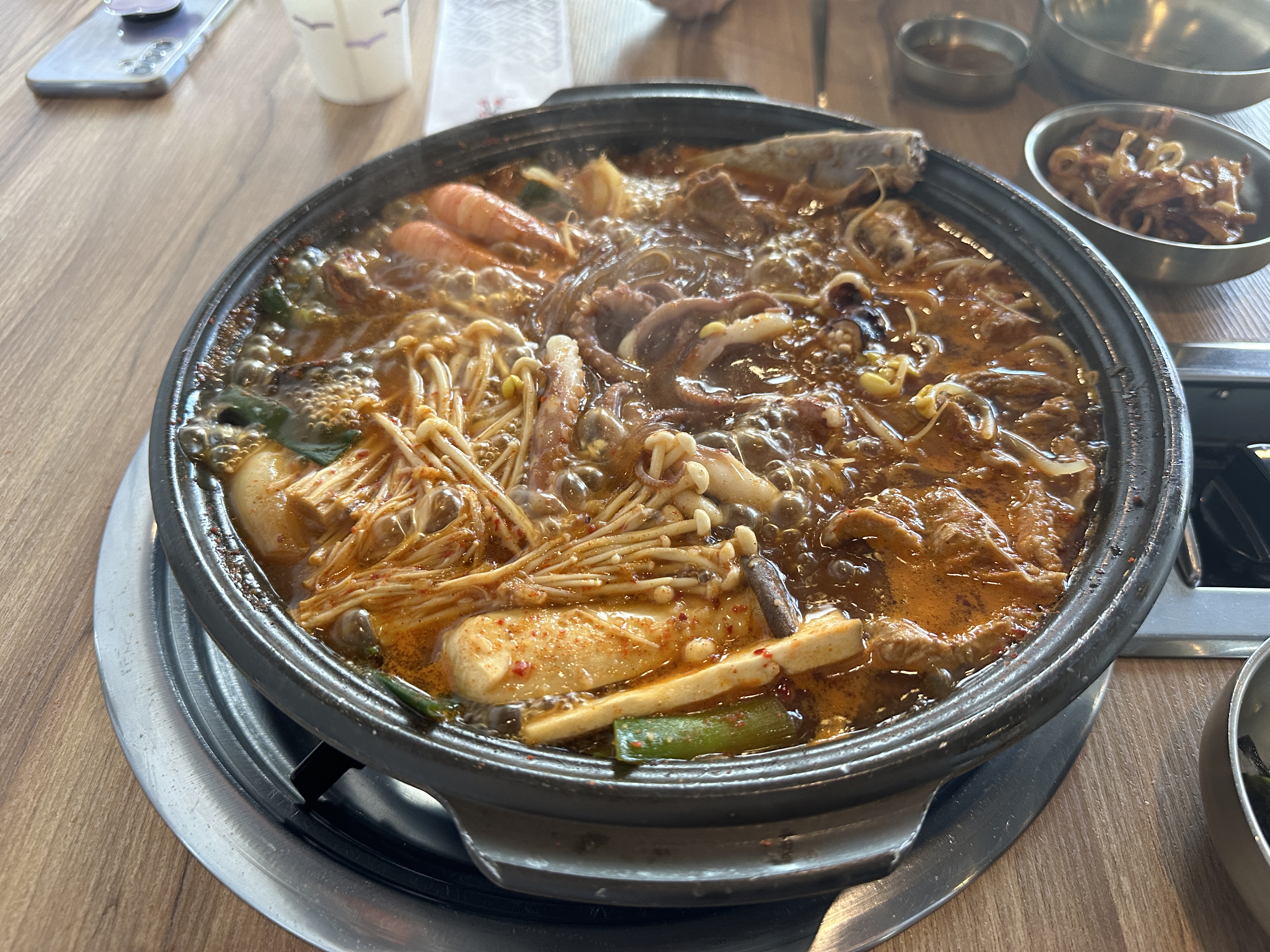 전골이 나오자마자 해산물과 고기의 신선함이 느껴졌어요.
