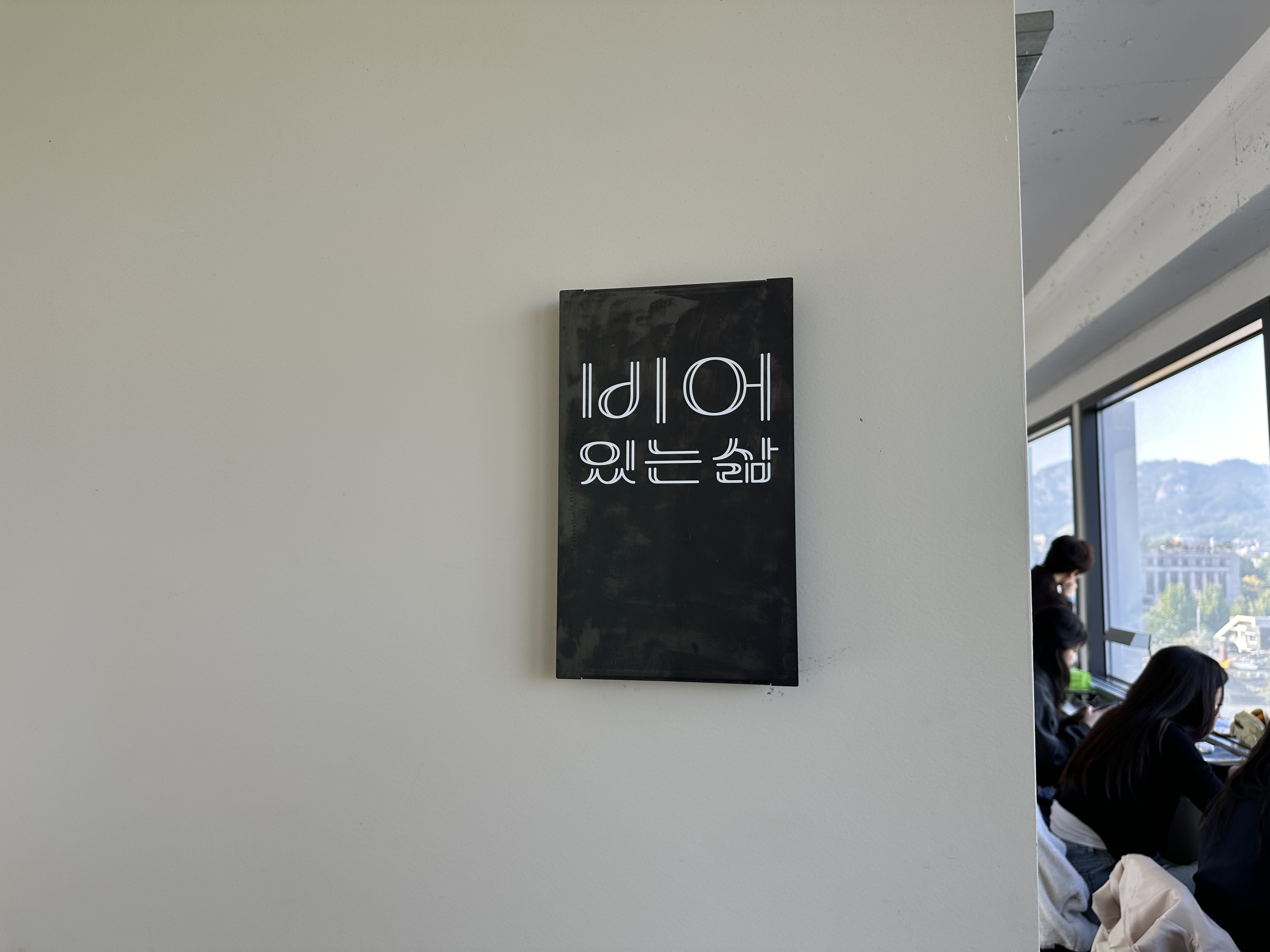 아주 작은 공간을 예상했는데 생각보다 넓었다. 엘리베이터를 타고 올라가 7층에 내리면 바로 카페다. 엘리베이터를 중심으로 오른쪽 매장은 '텅'이고 왼쪽은 '비어있는 삶'이다. 얼핏 보면 다른 매장 같지만 같은 가게다. 텅에서 주문을 하고 어디서든 커피를 마실 수 있다. 엘리베이터 앞 공간은 약간 거실 같은 느낌으로 창가 좌석이 있어서 이용 가능했다.