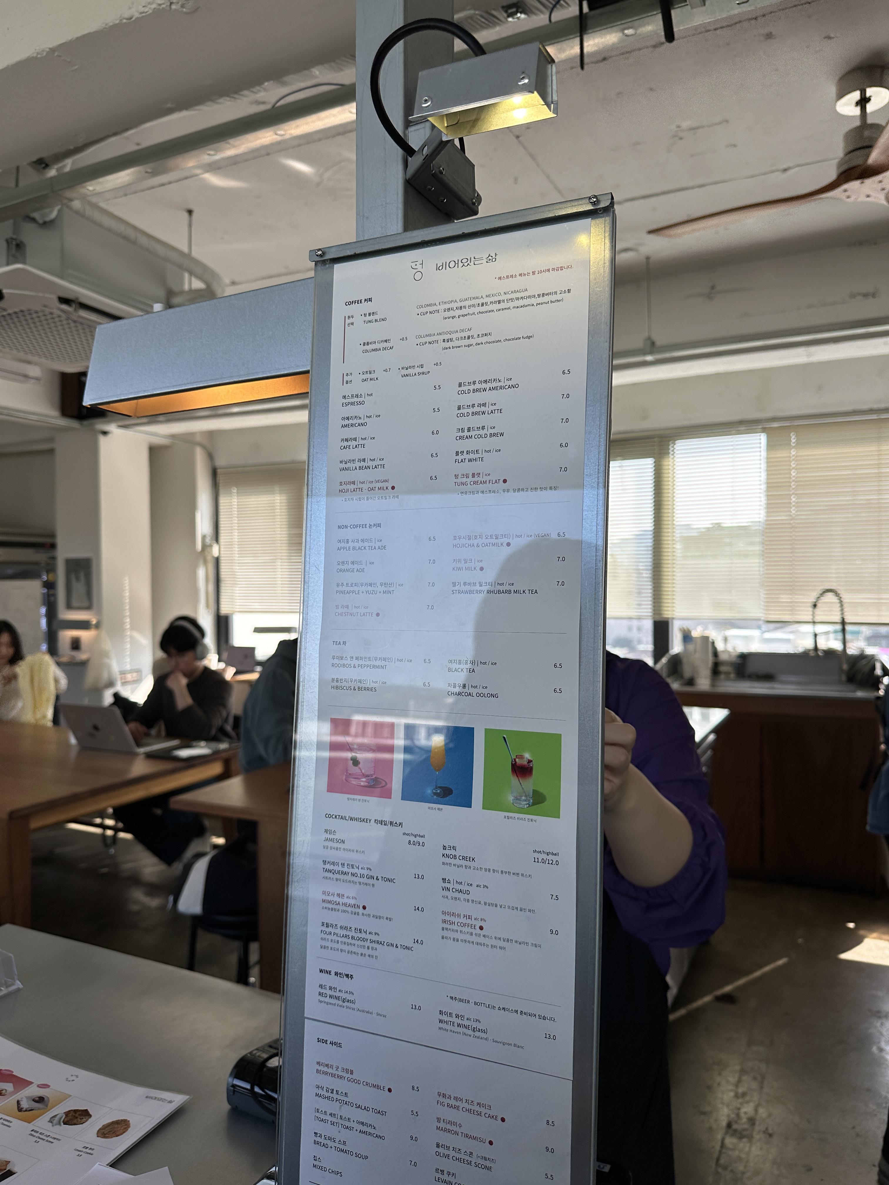 음료 메뉴는 여러 중류의 커피 외에도 차, 칵테일, 위스키, 와인까지 다양했다. 케이크, 스콘, 큐키, 토스트 등 디저트 메뉴도 있다.