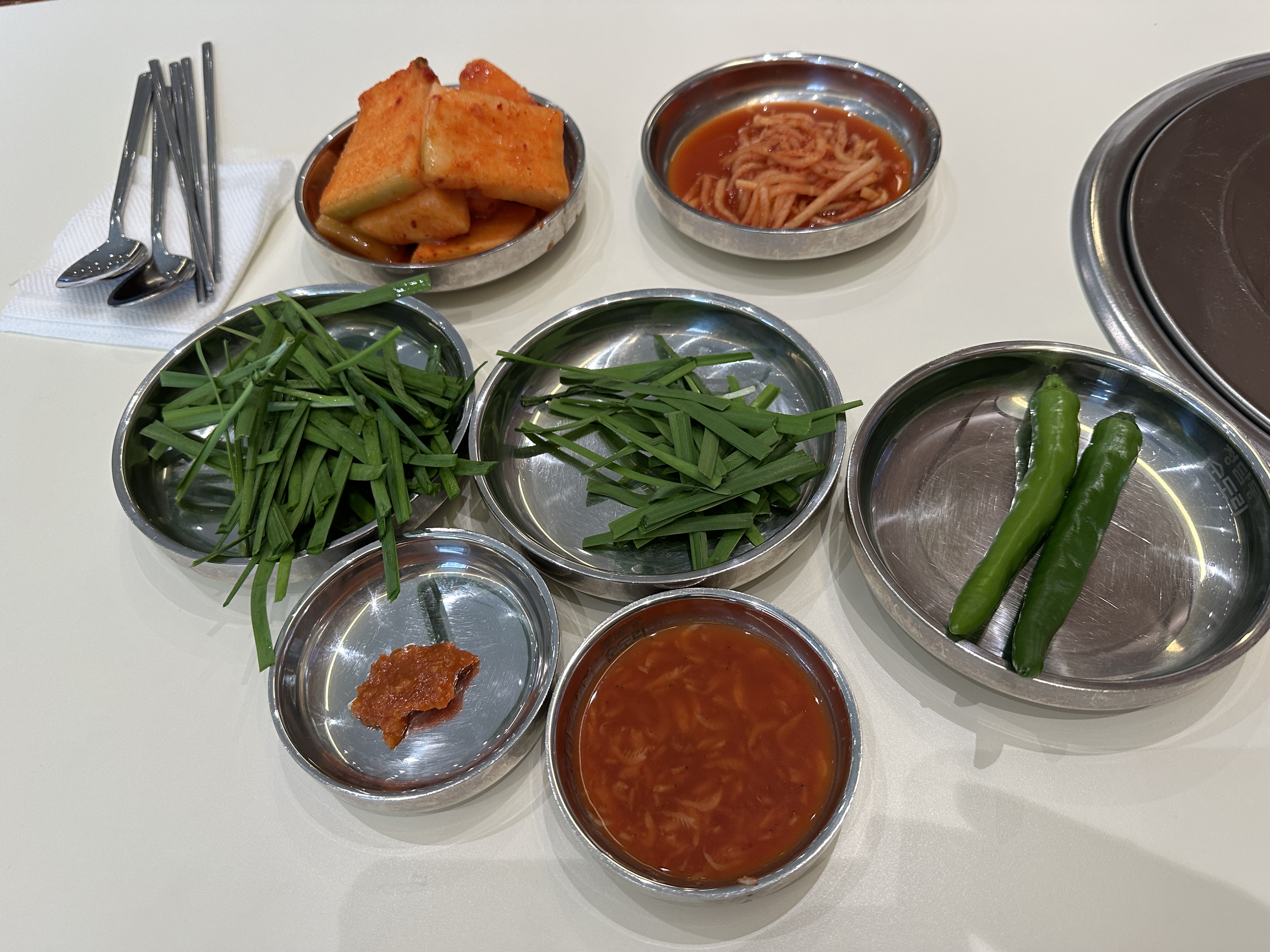 기본 반찬은 무생채, 깍두기, 풋고추가 있고 셀프바를 이용하면 된다. 부추도 마음껏 가져다 먹을 수 있었다.