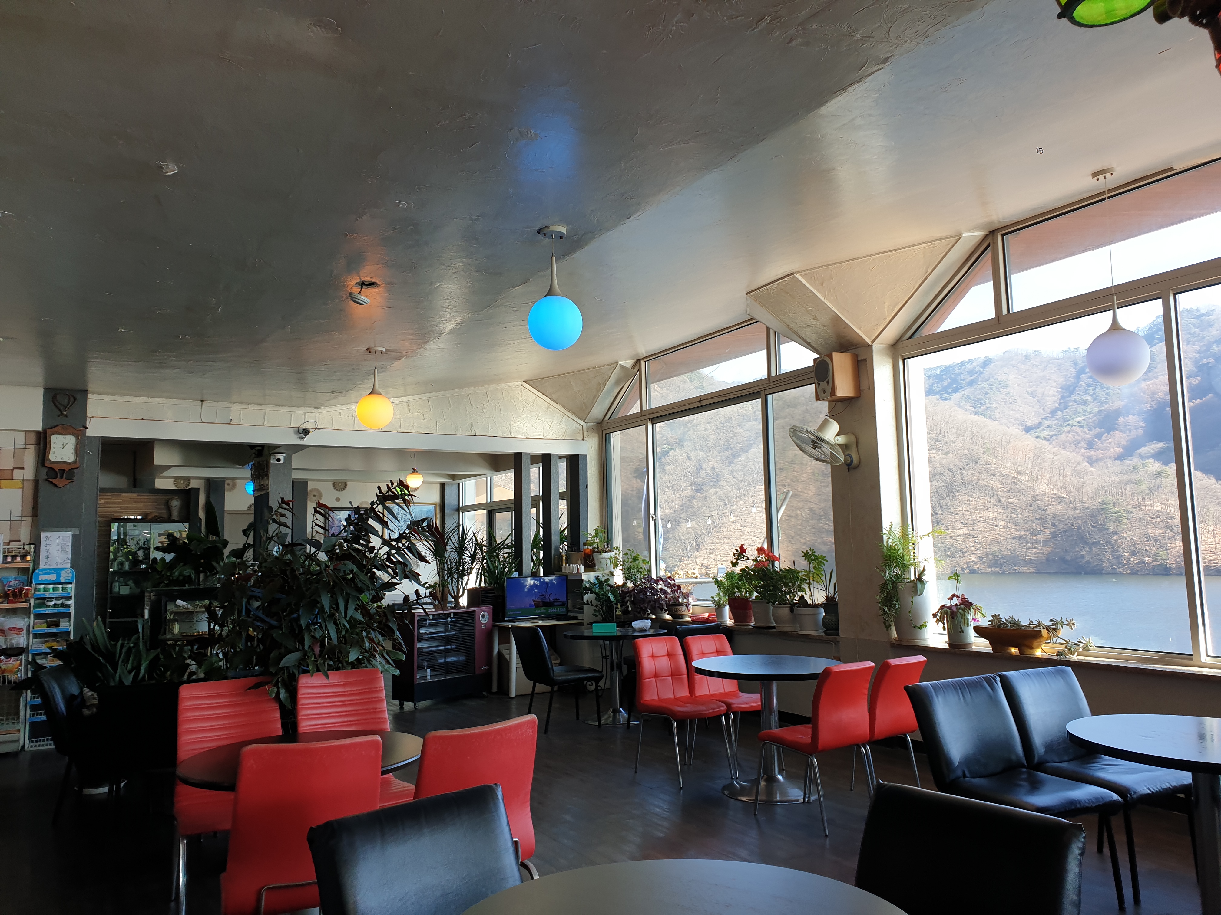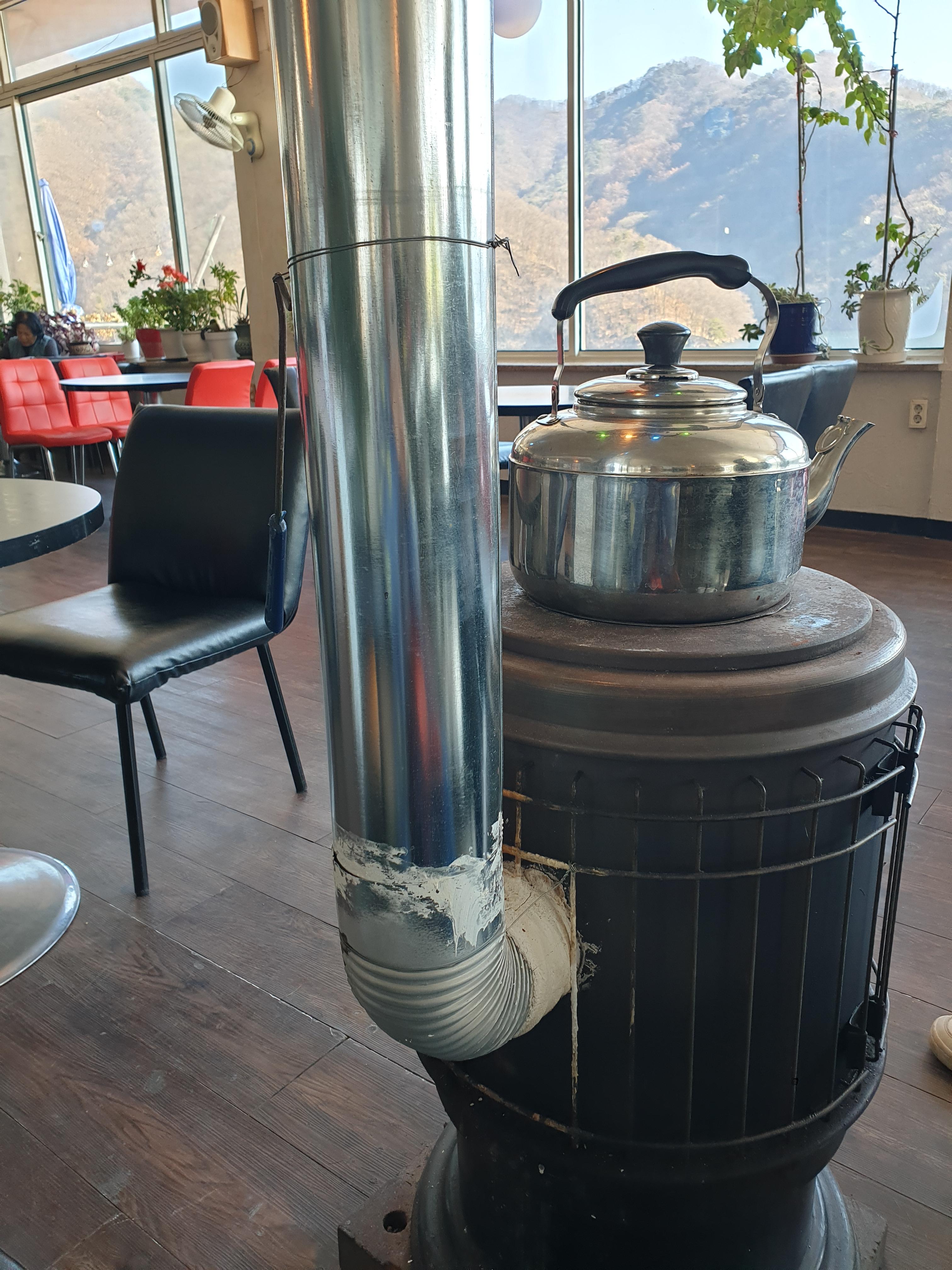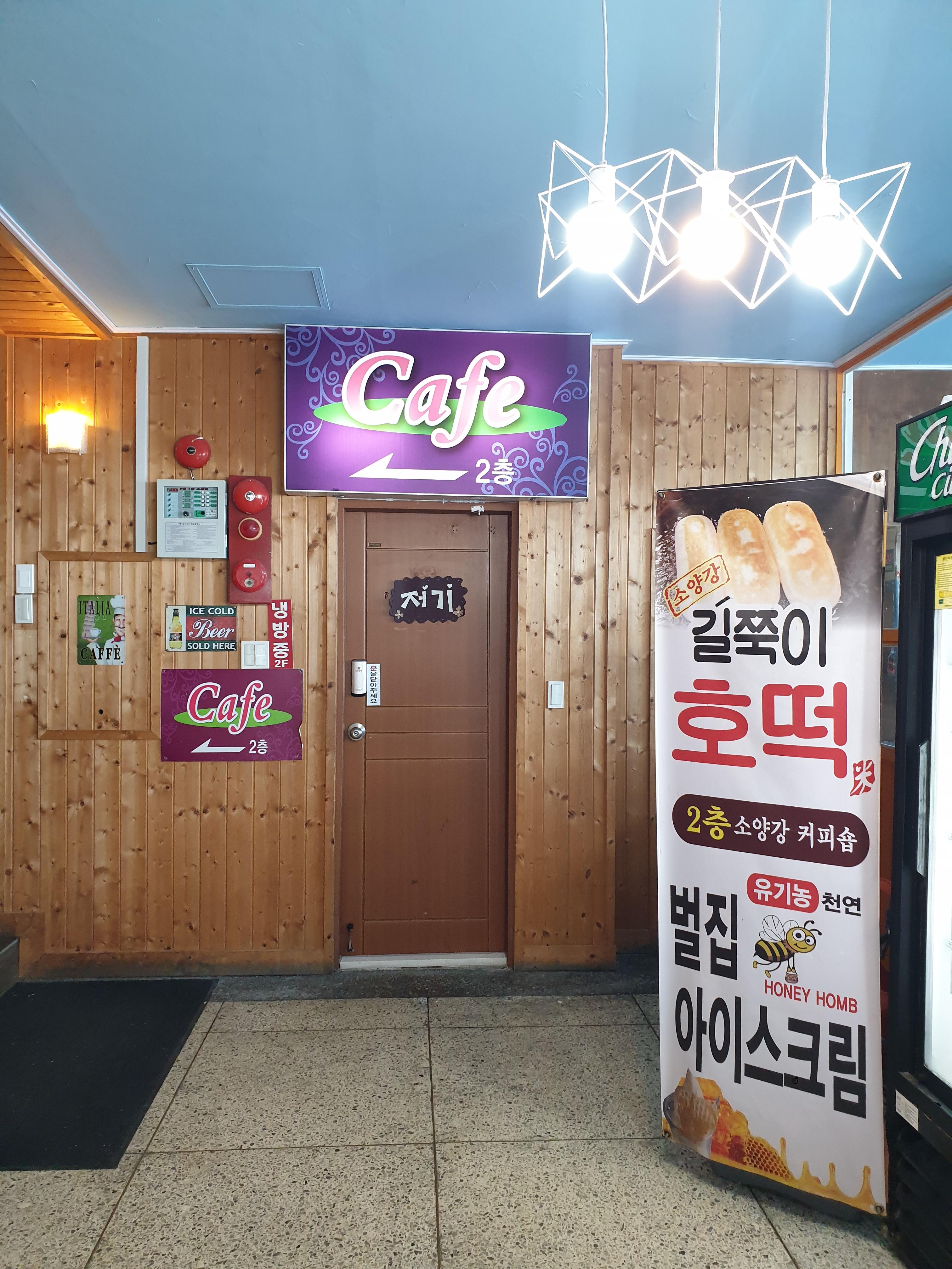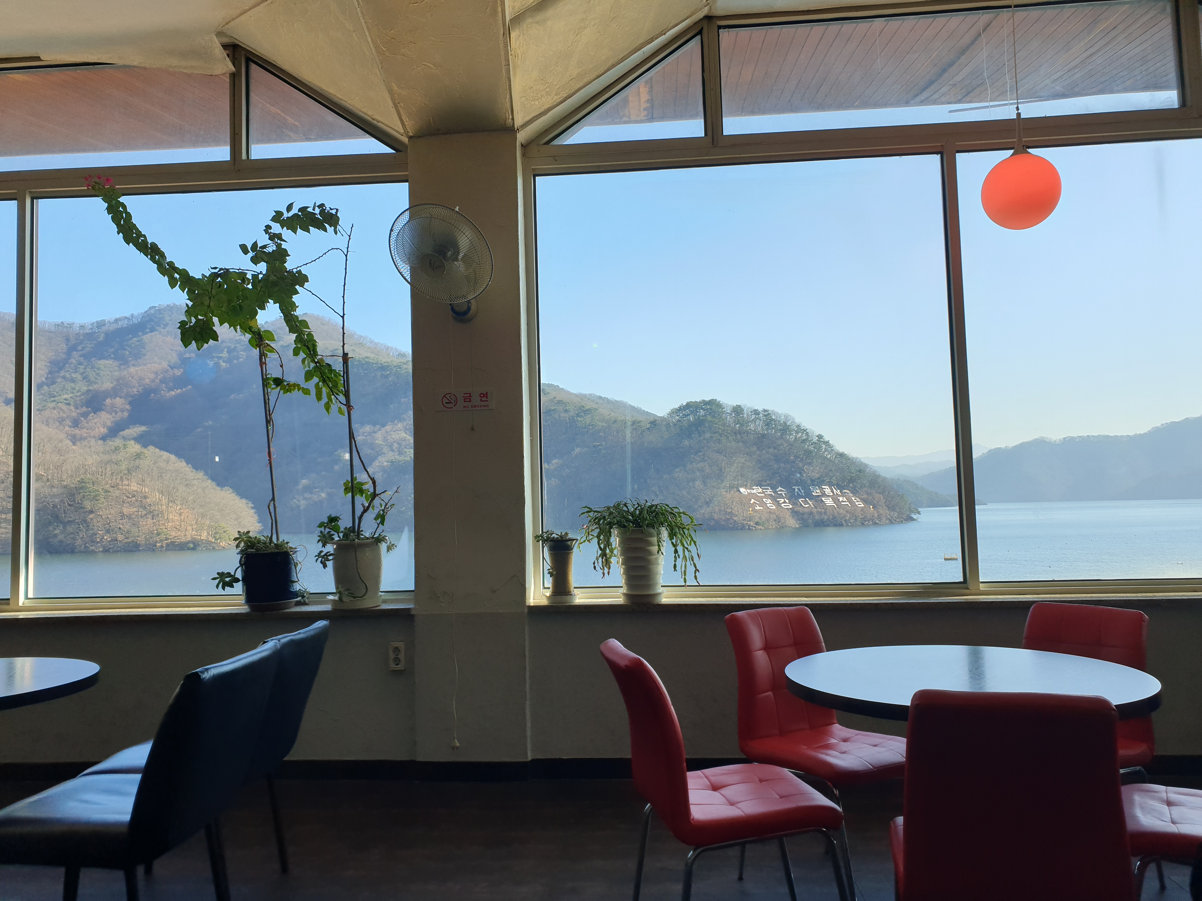 카페 내부는 오래된 다방 느낌이었다. 오래된 소파와 구식 디자인의 의자들이 놓였고 카페 중앙에 난로가 있었다. 그럼에도 소양호가 내려다보이는 전망이 정말 좋았다.