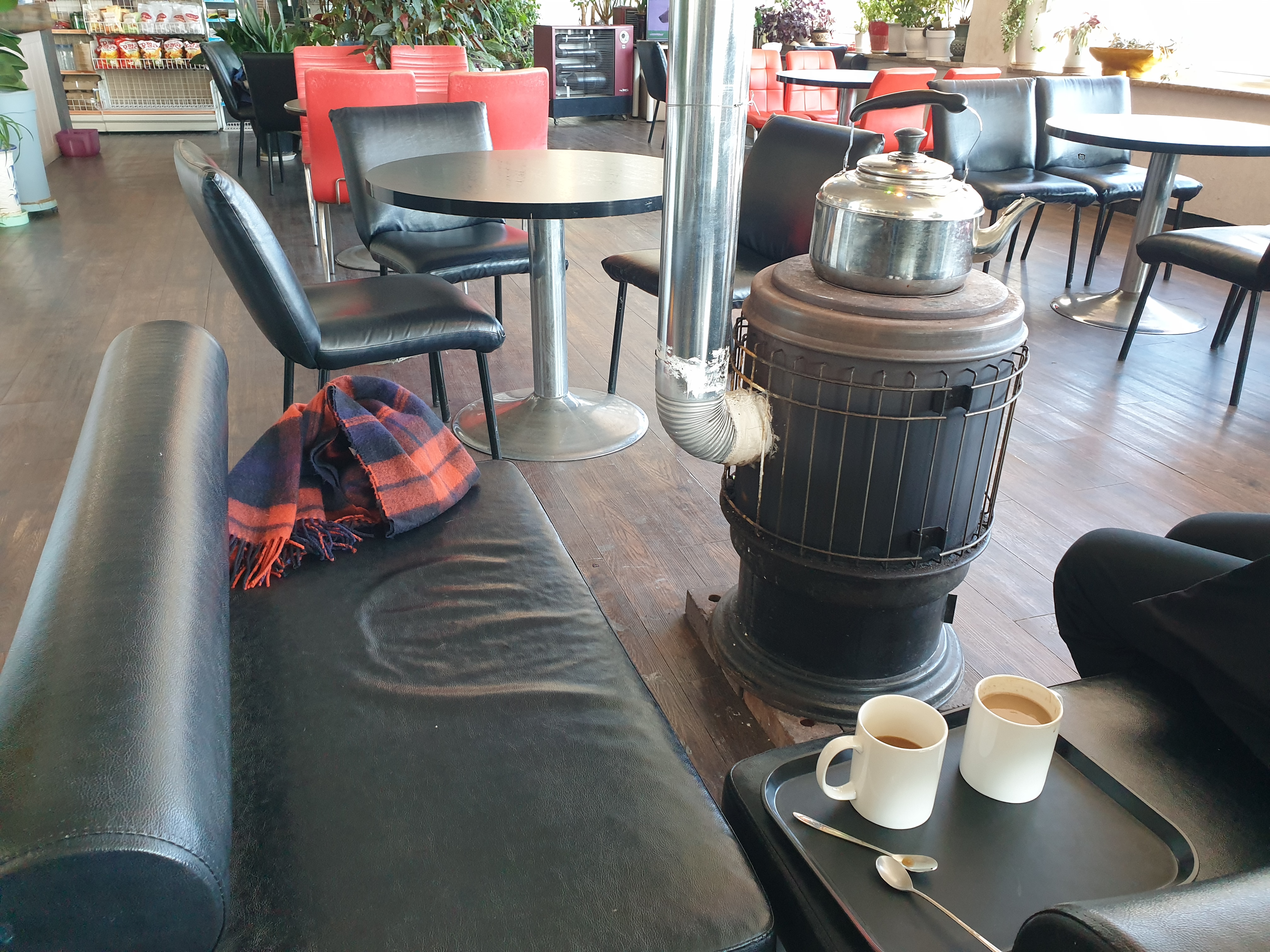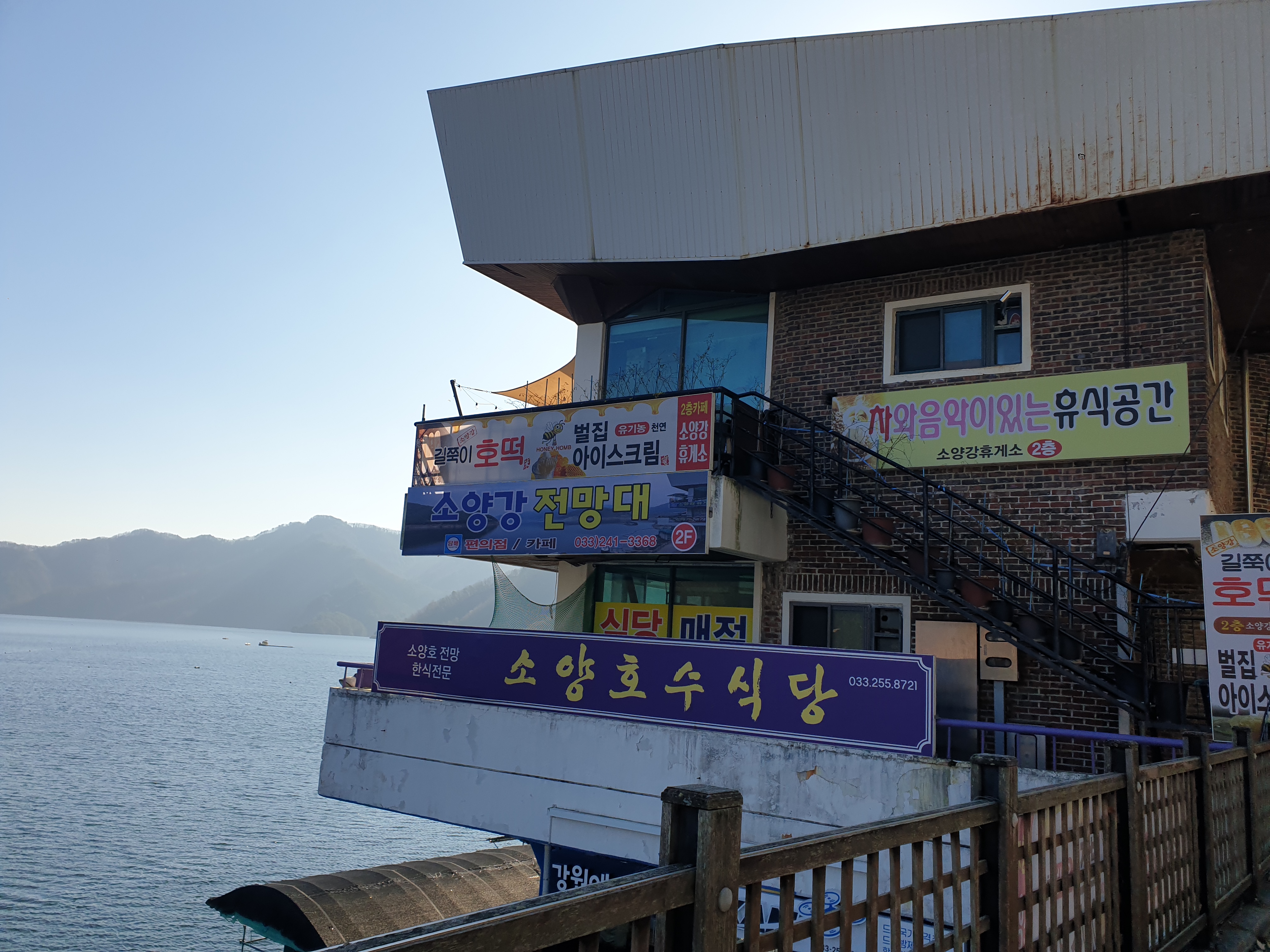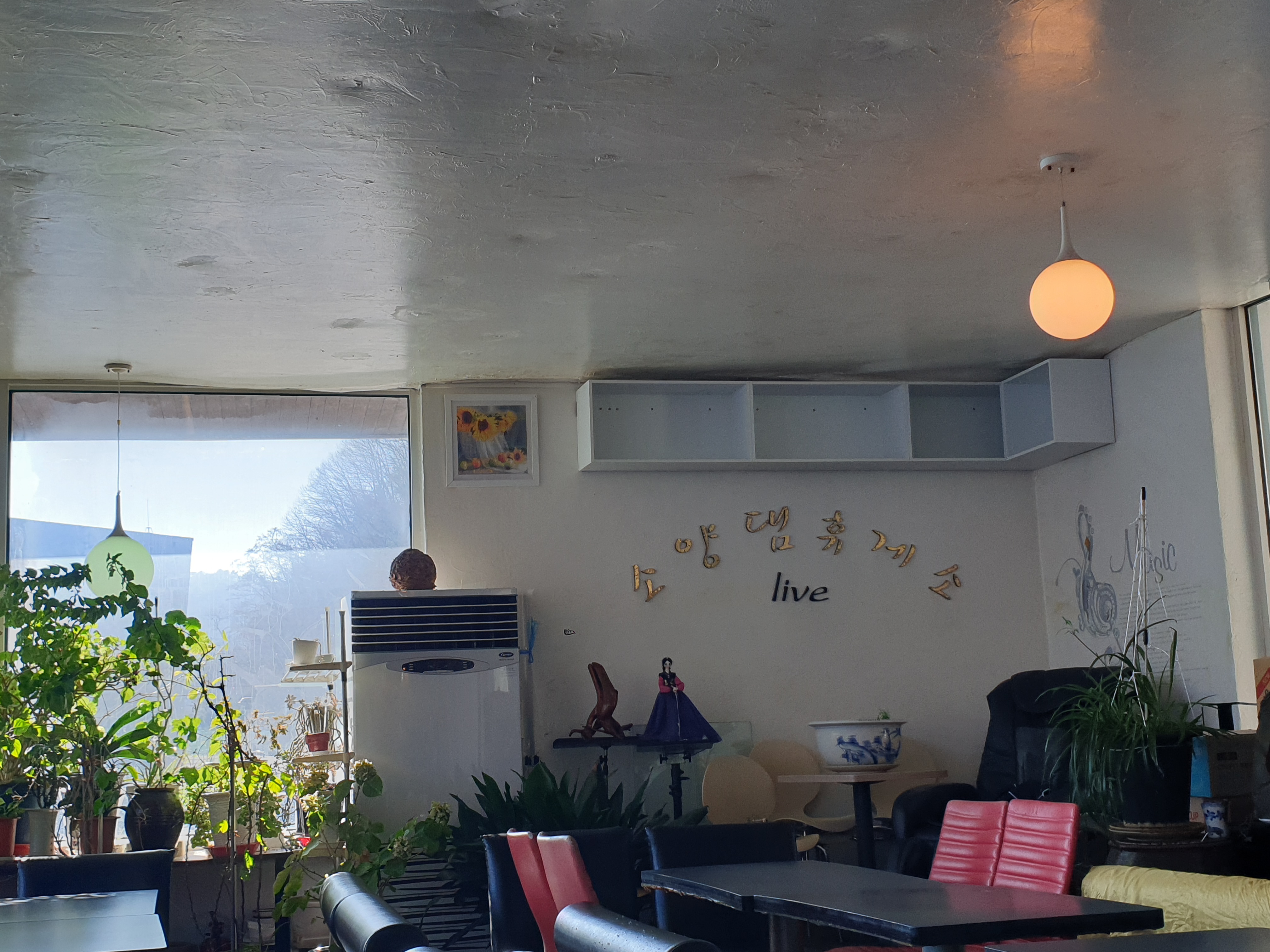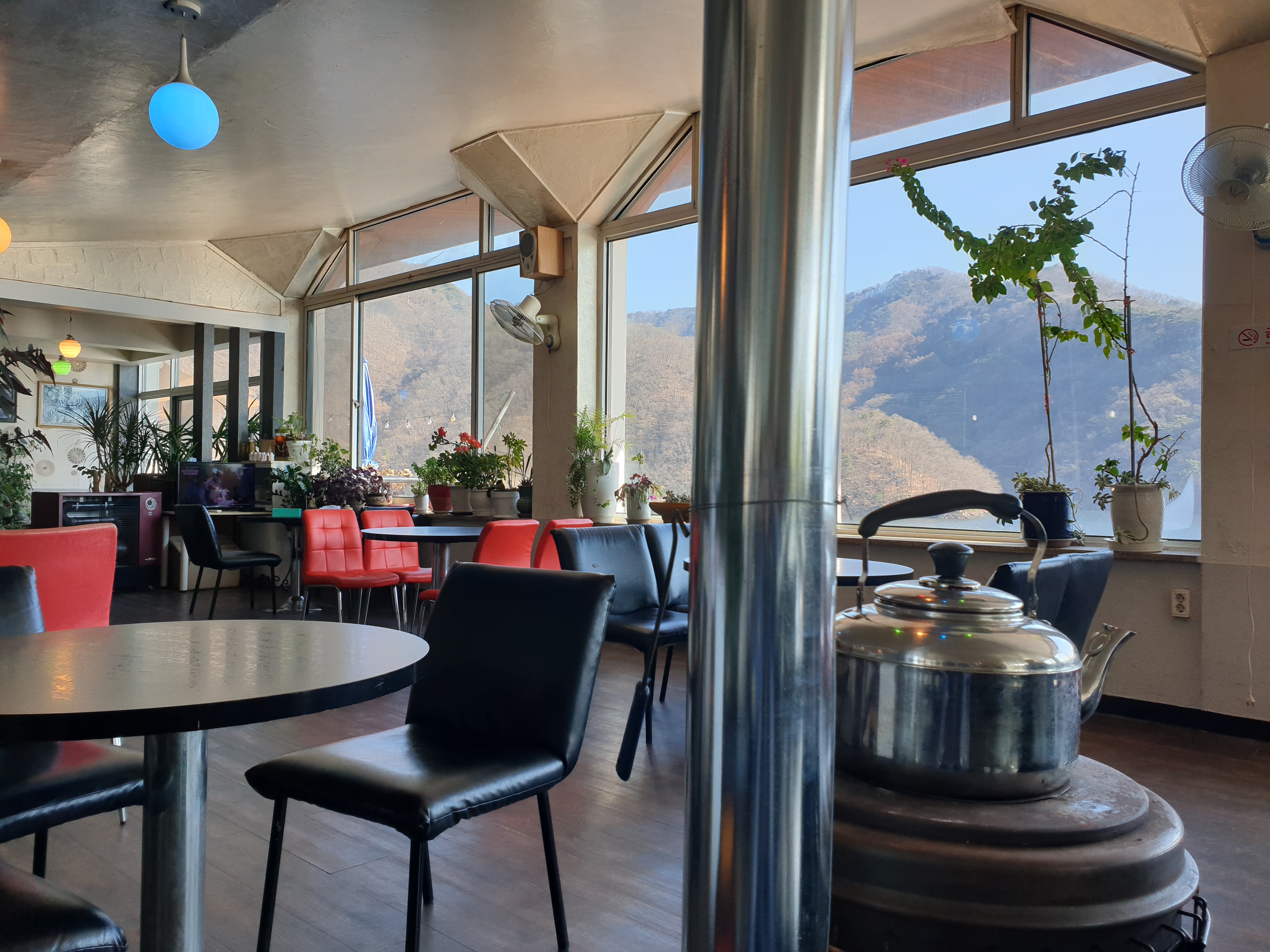카페 내부는 오래된 다방 느낌이었다. 오래된 소파와 구식 디자인의 의자들이 놓였고 카페 중앙에 난로가 있었다. 그럼에도 소양호가 내려다보이는 전망이 정말 좋았다.