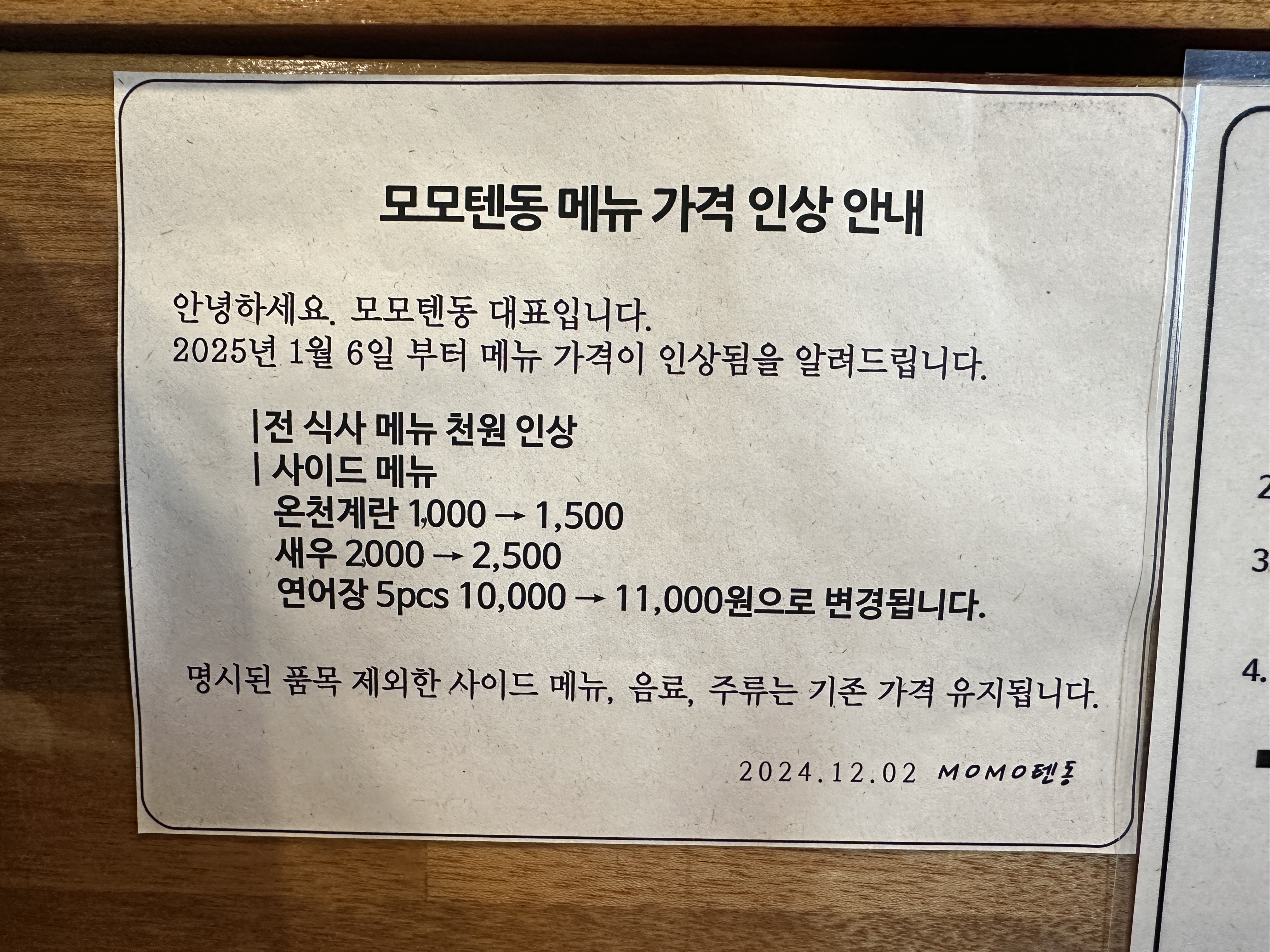 오는 12월 29일부터 1월 5일까지 가게 휴무이고, 이후에 전 메뉴 가격이 천 원씩 인상된다고 한다.