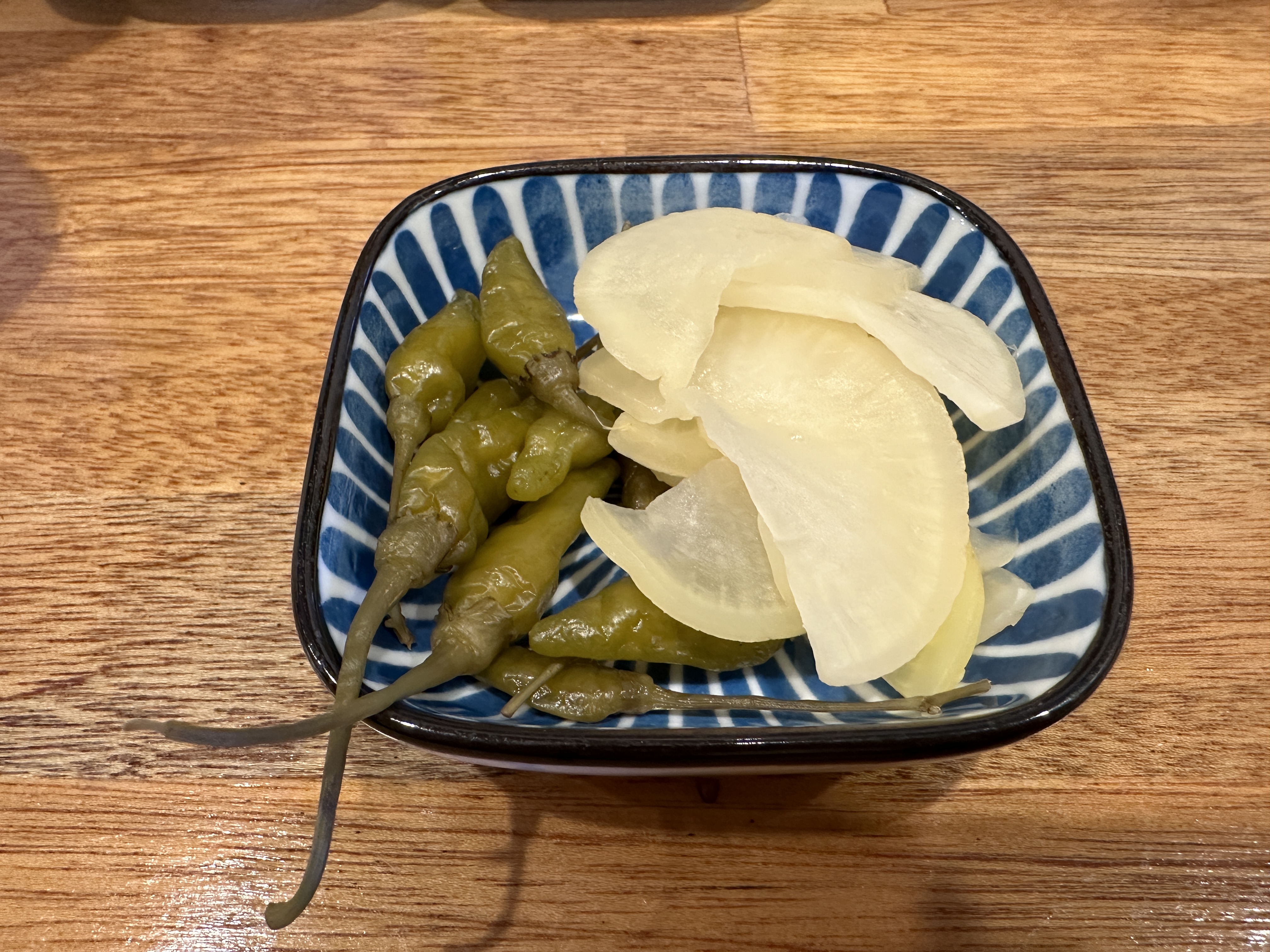 단무지와 산고추를 그릇에 예쁘게 담아놓고 음식이 나오기를 기다리는데