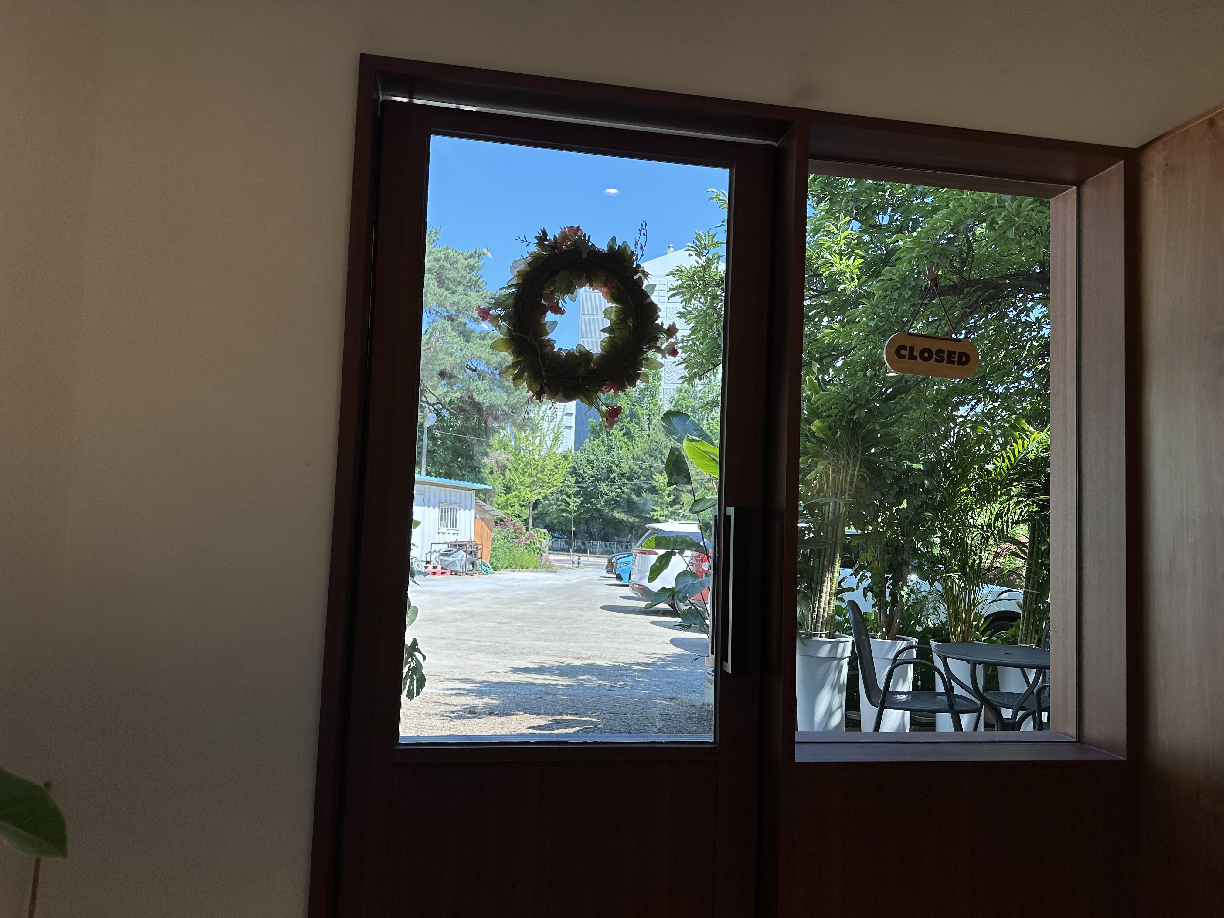카페 앞 주차장에 주차를 하고 입구를 바라본 순간 든 생각은 '싱그럽다'였다. 나무와 식물 화분들로 둘러쌓여 비밀스러운 느낌도 들었다.