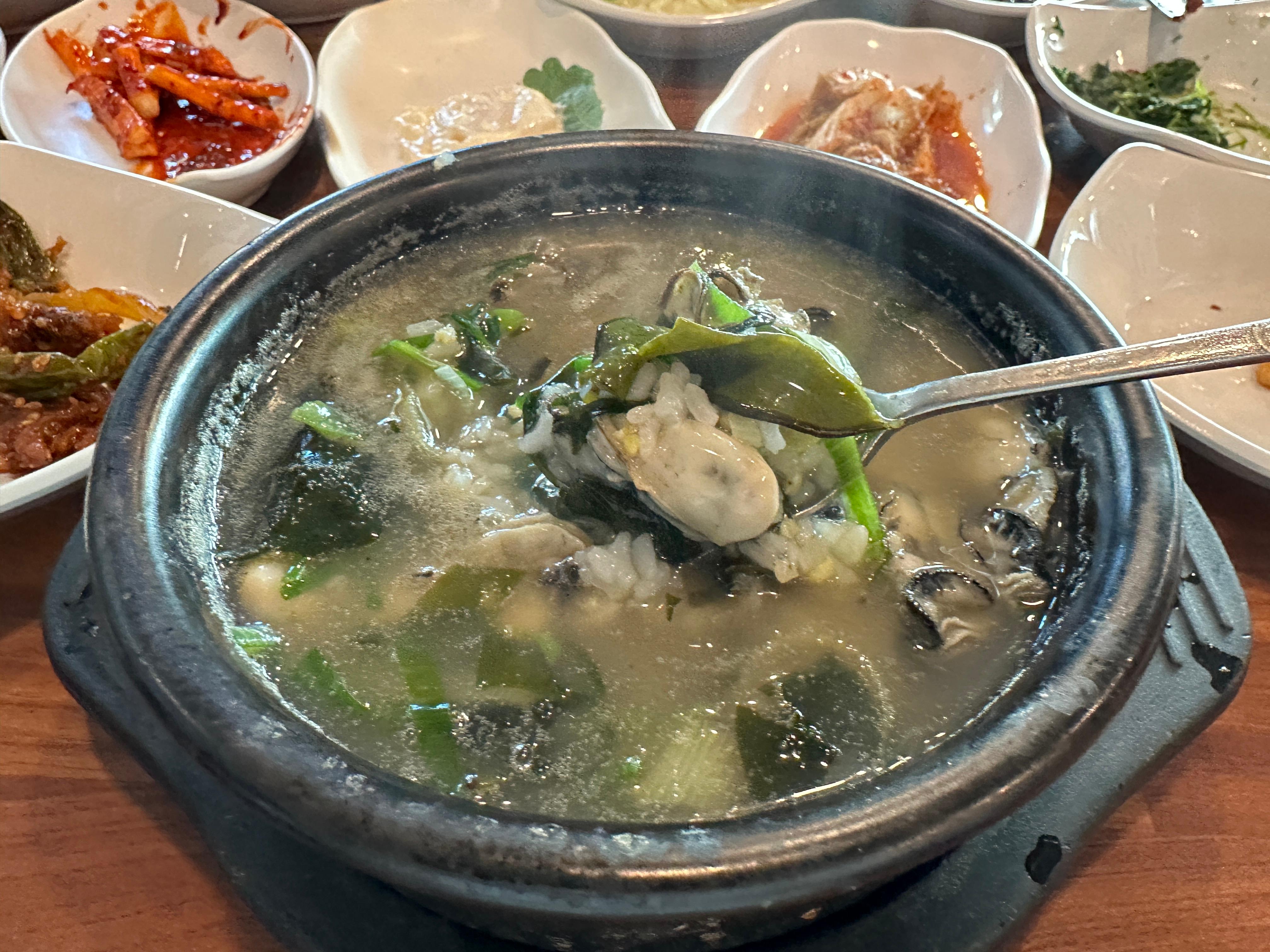 밥은 국밥 안에 들어있다. 굴과 미역, 부추가 꽤 많이 들었다. 매우 뜨거운데 국물이 시원했다. 굴이 정말 많이 들어서 먹어도 먹어도 계속 나왔다. 배가 찢어질것 처럼 부른데도 끝까지 먹었다. 진짜 맛있었다. 1인 14,000원은 적당한 가격이다. 아마 반찬때문에 1인 손님을 받지 않나 싶다. 반찬 저렇게까지 많이 안줘도 되니까 1인 손님도 받아주면 참 좋겠다.
