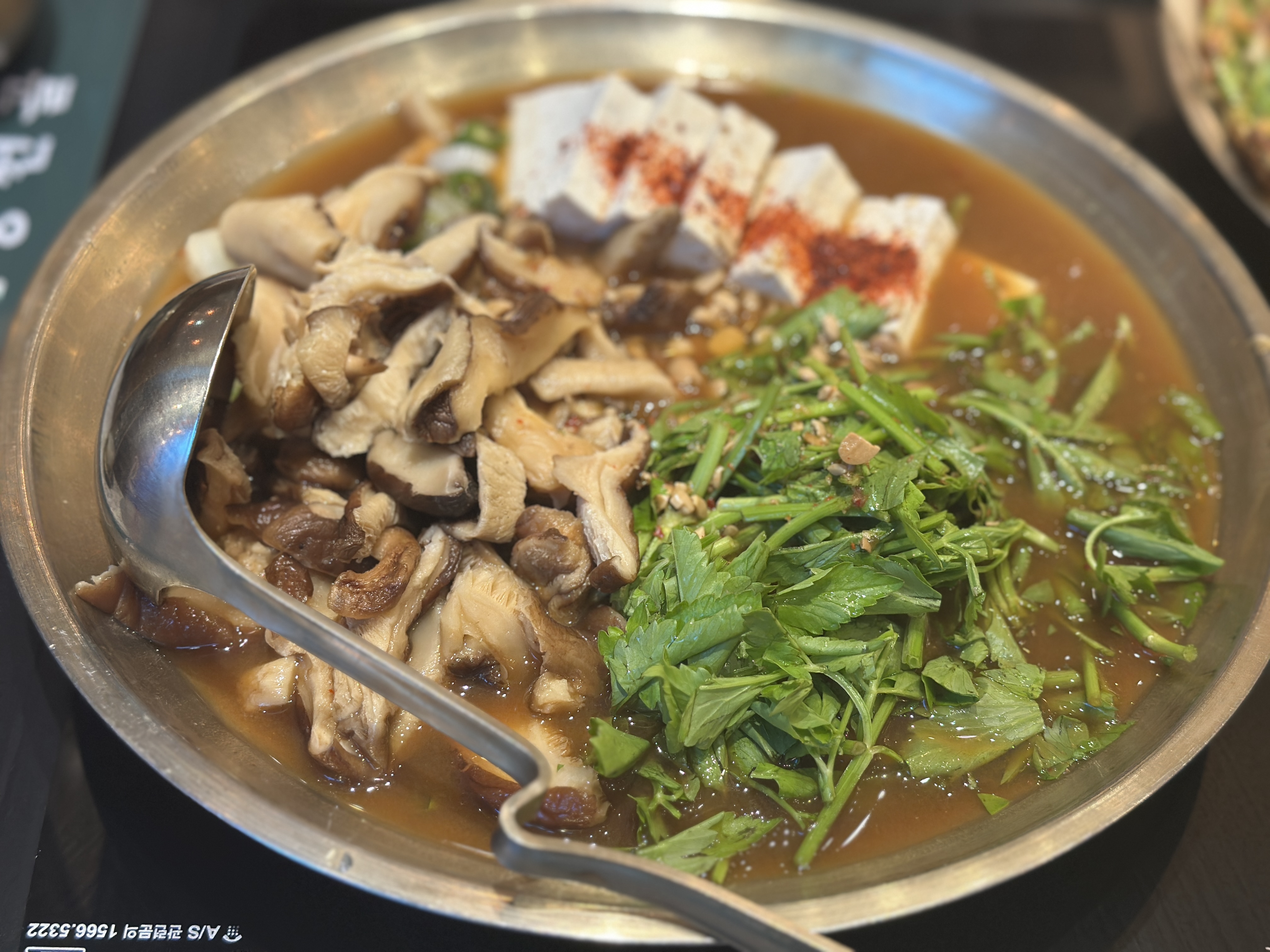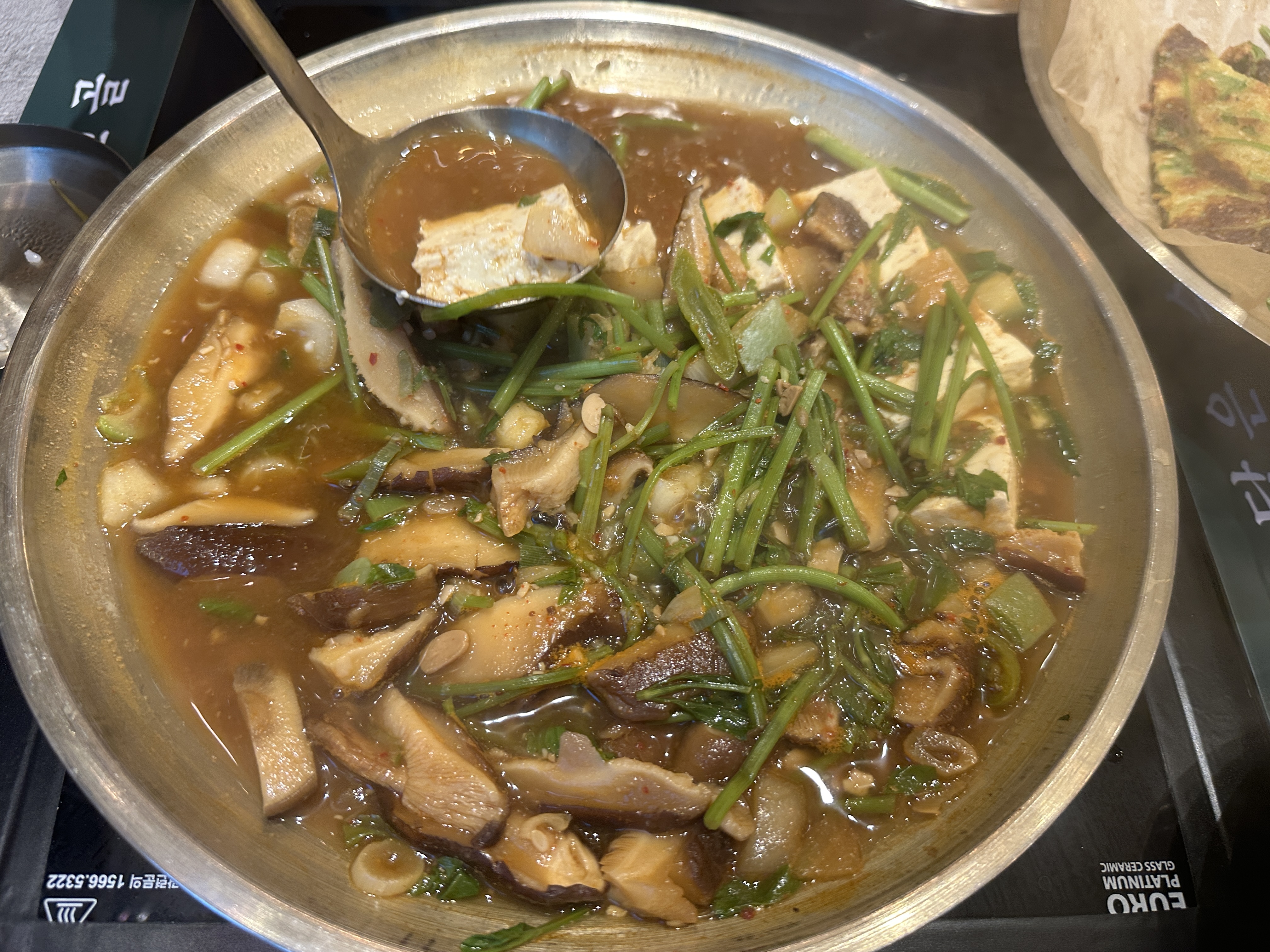 이전 방문시에는 소고기삼겹 된장전골을 먹었었는데 고기가 푸짐하고 맛있었다. 이번에는 저녁이고 좀 가볍게(?) 먹고 싶어서 표고버섯된장전골을 주문했다. 그리고 신메뉴인 보리새우전이 생겼길래 주문해 보았다. 보리새우전은 인스타그램 업로드하면 50%할인이라고 해서 이벤트에 참여했다.
