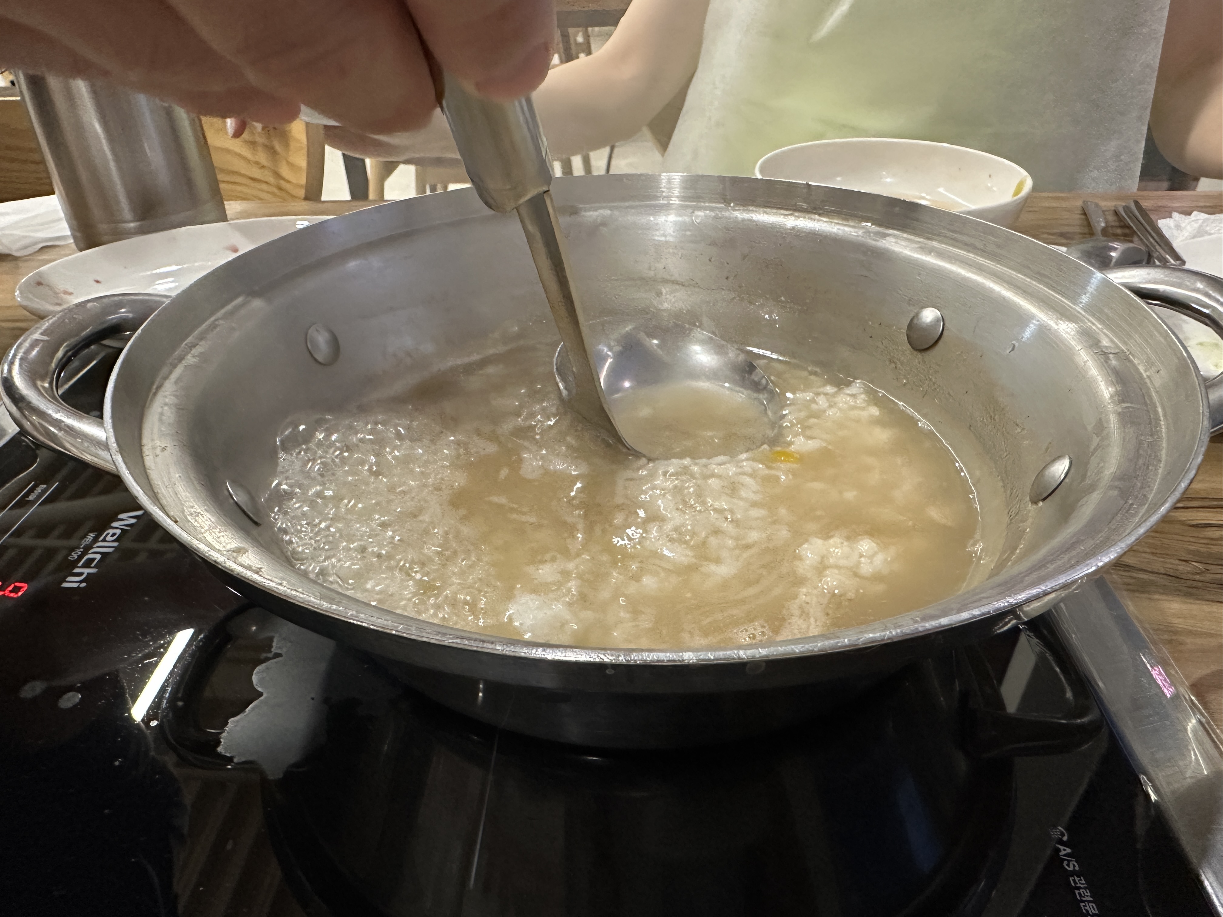 마지막에는 계란·밥·김 가루 넣고 죽까지 만들어 먹었습니다. 배가 불러도 맛있어서 싹싹 긁어먹었어요.