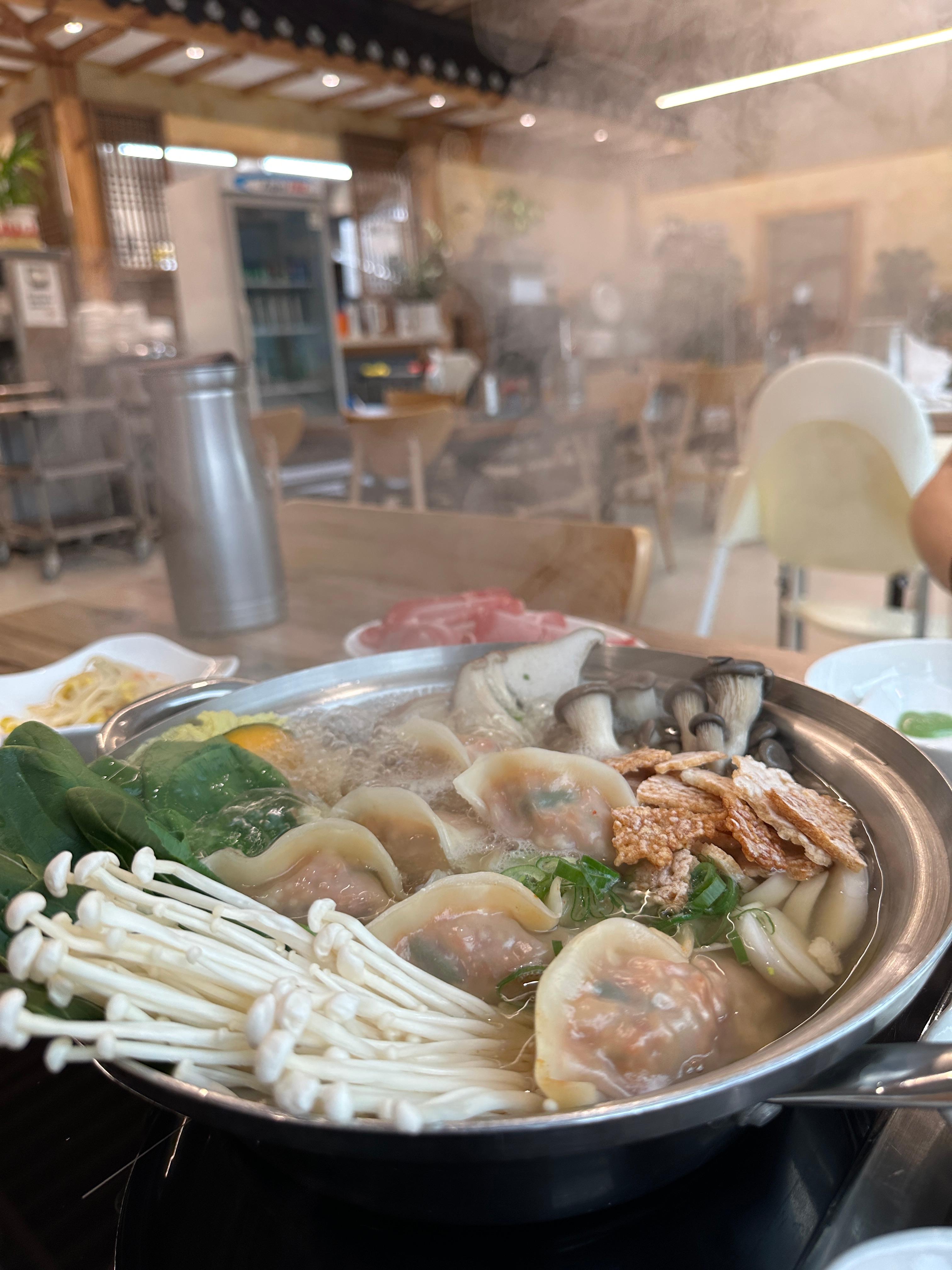 당일 빚은 김치만두가 듬뿍 들어간 전골이에요. 채소, 떡, 버섯, 청경채까지 한가득!