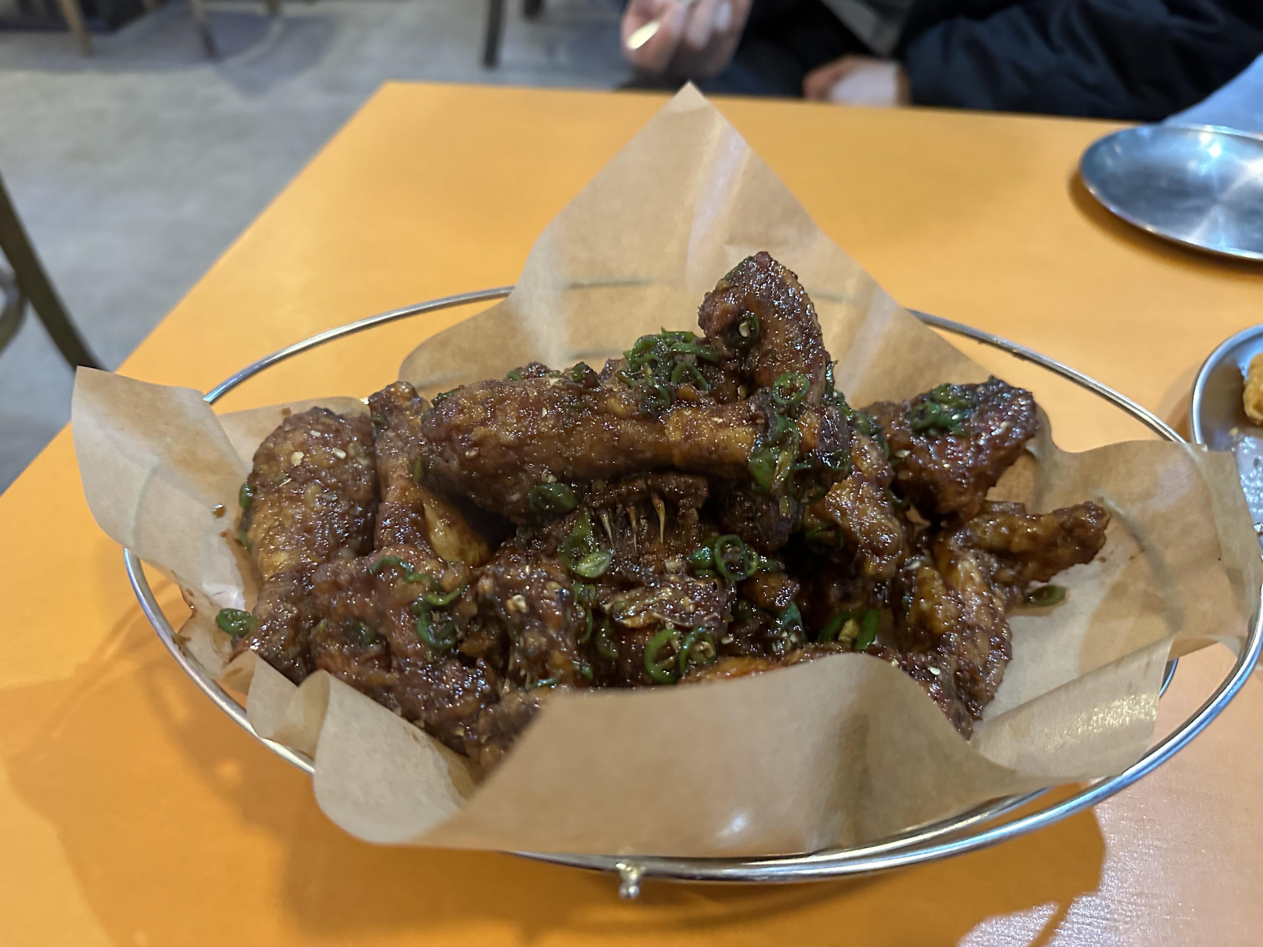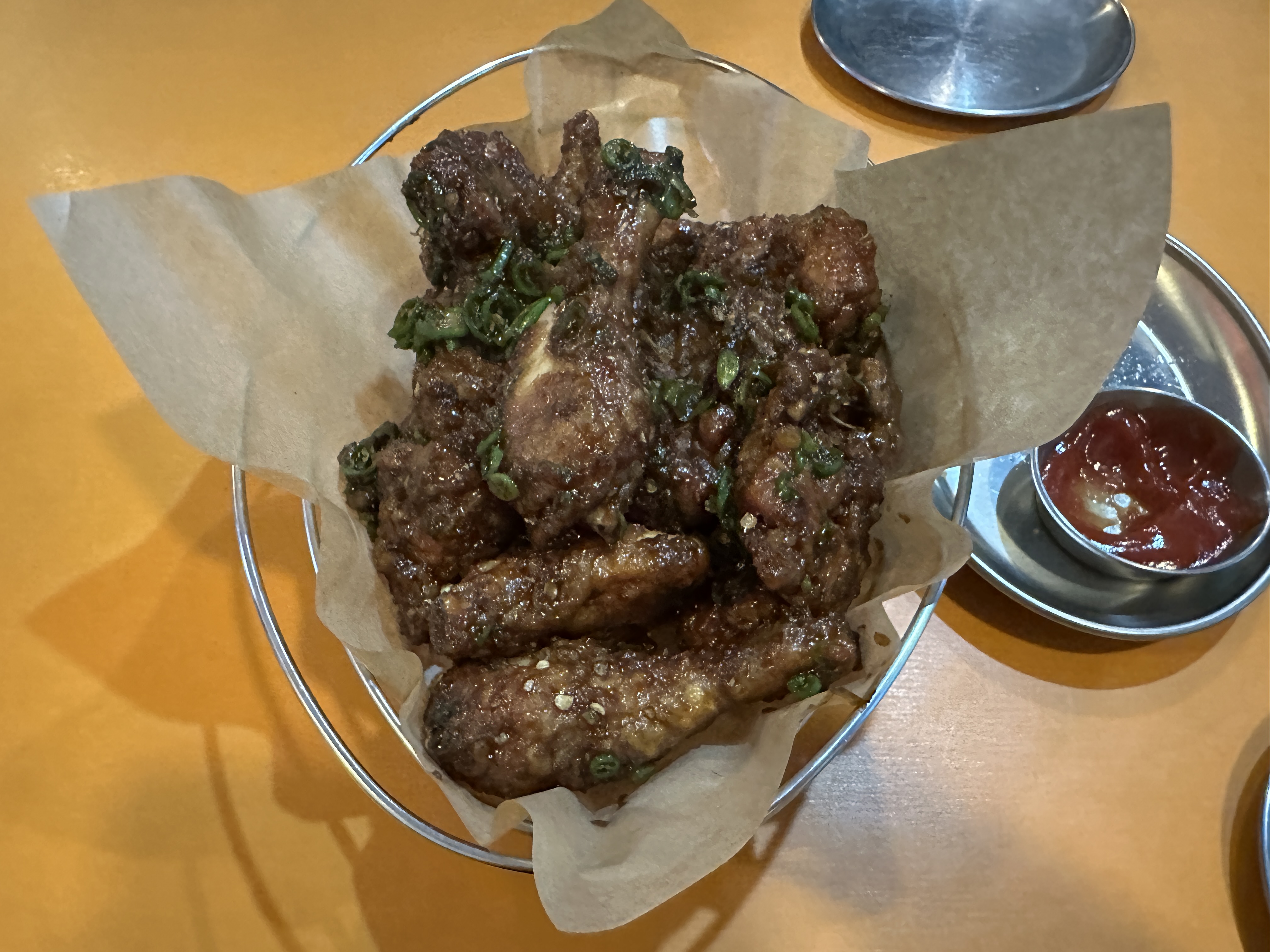 치킨이 나오기 전, 감자튀김 서비스가 나왔다. 갓 튀겨내 따뜻했다. 간장치킨은 간장양념과 청양고추가 듬뿍 묻혀 나왔다. 왜인지 전에 픽업해서 먹었을 때만큼 바삭하지는 않았는데 양념을 듬뿍 발랐기 때문인 듯했다. 그래도 확실히 맛집은 맛집이었다. 흔히 먹어 본 양념이 아니었다.