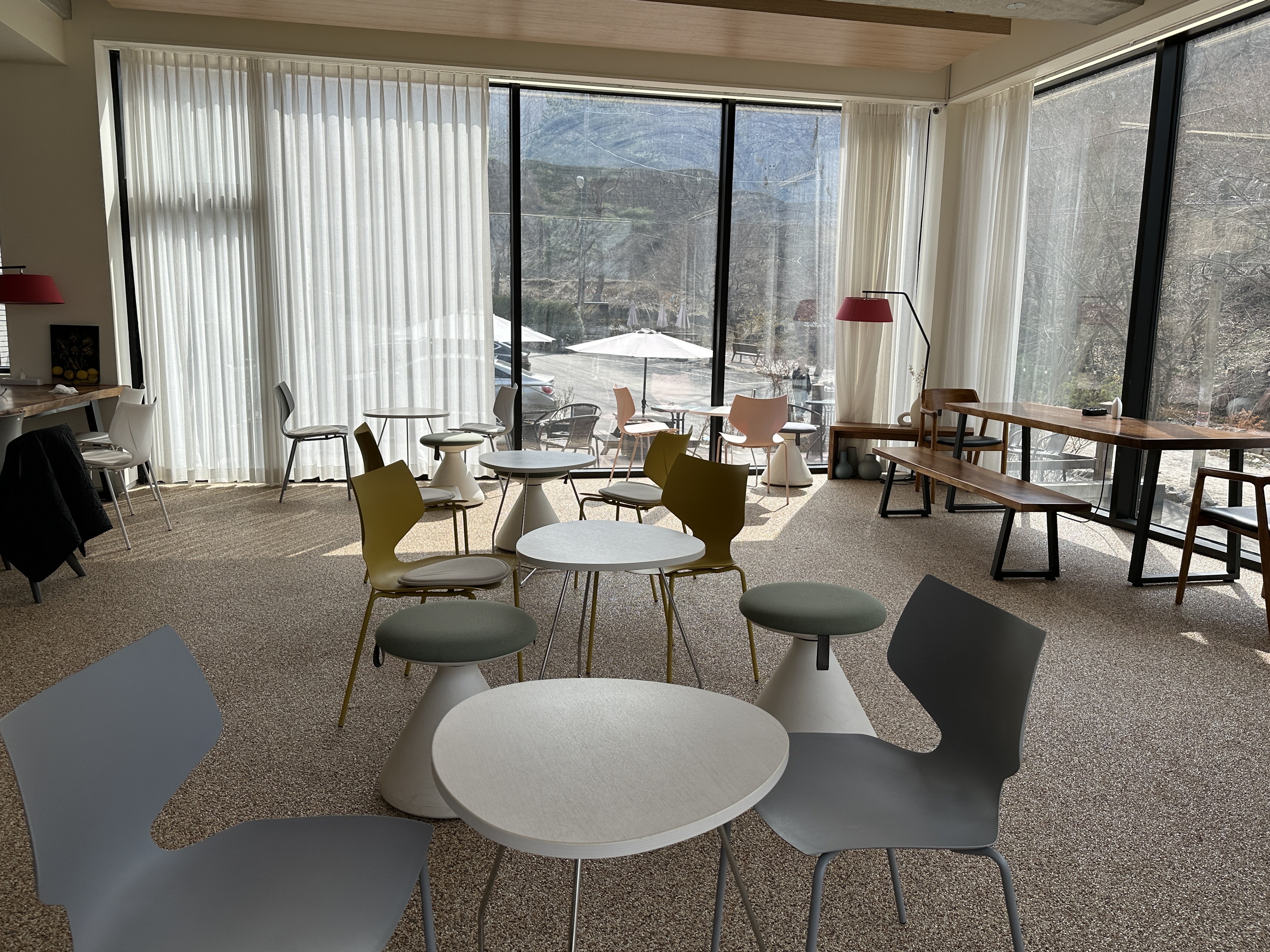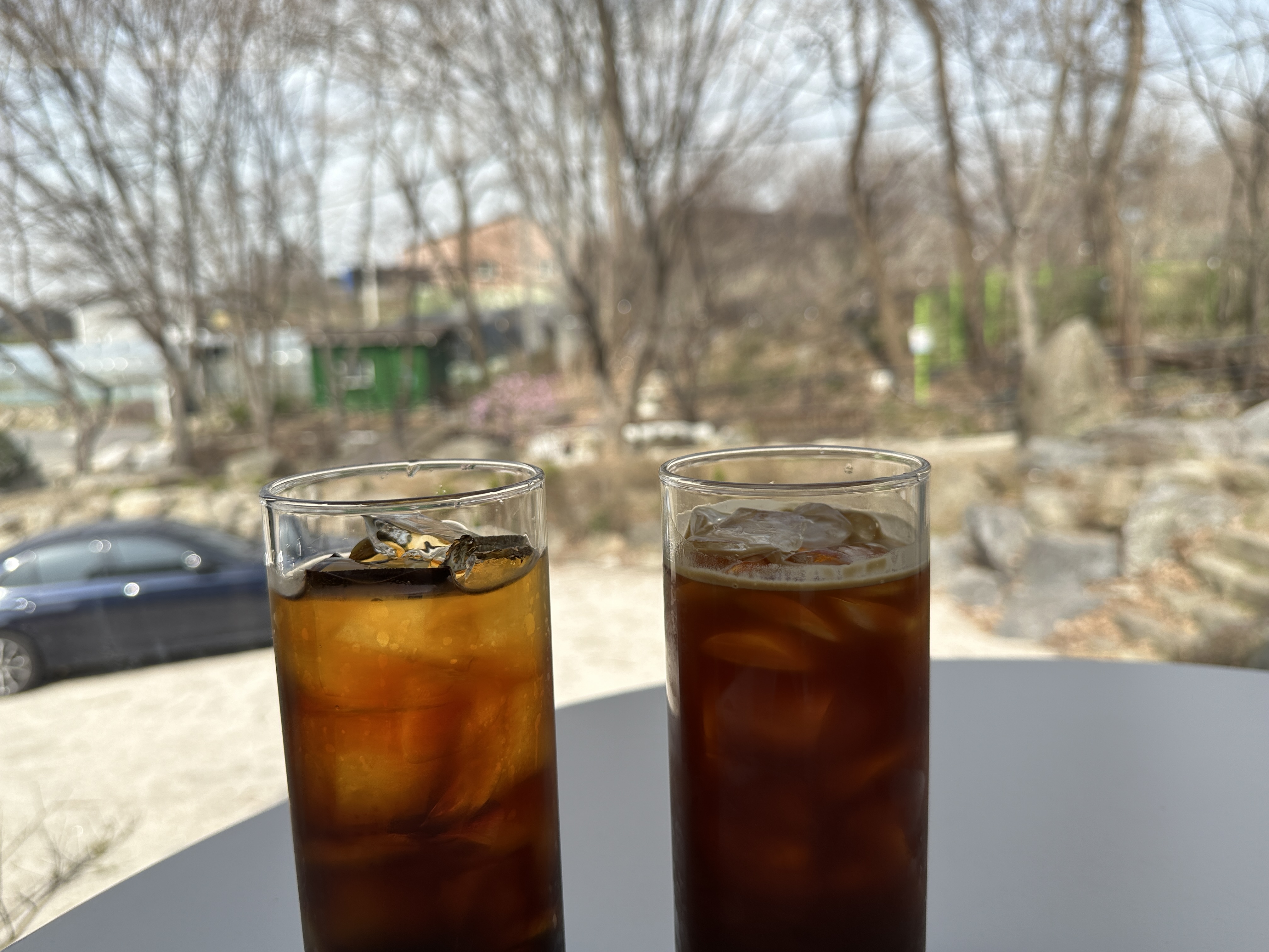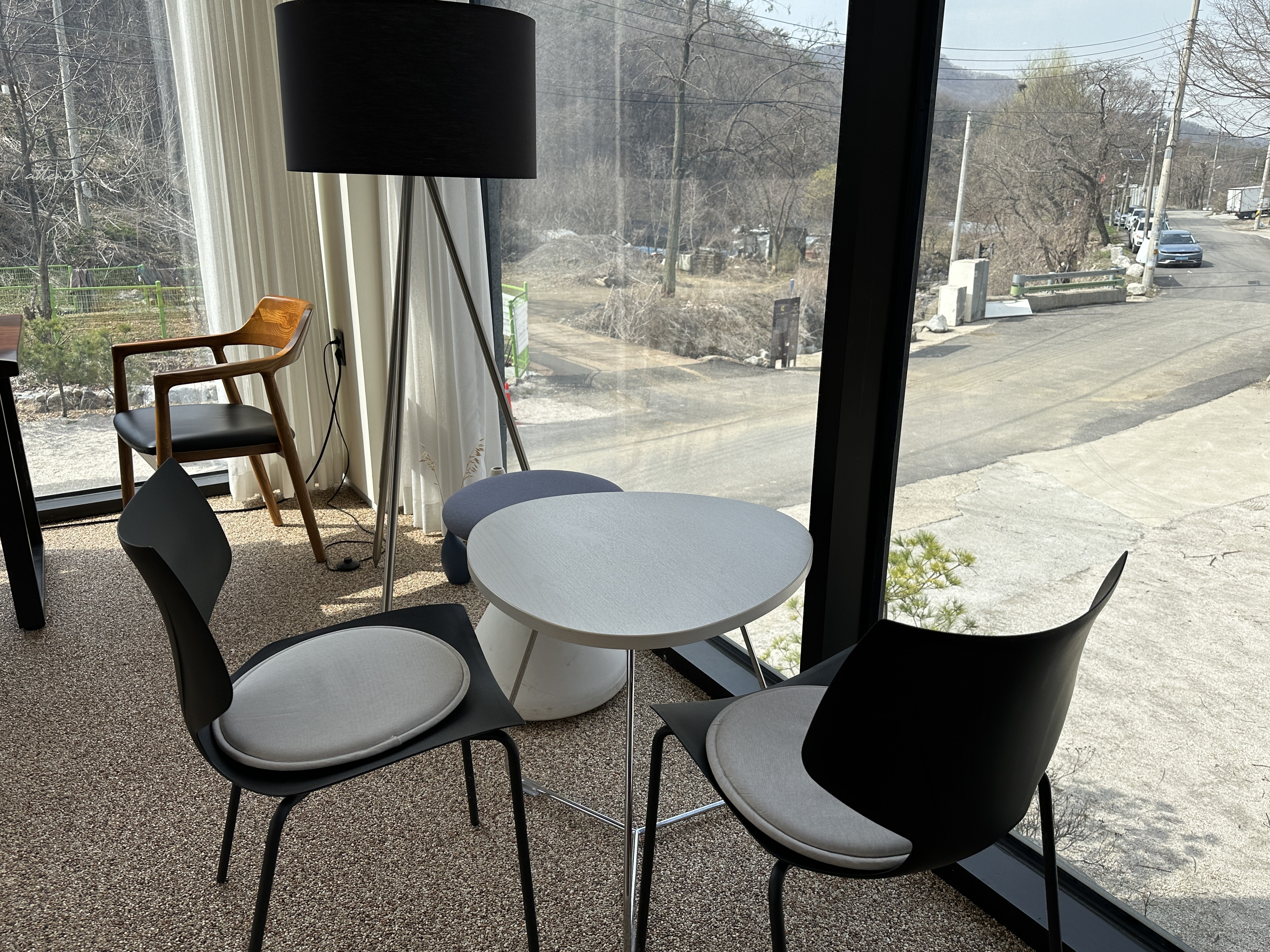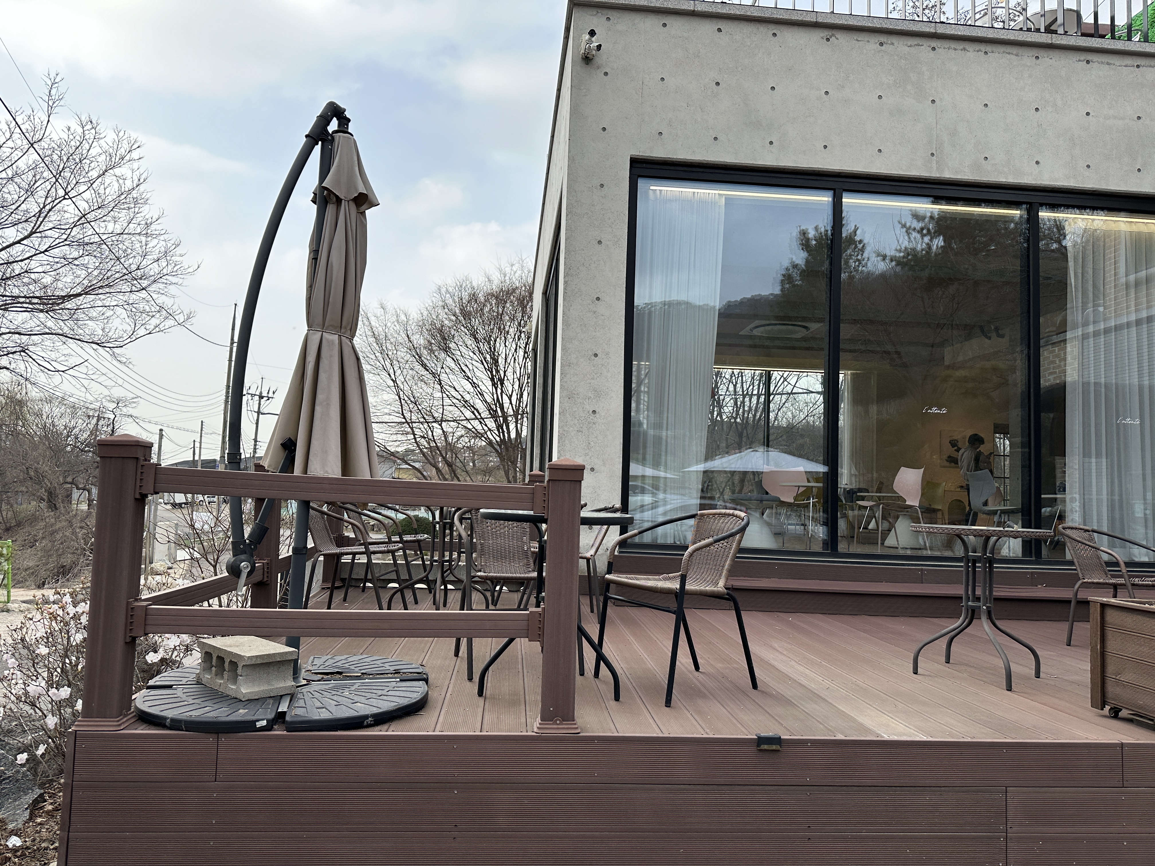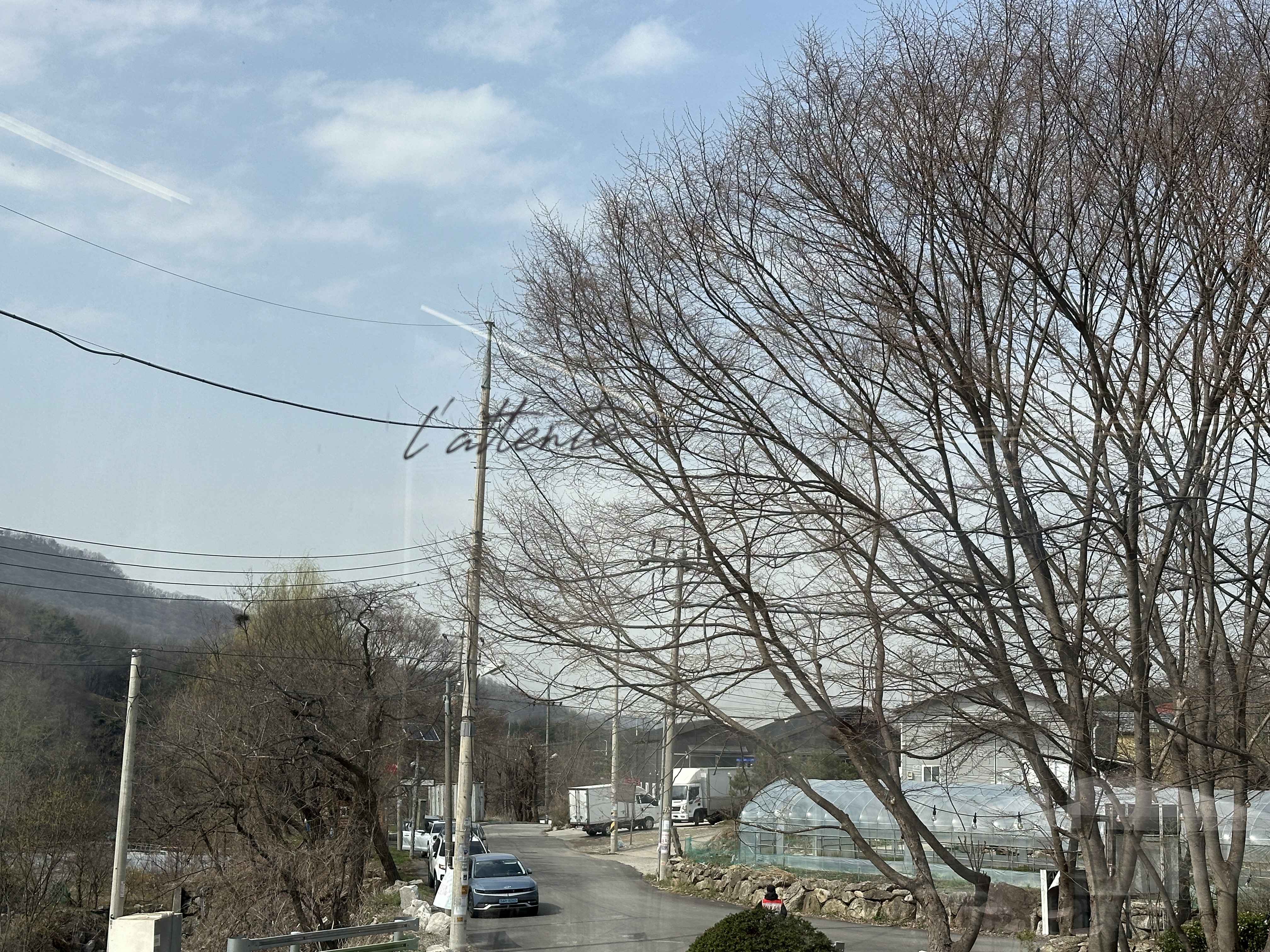 내가 방문했을때는 늦겨울이어서 (3월 말) 아직 밖의 산과 들의 나무들이 앙상하고 거뭇했다. 지금 가면 초록초록하고 예쁜 풍경을 볼 수 있을 것 같다. 아마 여름으로 갈수록 더 좋을 듯. 산과 나무, 산책로, 계곡도 있고 카페 앞 계곡 쪽에도 앉을 수 있는 야외 테이블이 많이 있었다.