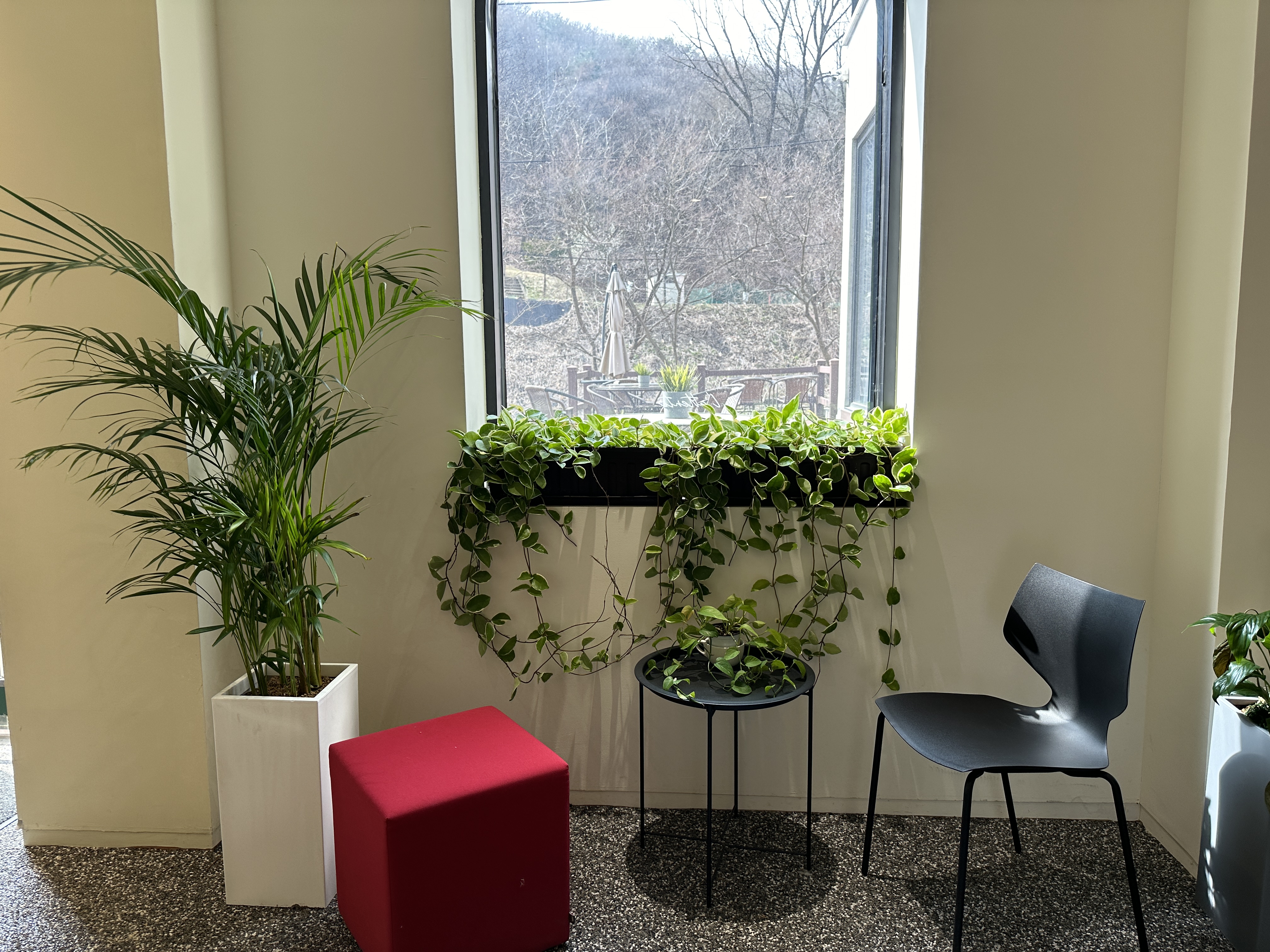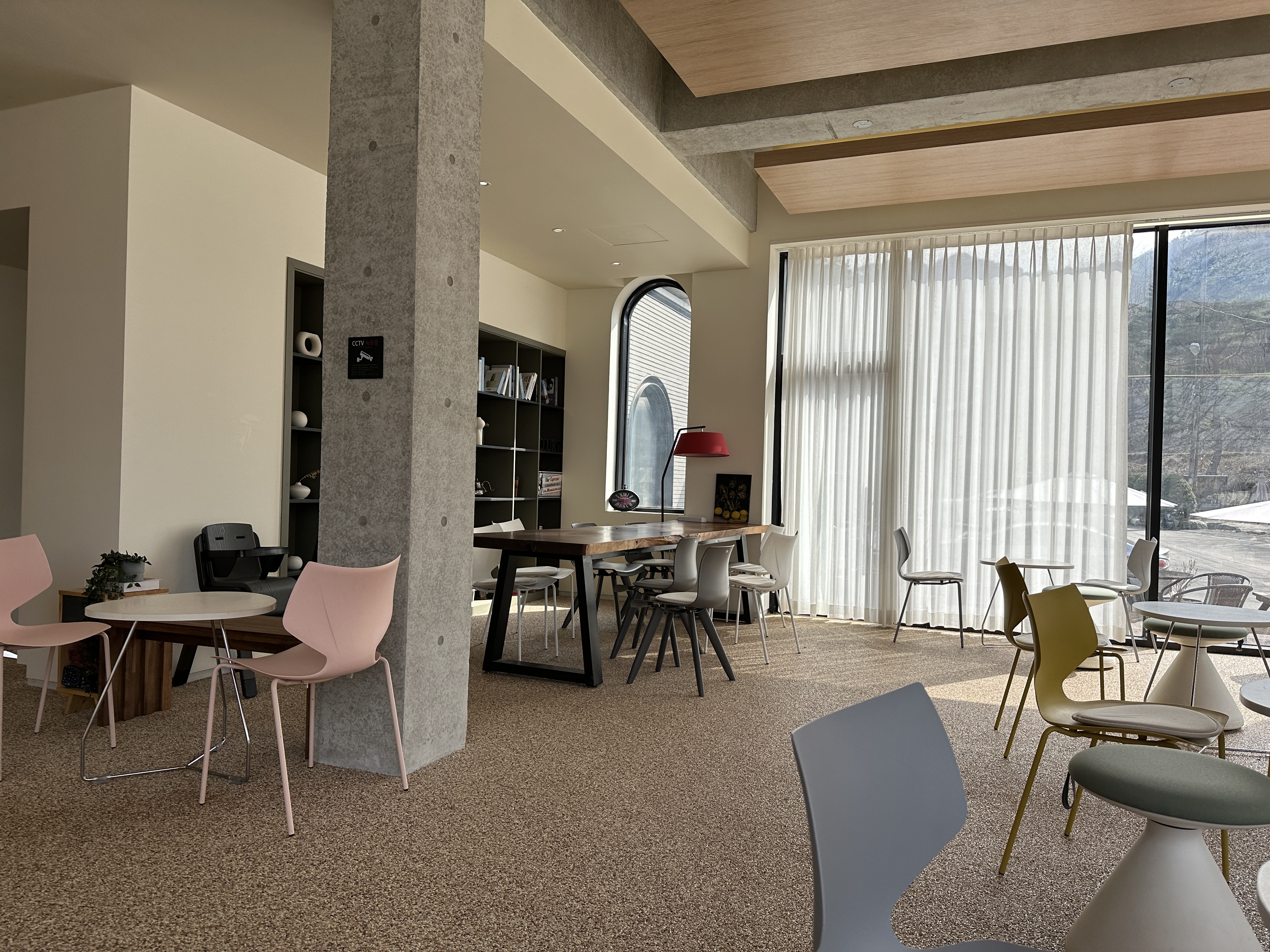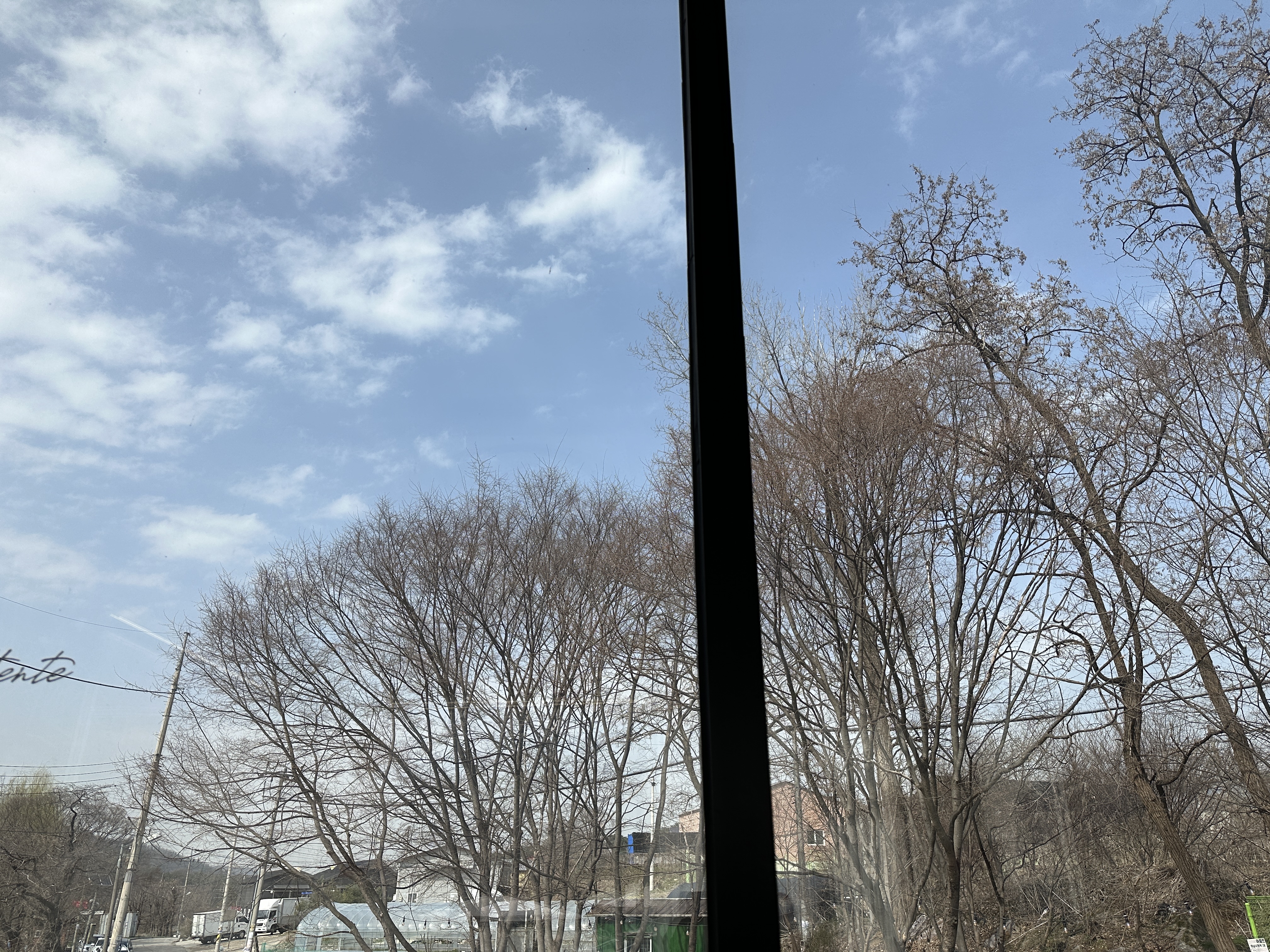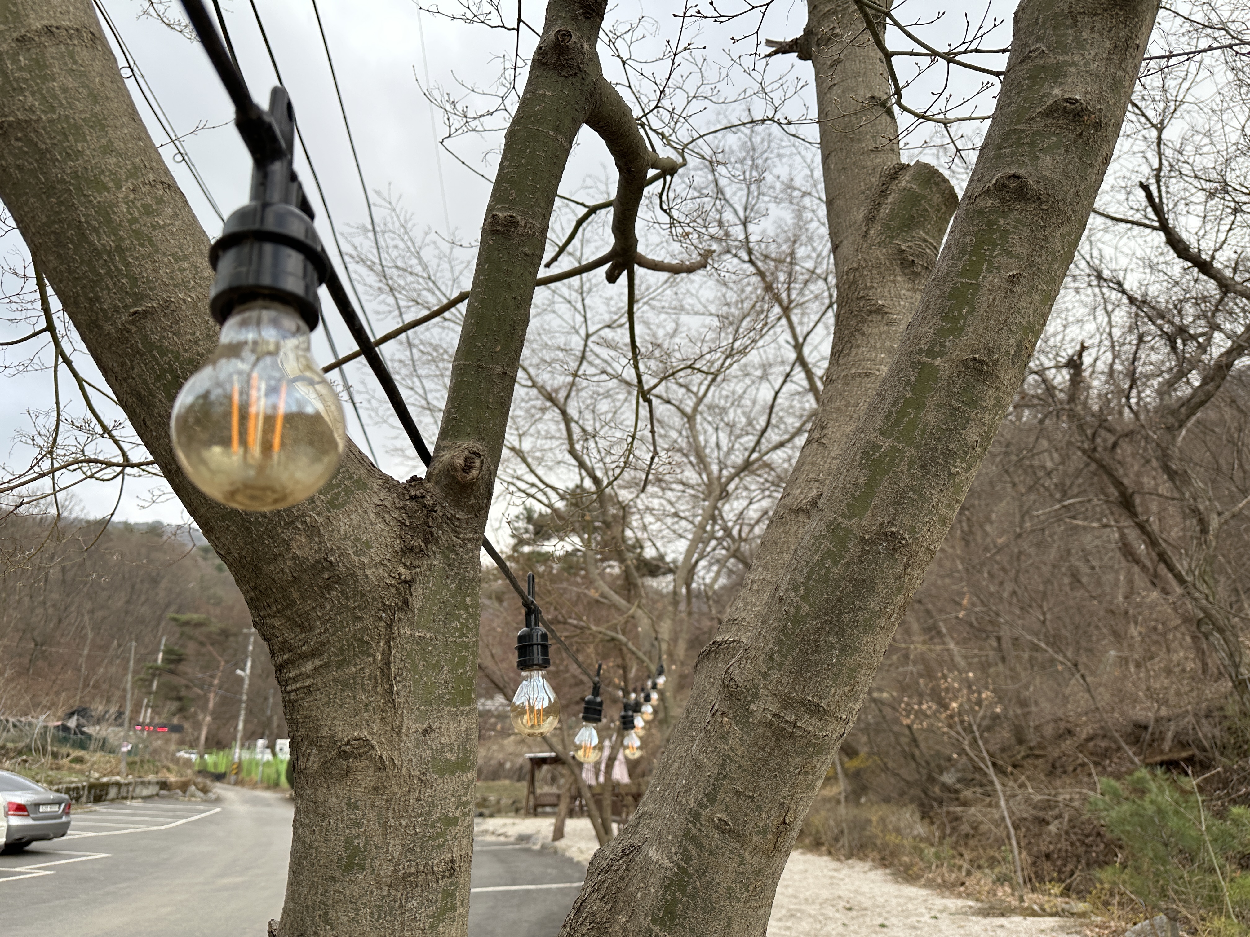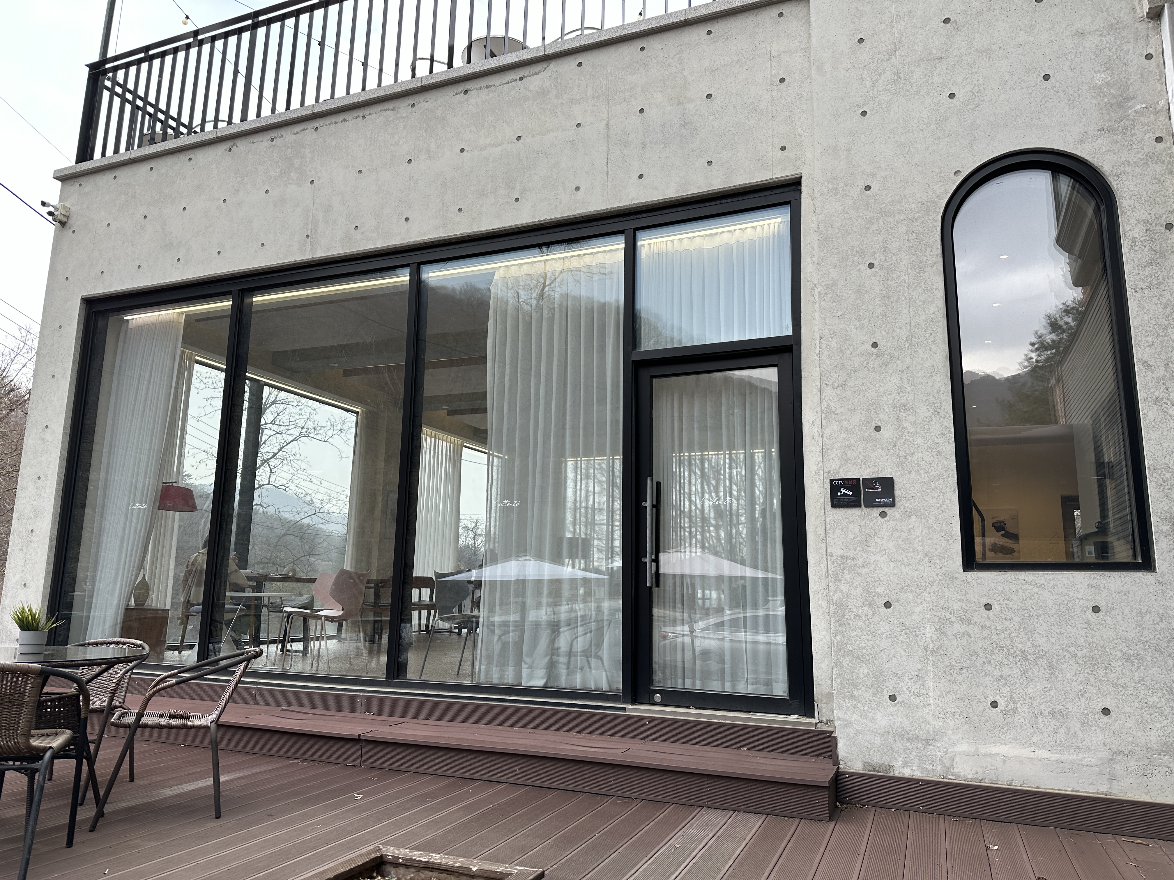 내가 방문했을때는 늦겨울이어서 (3월 말) 아직 밖의 산과 들의 나무들이 앙상하고 거뭇했다. 지금 가면 초록초록하고 예쁜 풍경을 볼 수 있을 것 같다. 아마 여름으로 갈수록 더 좋을 듯. 산과 나무, 산책로, 계곡도 있고 카페 앞 계곡 쪽에도 앉을 수 있는 야외 테이블이 많이 있었다.