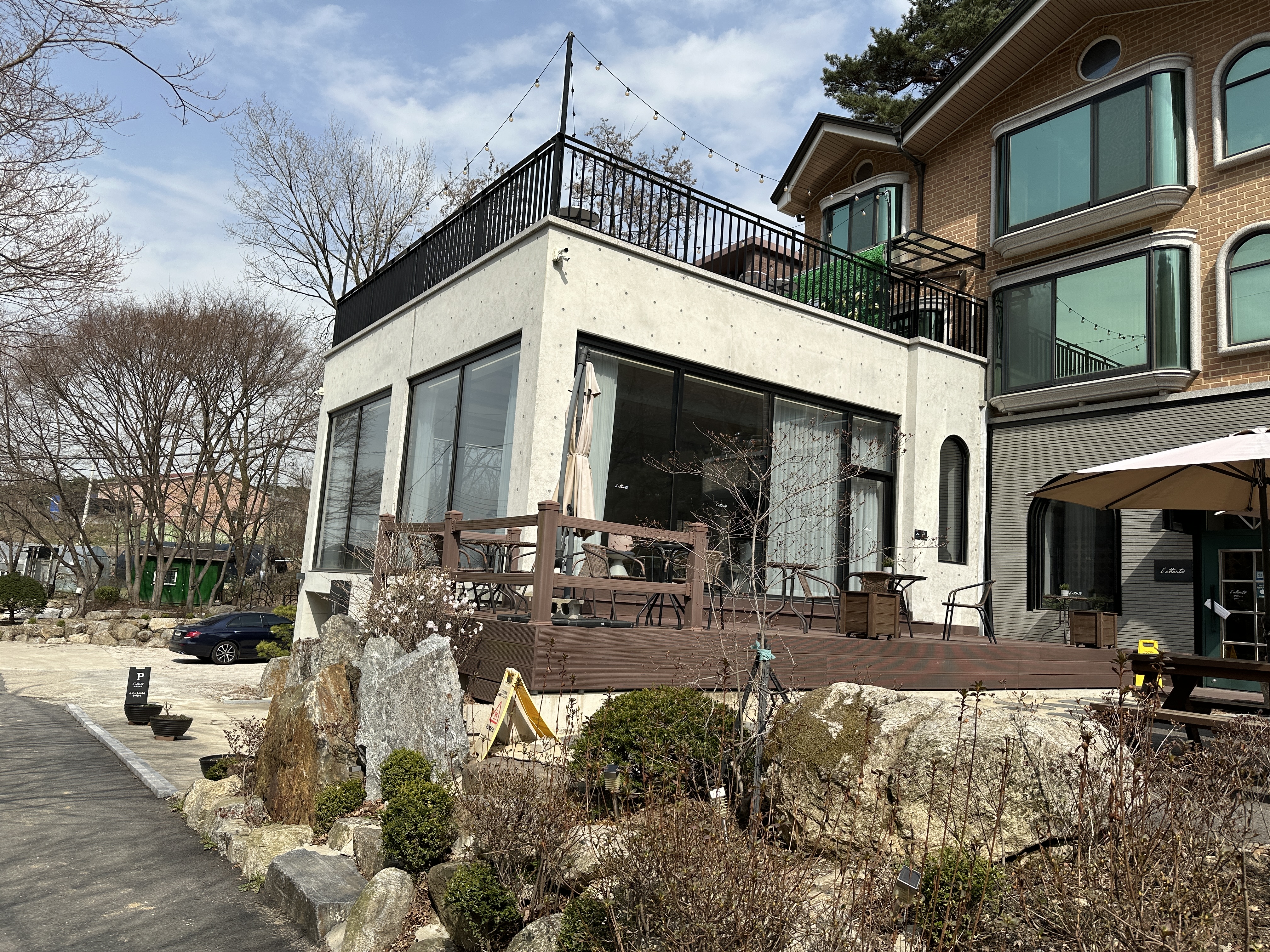 라땅뜨는 하남 구도심에서도 가장 안쪽에 위치해 있어 고골계곡과 남한산성에 가깝다. 고골 공영주차장이 길 끝이라고 생각했는데 아니었다. 고골 공영주차장에서 남한산성 북문 쪽으로 올라가다 삼거리에서 오른쪽으로 일 차선 도로를 올라간다. 이런 곳에 카페가 있어? 하는 의문이 들 때쯤, 라땅뜨가 나온다. 길이 좁으니 앞에서 차가 오는지 꼭 잘 살피고 운전해야 한다. 고골 공영주차장에서 차로는 2분, 걸어서는 10분 정도 걸린다. 카페 앞에 주차장 공간이 여유 있어 차를 타고 올라가는 것이 편하다.