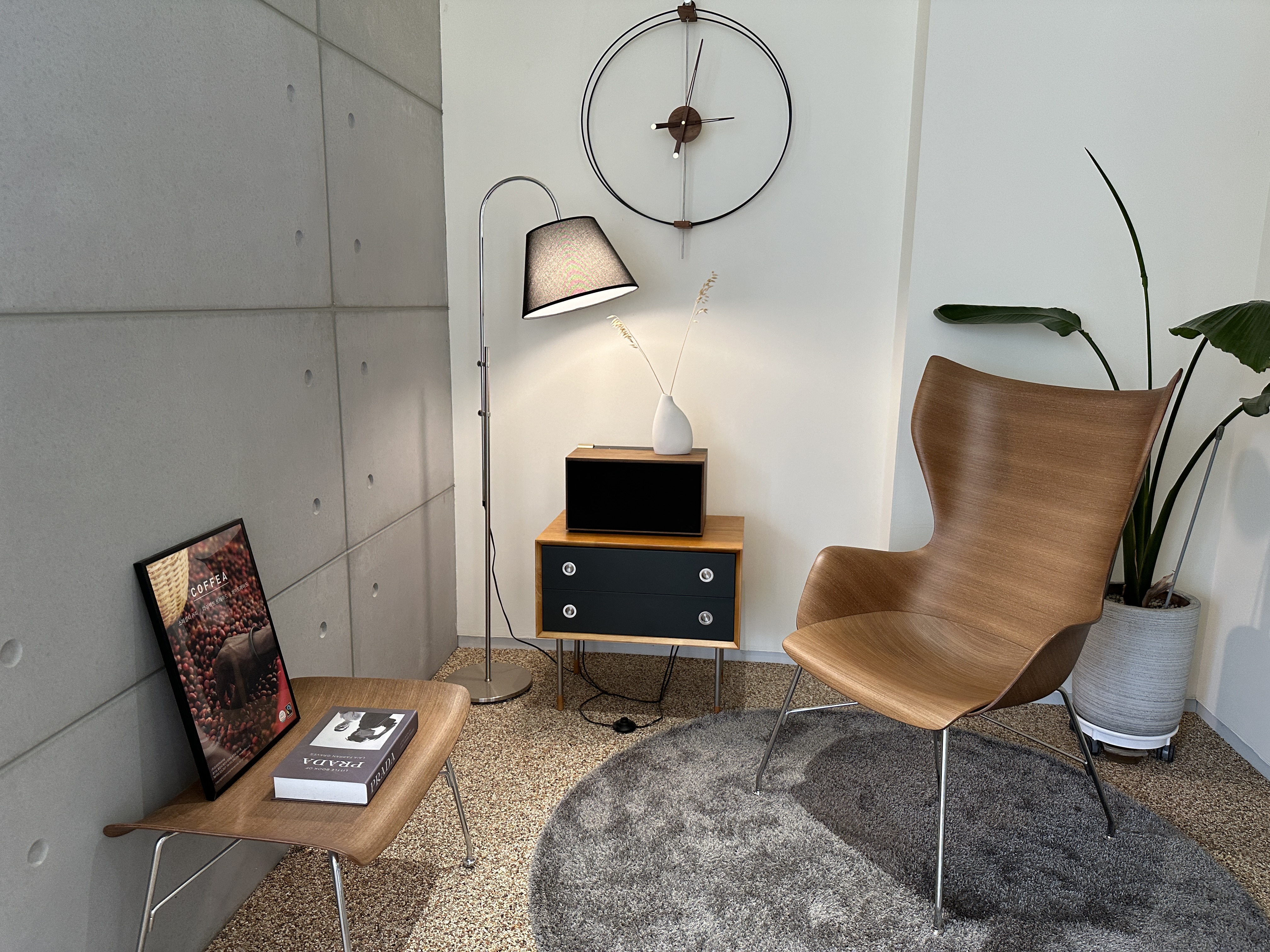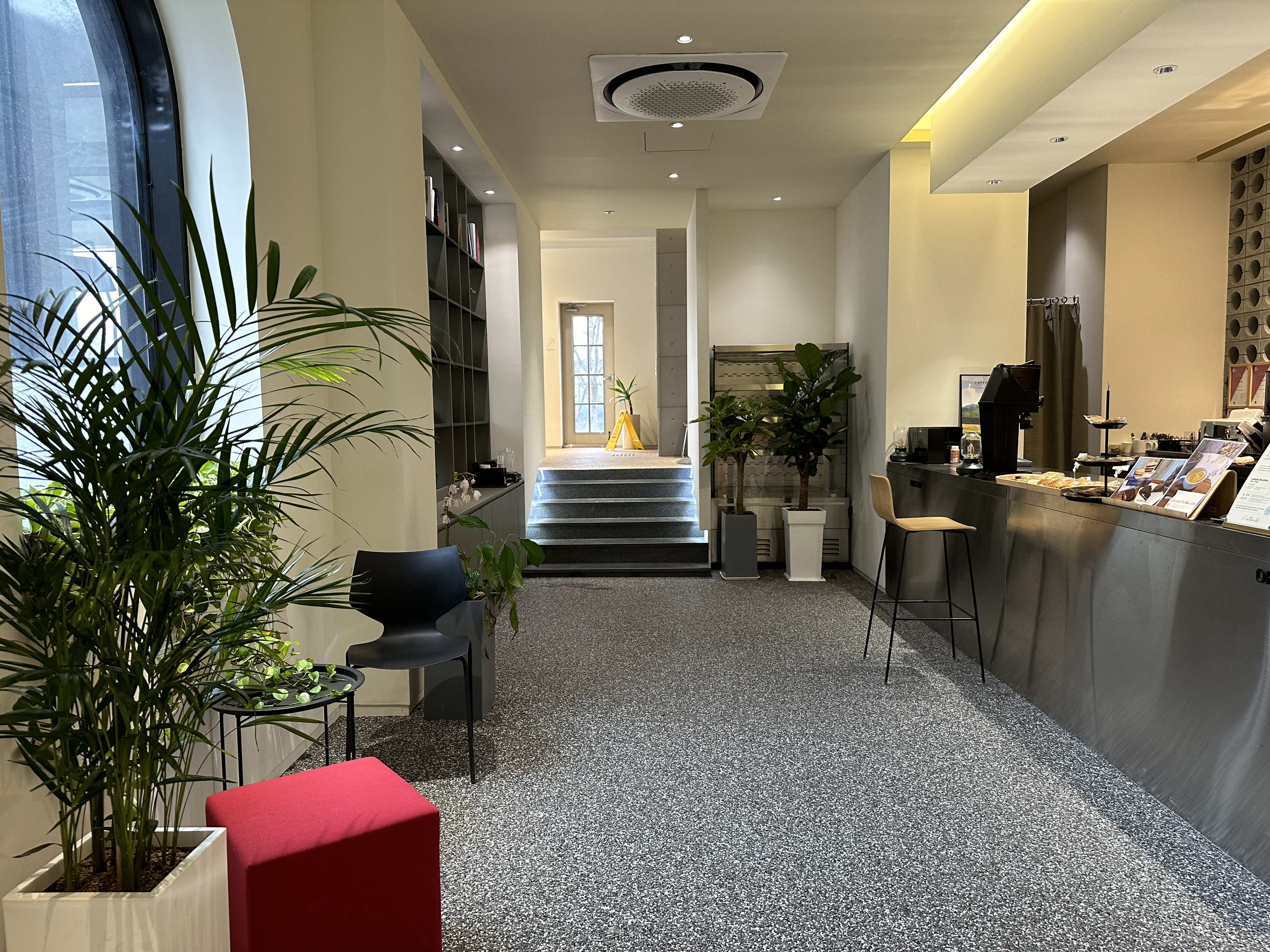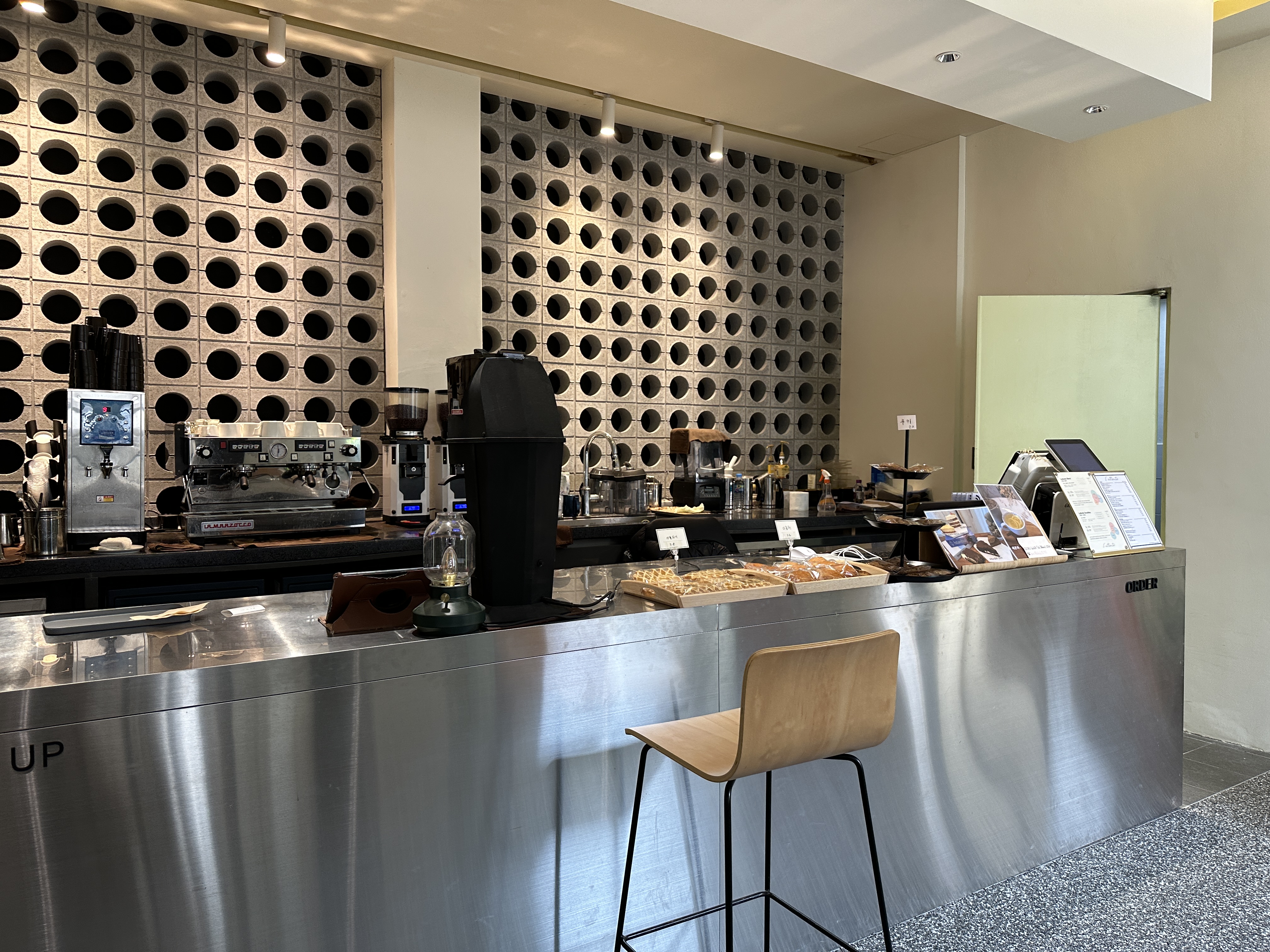 워낙 깊숙한 곳에 숨어있어 크게 기대하지 않고 갔는데, 세련된 인테리어와 구석구석 신경쓴 모습에 놀랐다. 외부에는 필로티 구조의 1층 있고 엘리베이터를 타고 2층으로 올라갈 수 있었다. 반대쪽에는 바로 2층 카페로 연결되는 출입구도 있다. 필로티 공간에도 긴 나무 의자가 놓여있어 춥지 않으면 이곳을 이용할 수도 있다.