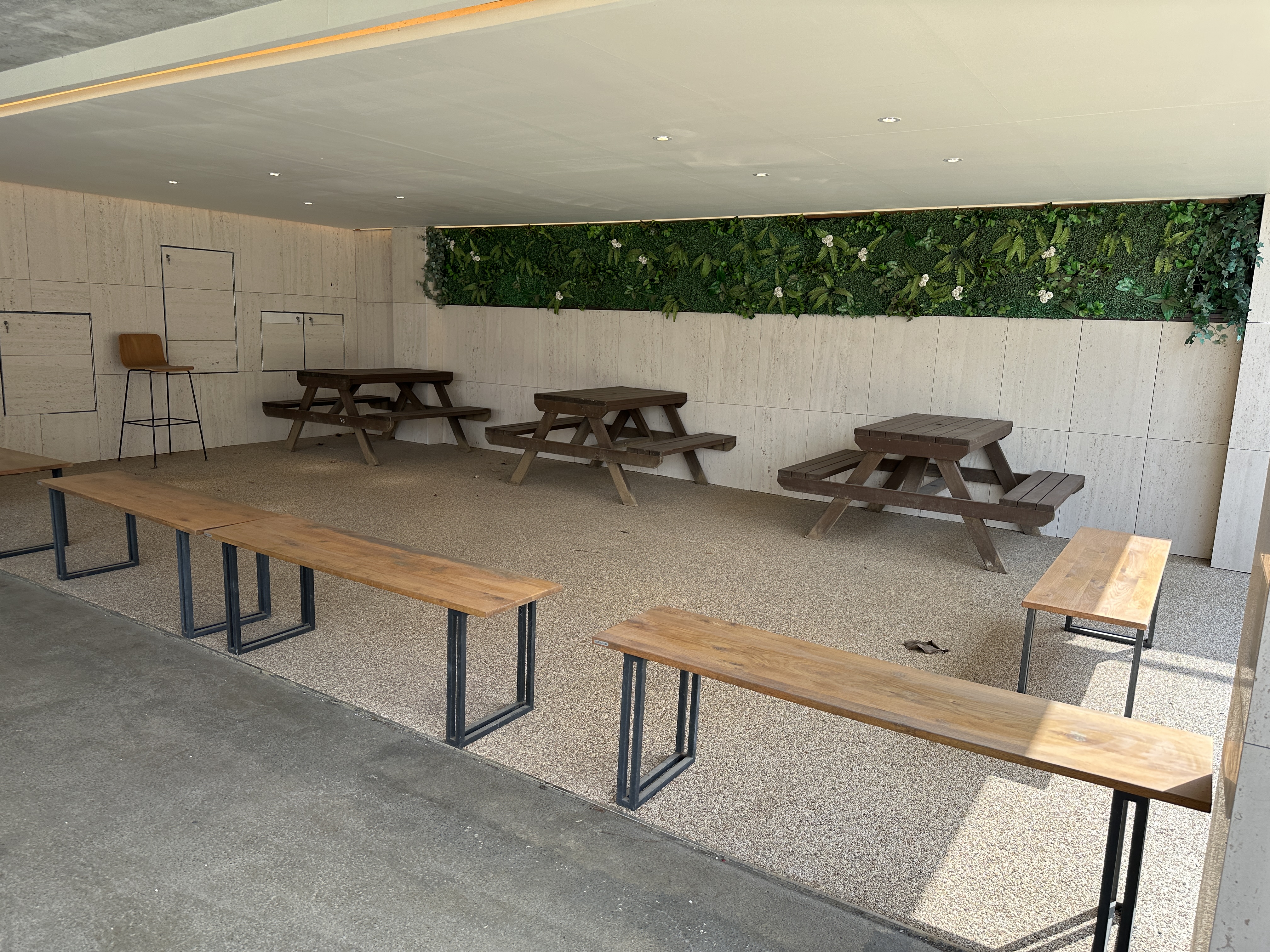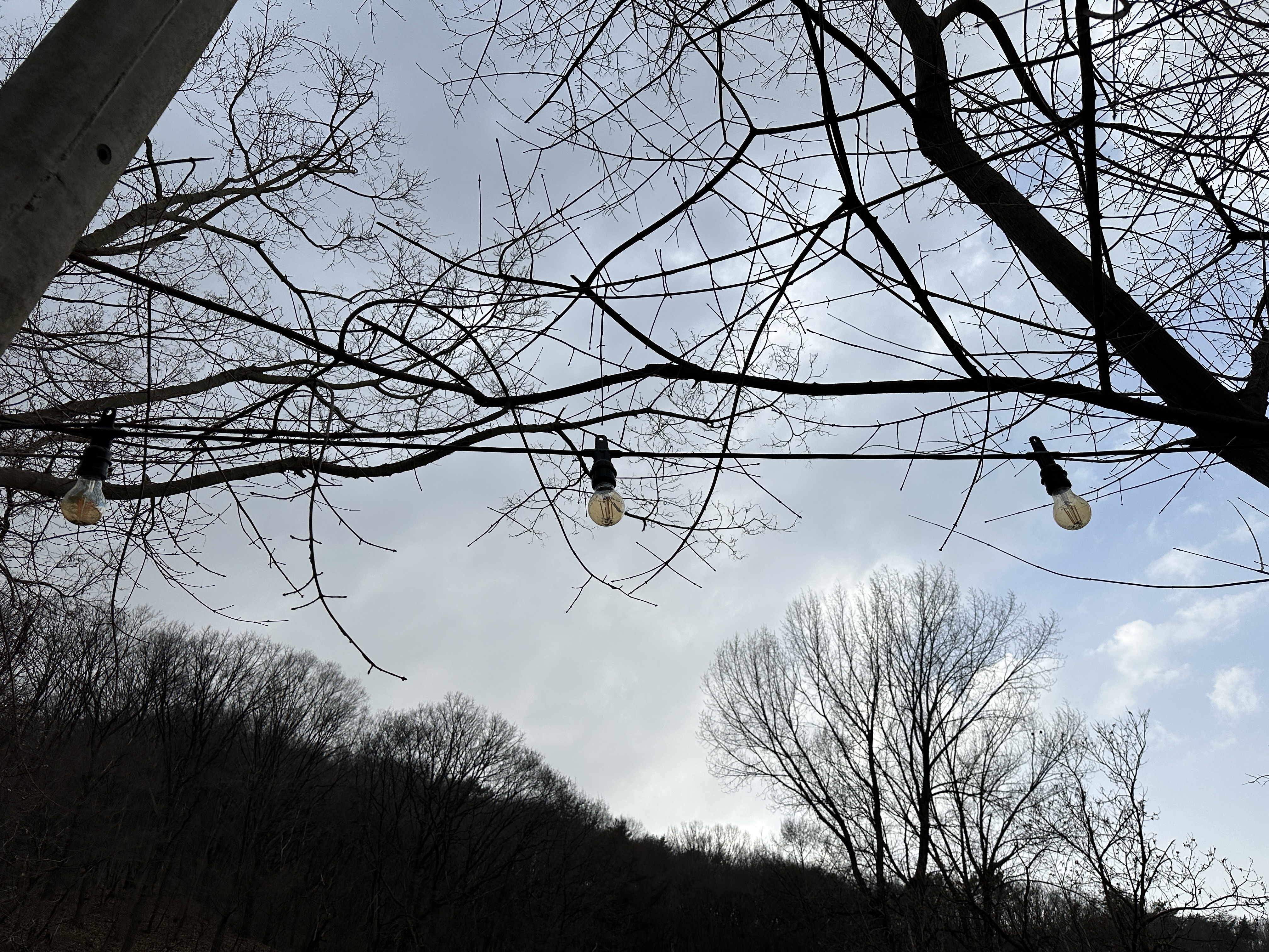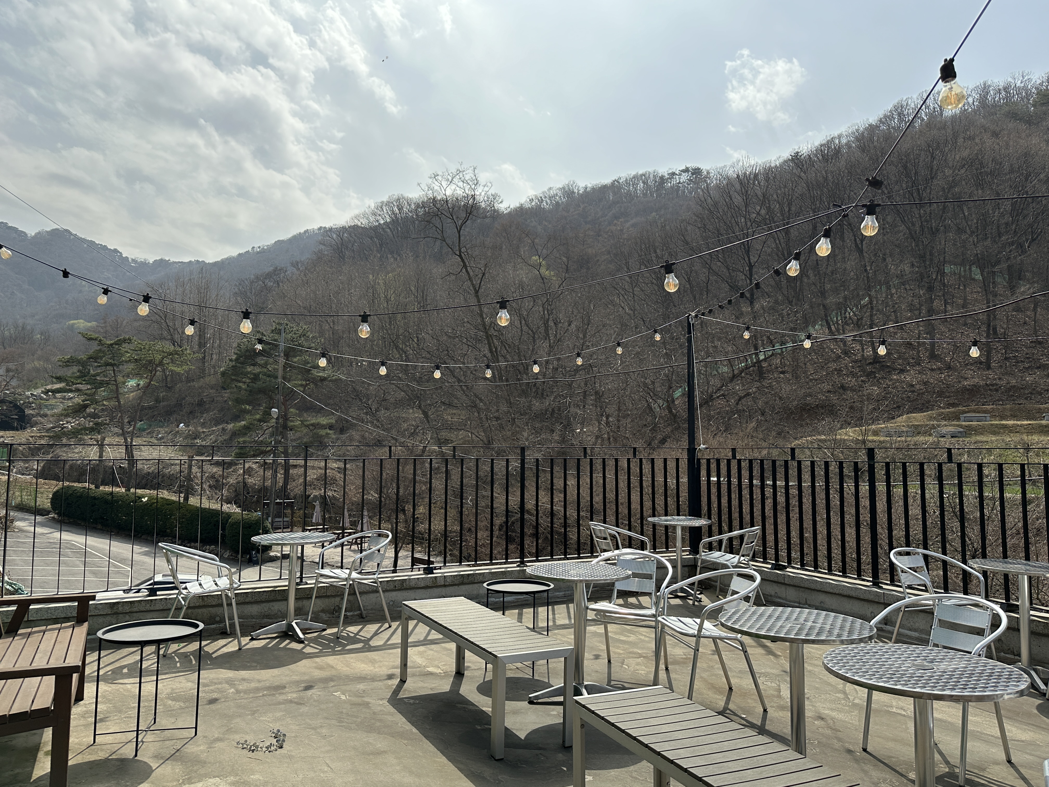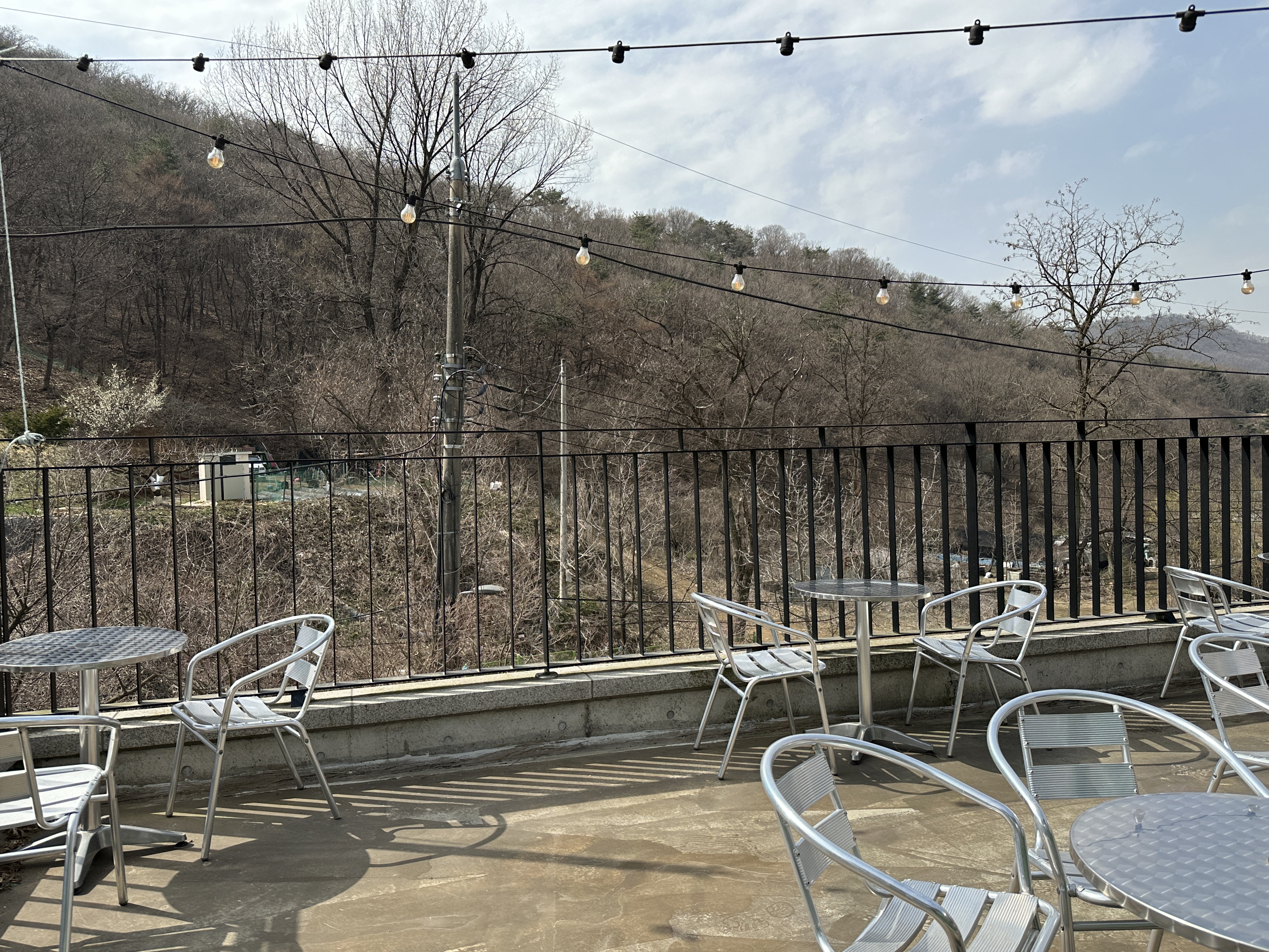커피를 주문하고 3층 루프탑에도 가 보았다. 야외에 잘 어울리는 스틸 의자와 테이블들이 비치되어 있고 머리 위로 알전구 조명들이 걸려있었다. 낮에는 푸른 하늘과 산, 계곡이 보여서 예뻣고 밤에는 밝은 조명이 빛나 예쁠 것 같았다.