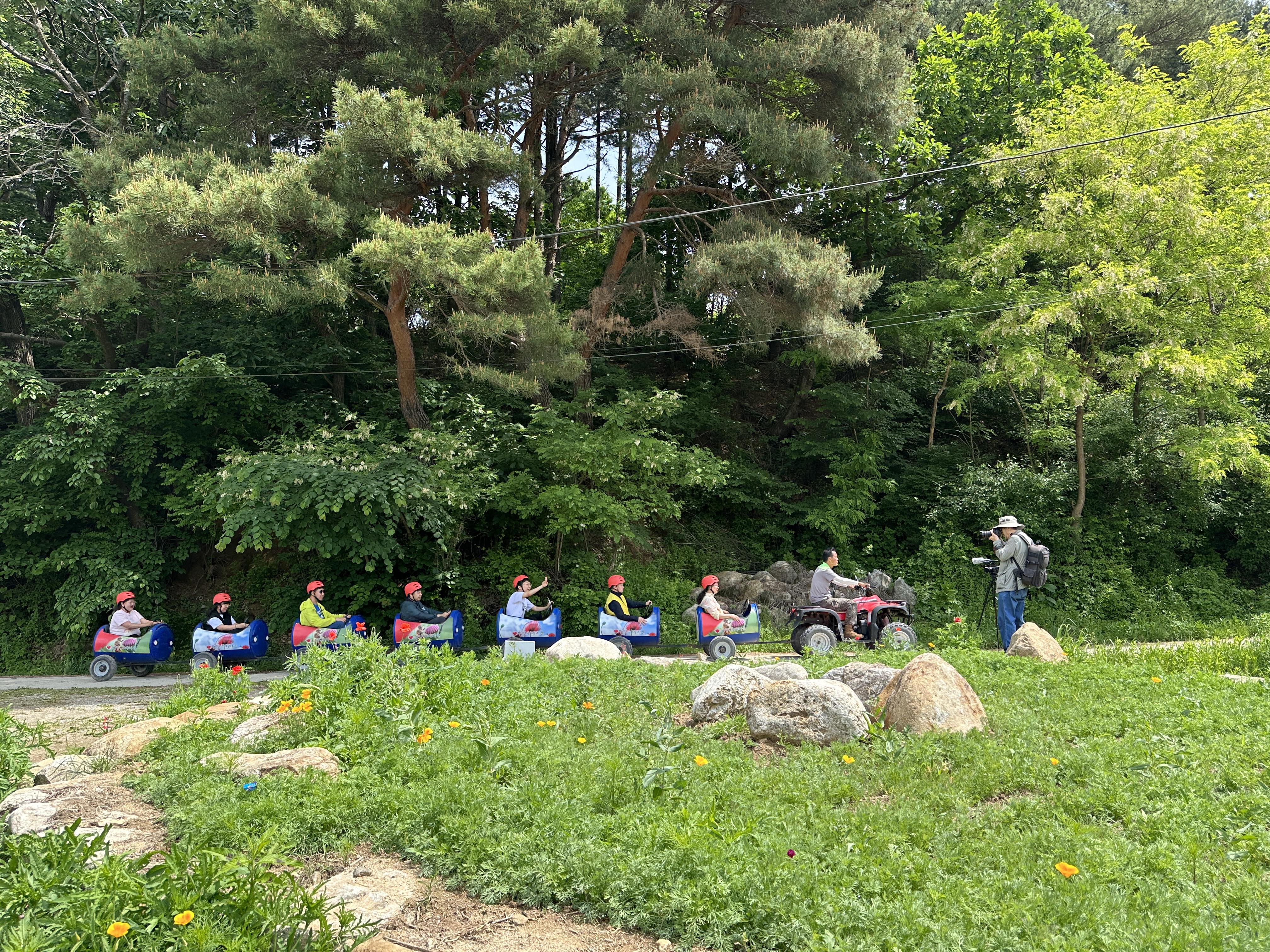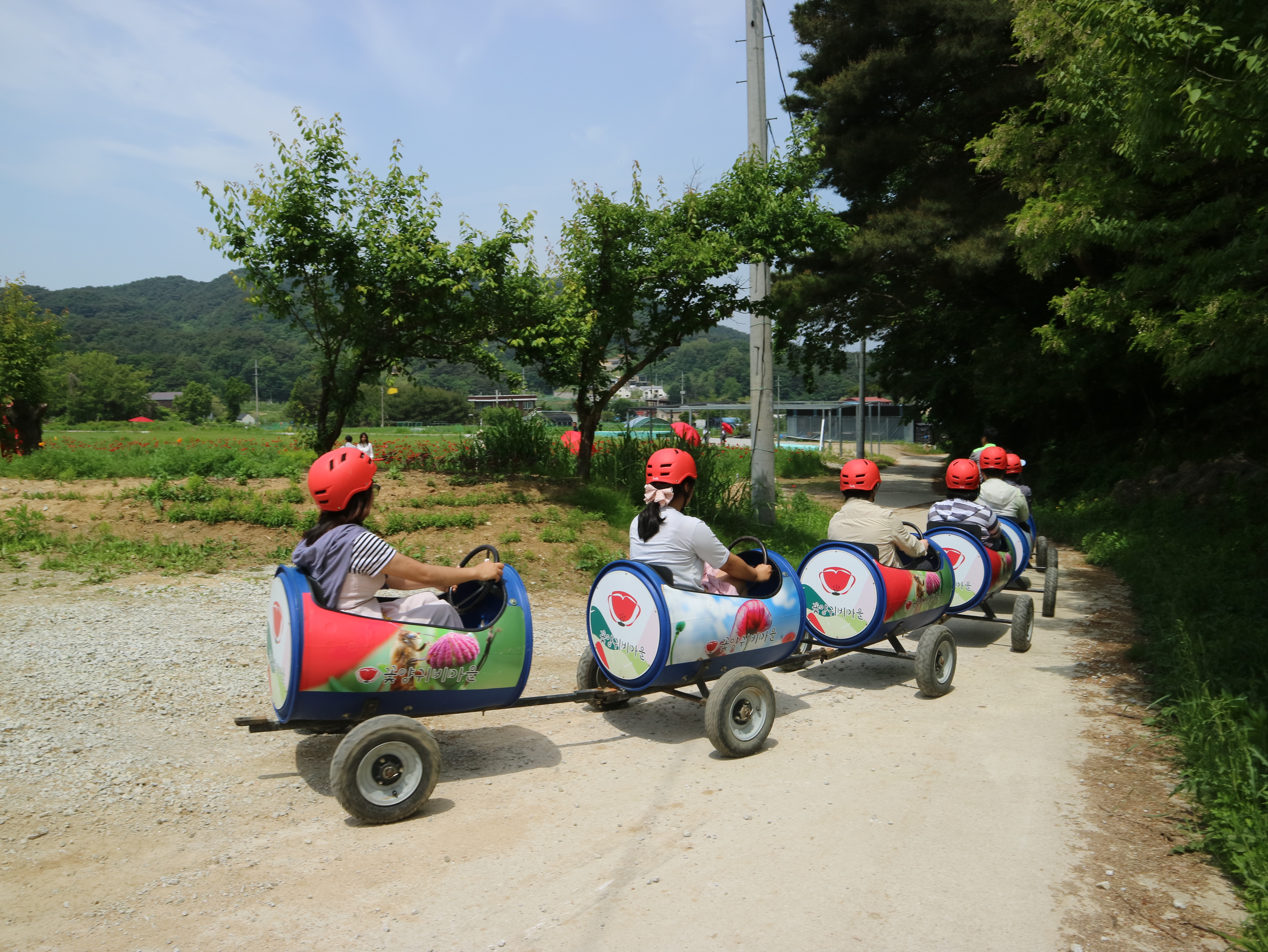 꽃양귀비 축제에서 여러 체험이 가능했는데요. 가장 대표적인 것이 깡통열차 탑승입니다. 비용은 3,000원인데요. 관람권을 구매하는 키오스크에서 함께 구입이 가능합니다. 입구 오른쪽 깡통열차 승차장에서 열차를 타고 양귀비정원을 관람할 수 있습니다. 깡통열차 탑승 시 비치되어 있는 헬멧을 꼭 써야 하는데요, 깡통열차 굉장히 속도가 빠르더라고요. 깡통열차 운전은 동네 이장님이 하십니다.
