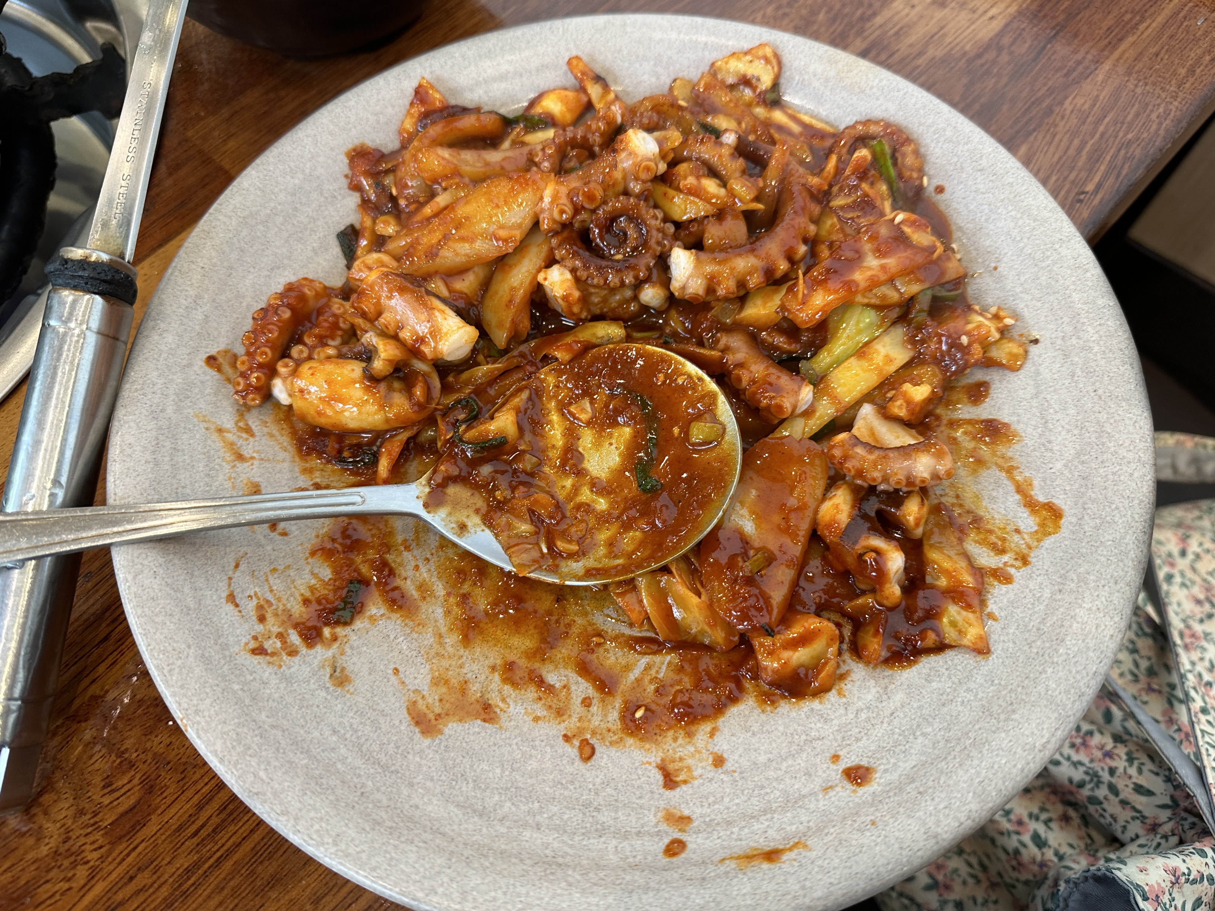 수요일 오후 12시 30분쯤 도착했는데 자리가 꽤 많았다. 차를 가져가지 않았는데 주차장도 널널했다. 언니가 나보다 먼저 도착해 낙지볶음 정식 2인분을 주문해 놓았다. 덕분에 나는 자리에 앉자마자 음식을 먹을 수 있었다. 낙지볶음 정식에는 낙지볶음과 칼국수, 계란찜이 포함되었다. 큰 대접에 담겨 나온 흰쌀밥 위에 낙지볶음을 푸짐하게 얹고 쓱쓱 비벼 먹었다. 낙지볶음 양이 꽤 많아서 밥을 새빨갛게 비비고도 남았다.