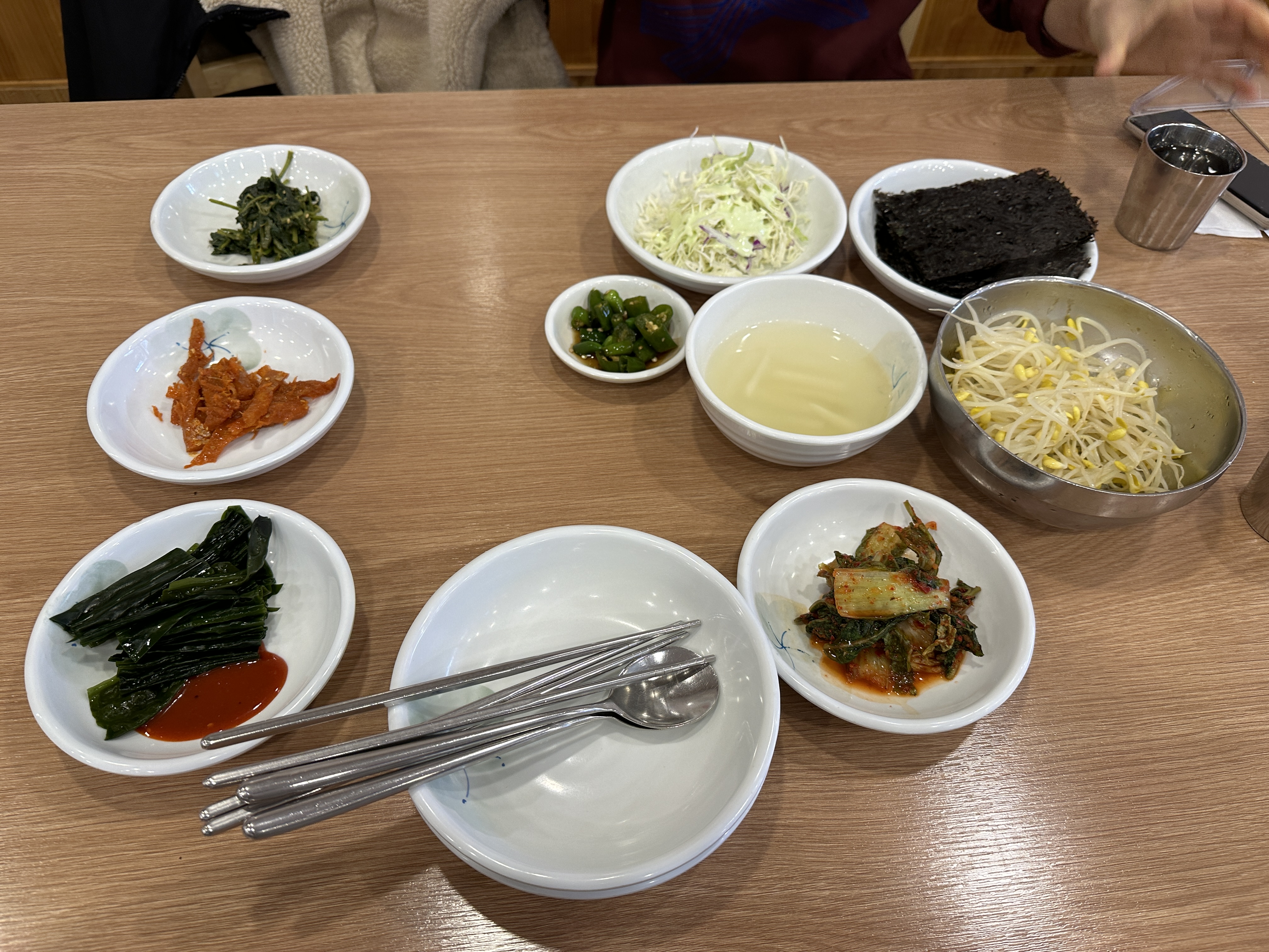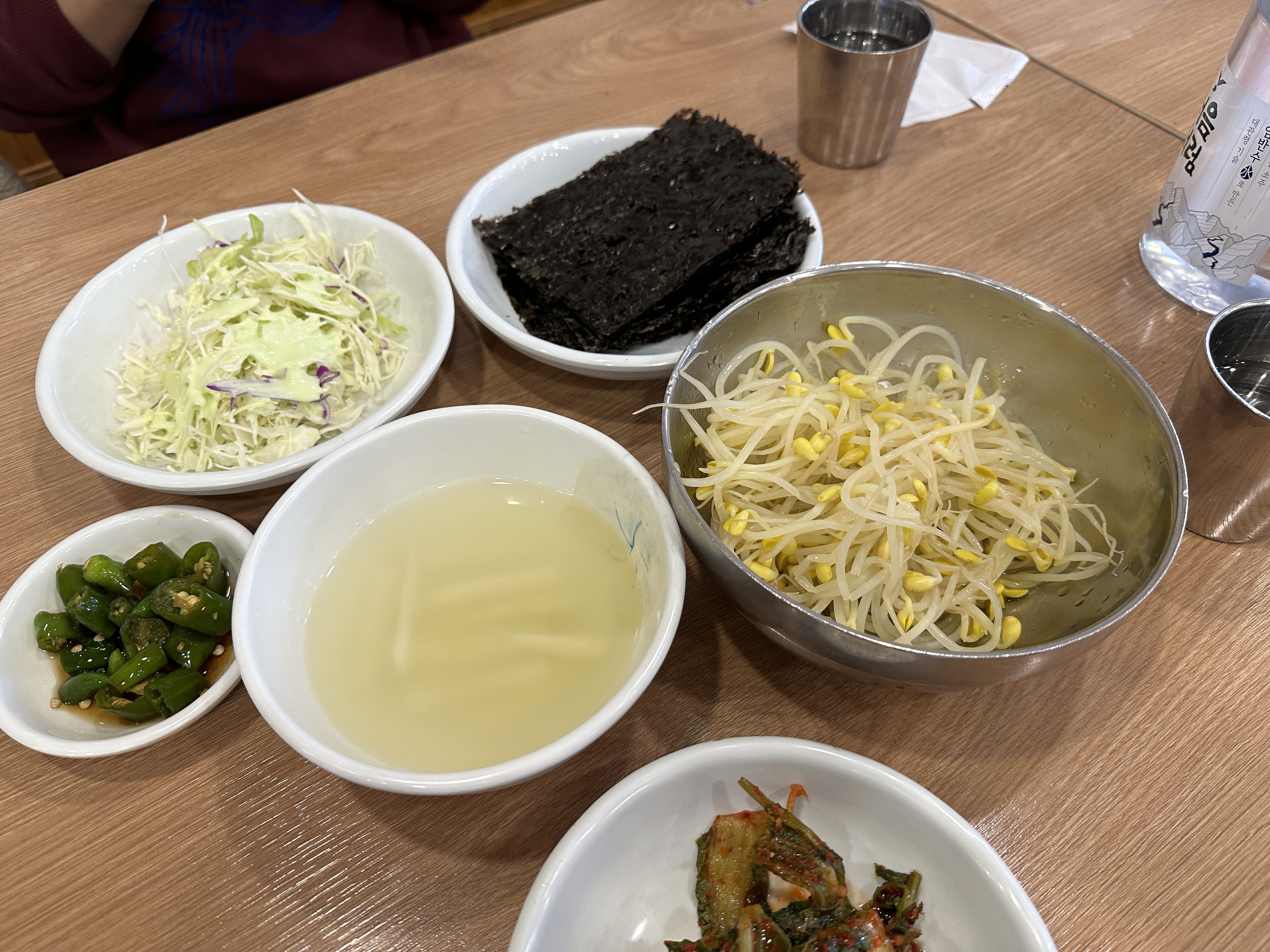 반찬이 먼저 나왔다. 황태무침, 생미역, 나물, 양배추샐러드, 김치. 그리고 데친 콩나물과 절임고추, 돌김이 나왔다. 김을 왜 이리 많이 주나? 했는데, 벽에 붙어있는 설명을 읽고 이해되었다.