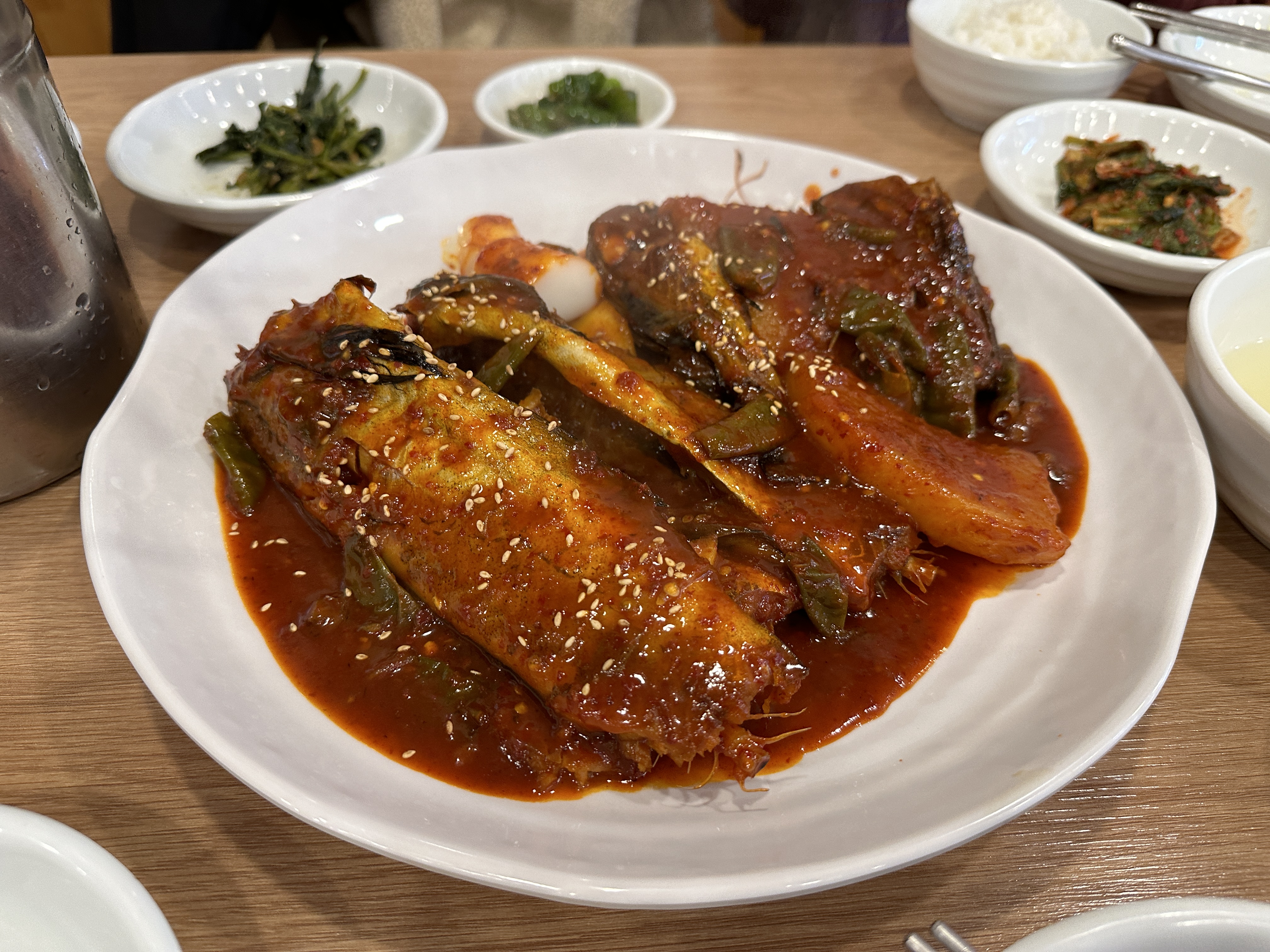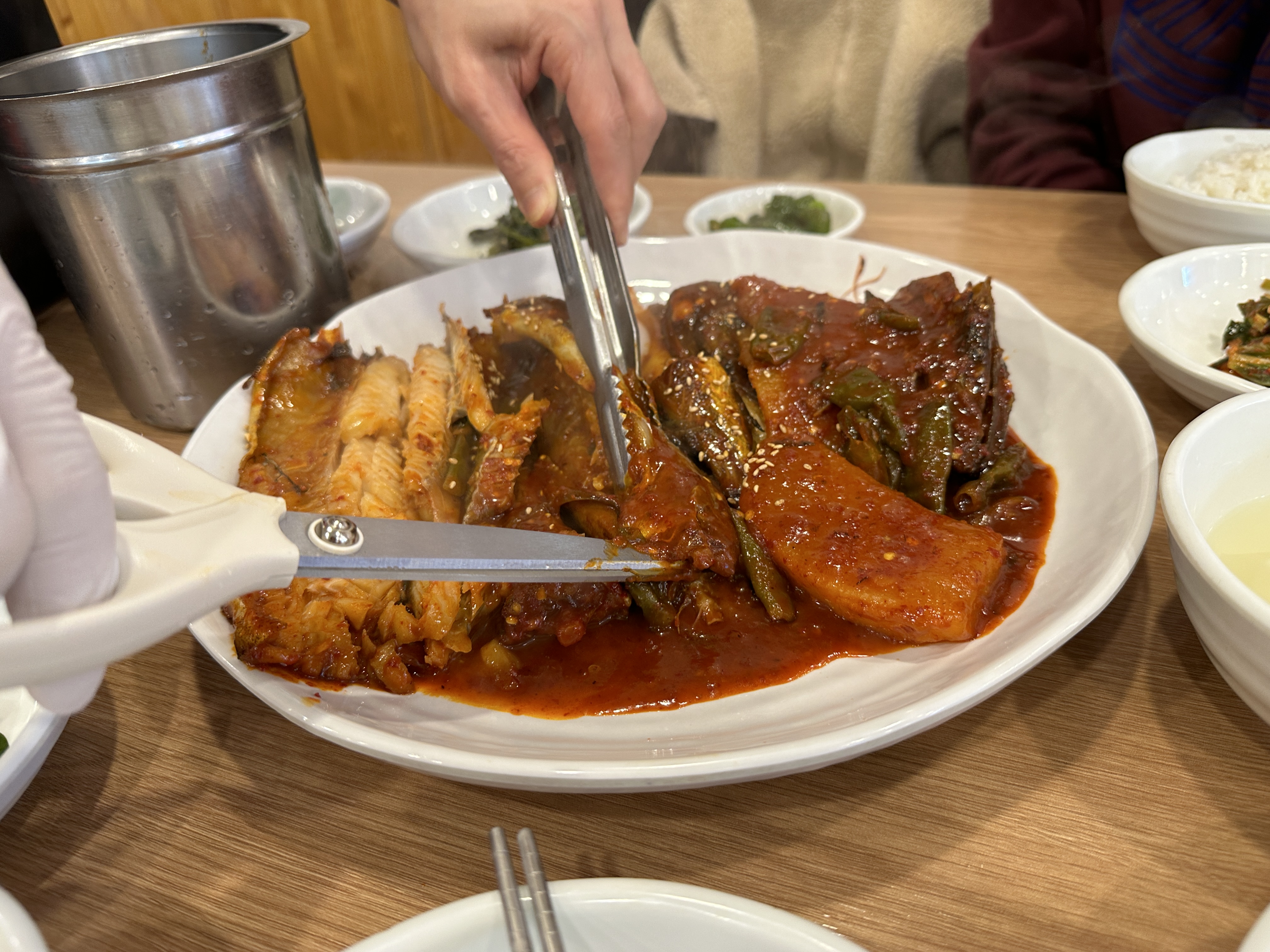 코다리가 나왔다. 특소로 가장 작은 사이즈인데도 접시가 무척 컸다. 코다리도 두 마리라서 두 명이 먹기에 양이 넉넉했다. 직원분이 가장 큰 뼈는 발라주었다. 토실토실한 코다리 외에 떡과 무, 청양고추가 적절히 섞여있었다.