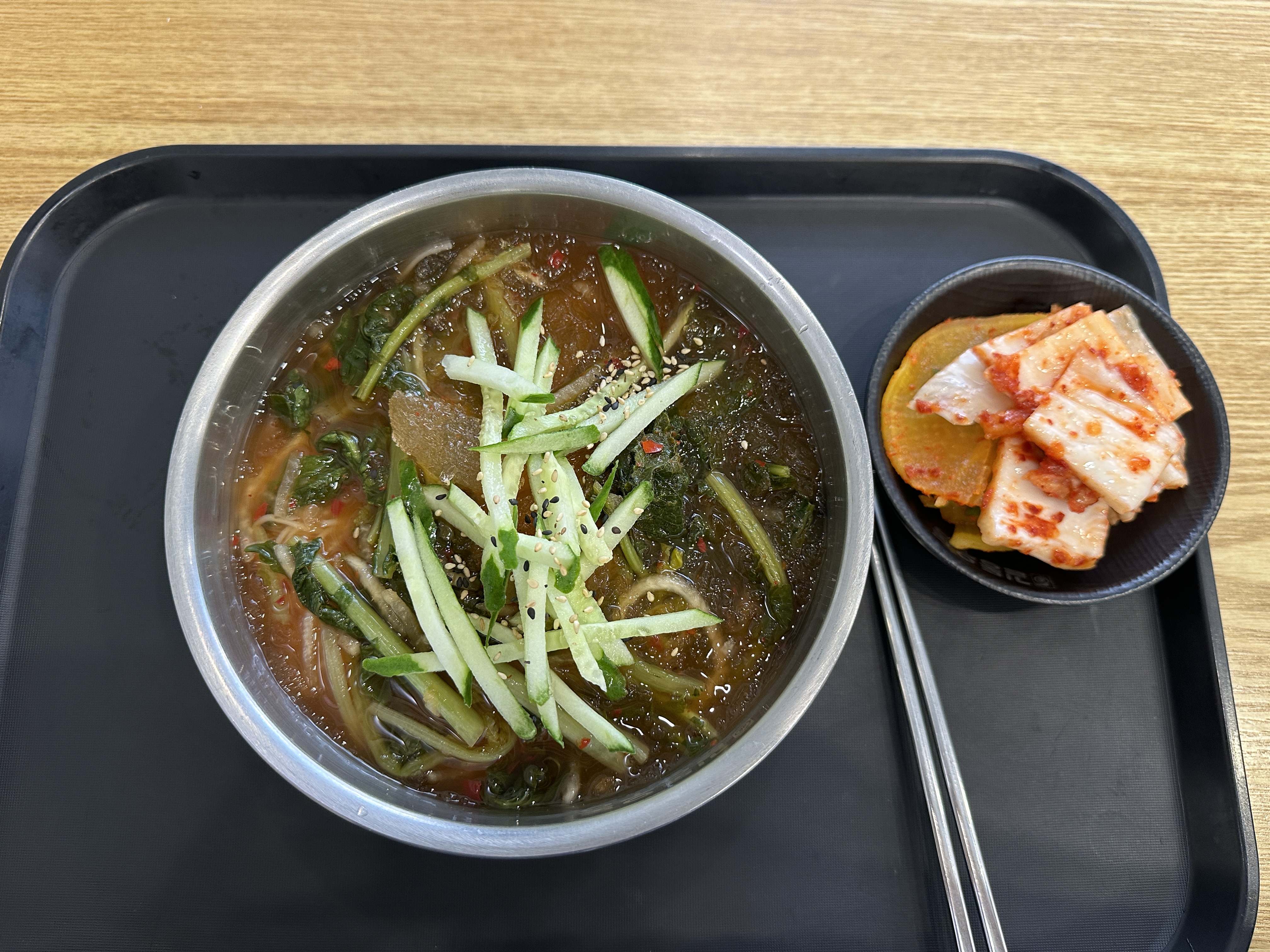 10분쯤 기다리니까 내 음식이 나왔다. 뽀얗게 삶아진 면 위에 살얼음 육수와 열무김치와 잘게 썬 오이가 푸짐하게 올려져있었다. 셀프 반찬 코너에서 단무지와 김치를 담아왔다. 열무김치가 올려져 있지만 김치 반찬은 참을 수 없지.