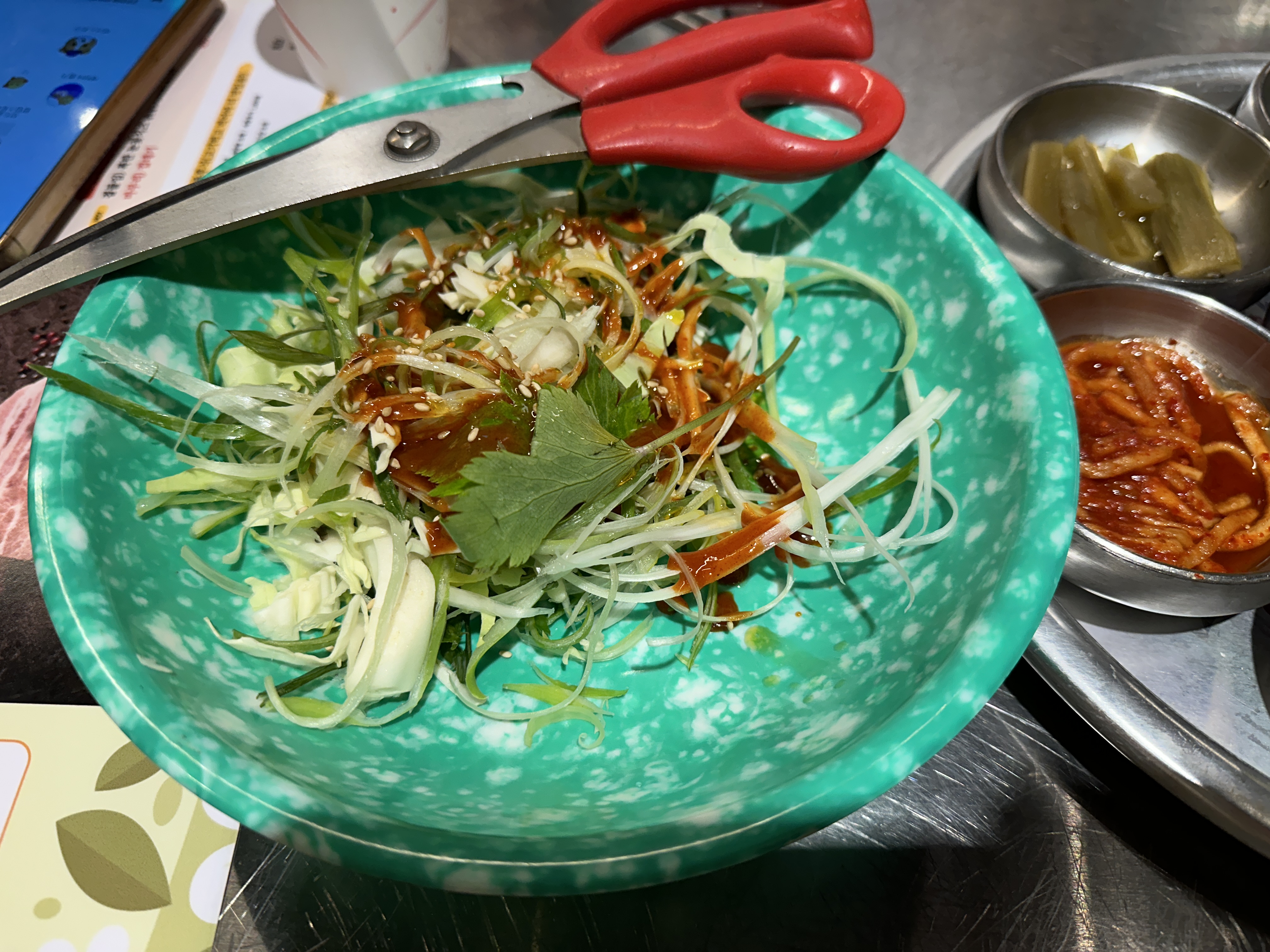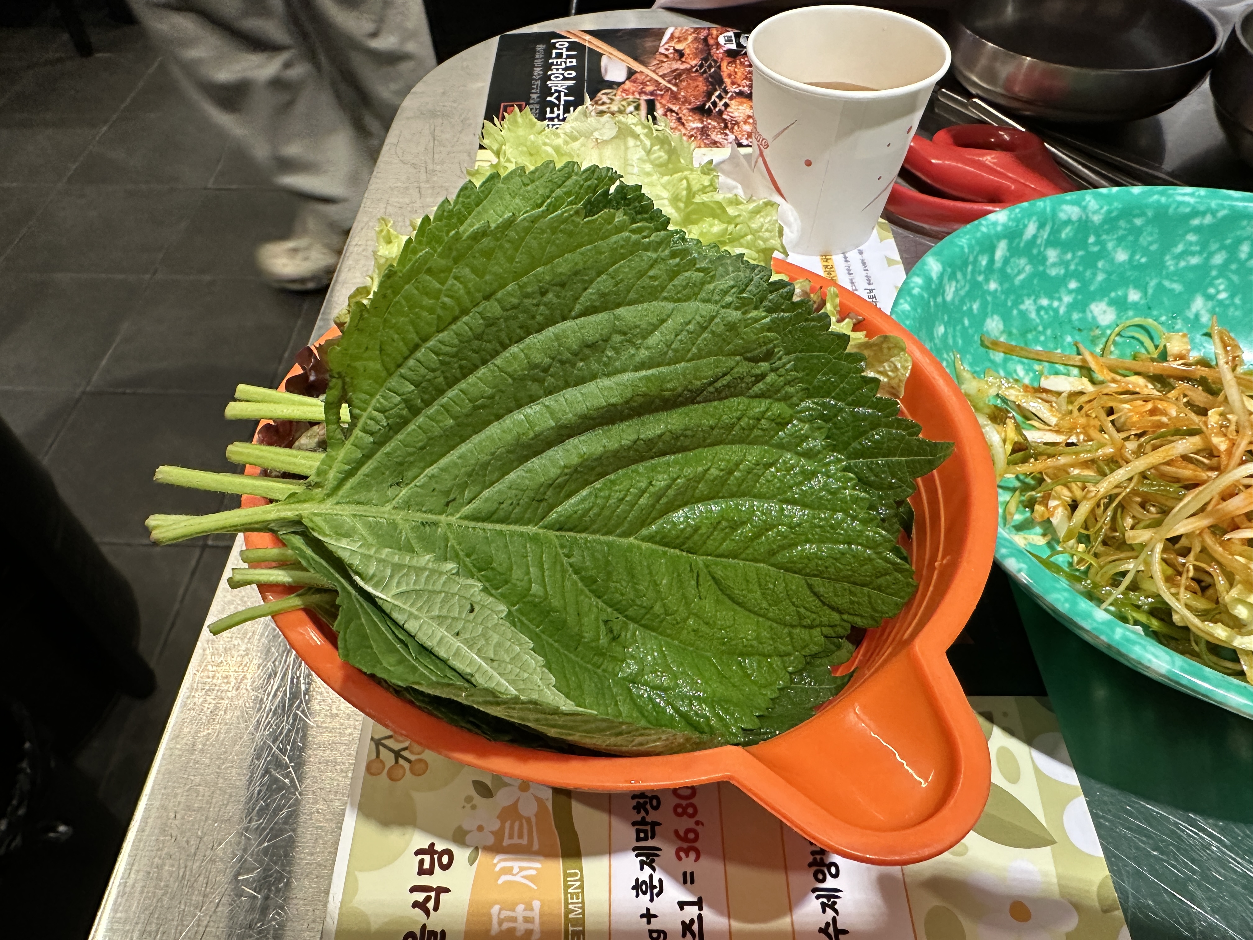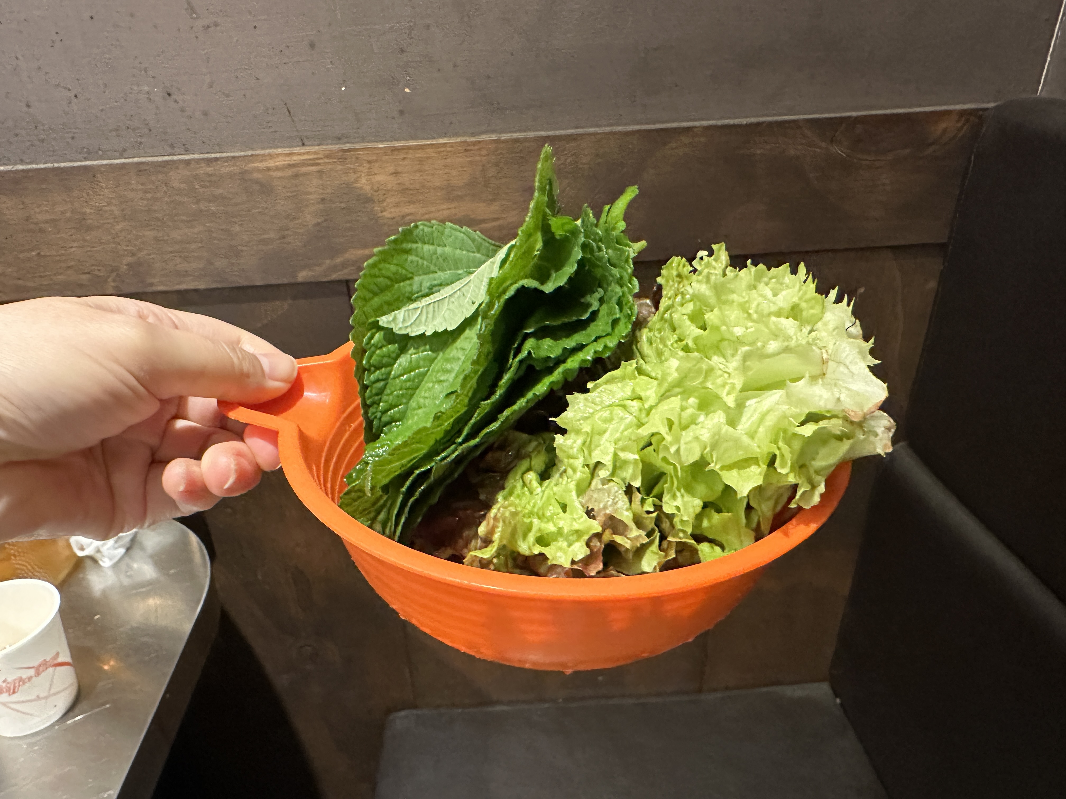 셀프바에서 상추와 깻잎을 여러 번 리필해 고기와 함께 먹었다.