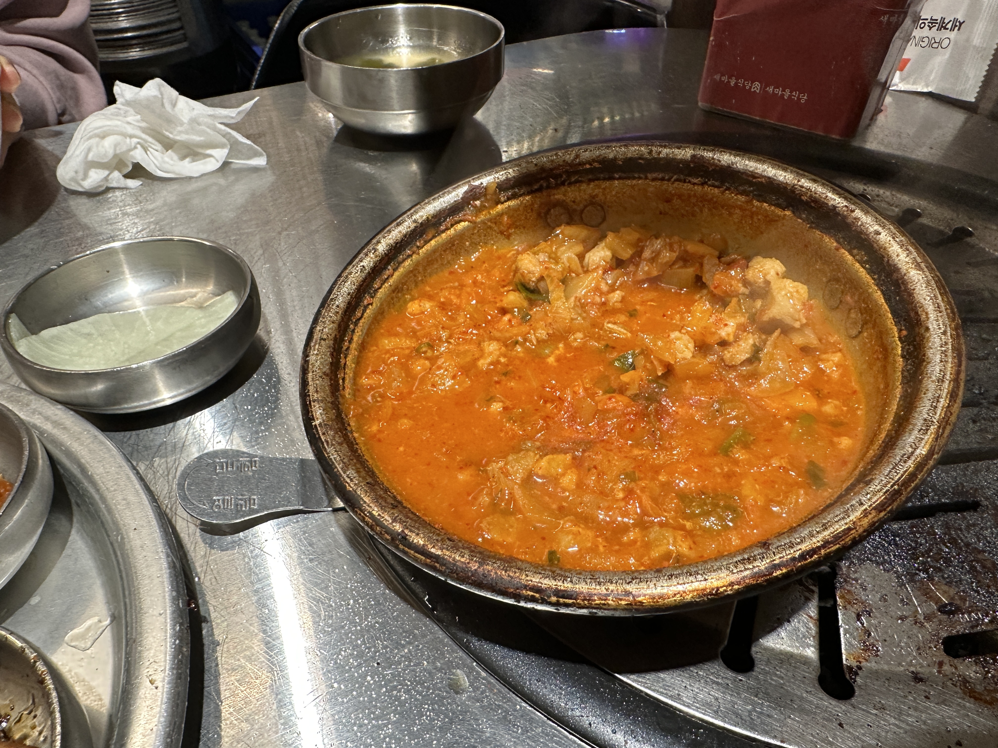 각자 공깃밥 하나씩을 앞에두고 보글보글 맛있게 끓은 찌개를 밥에 부어 슥슥 비볐다. 김치찌개 양이 무척 많아서 각자 공깃밥이 촉촉하게 비볐는데도 남았다.