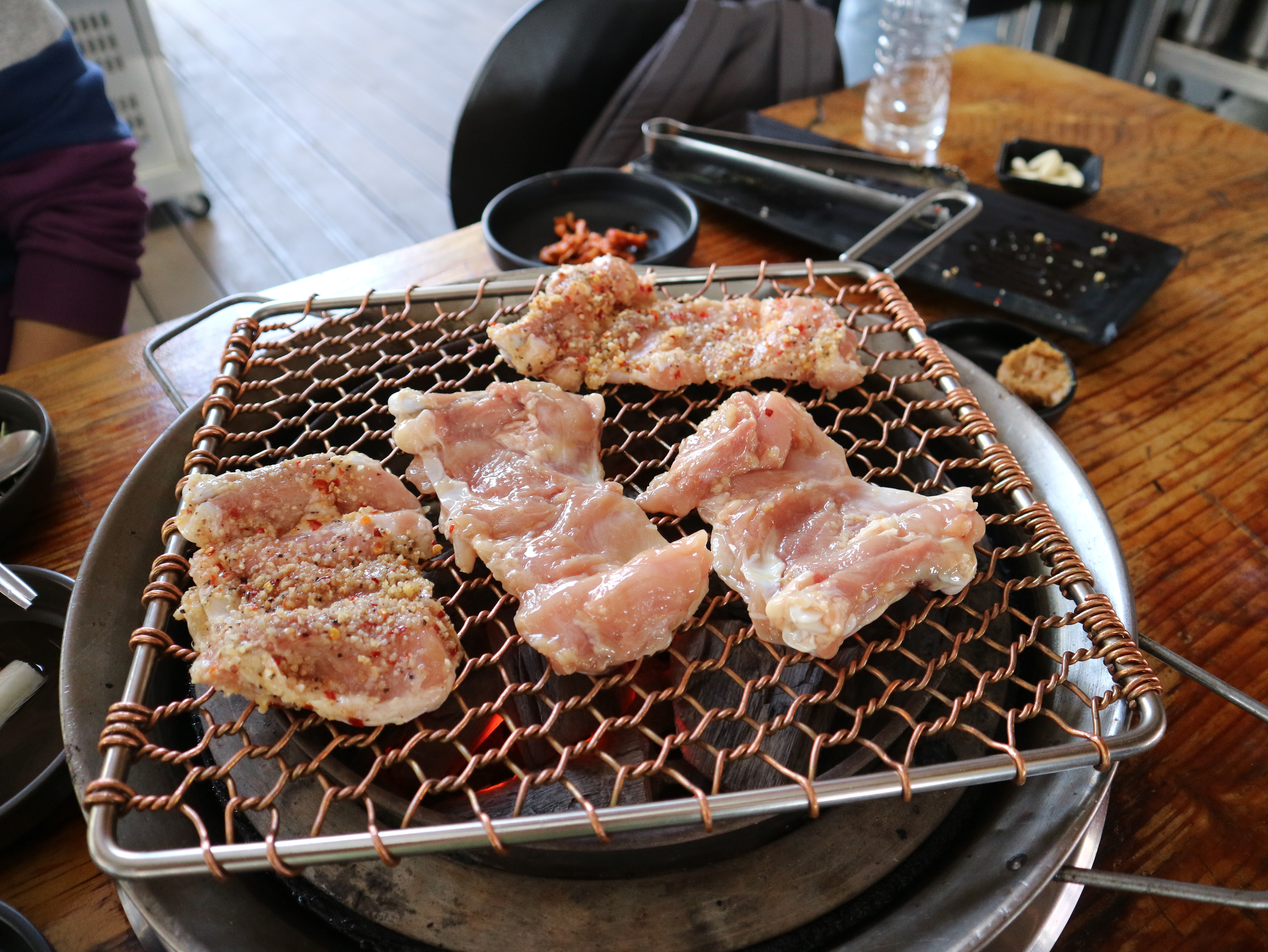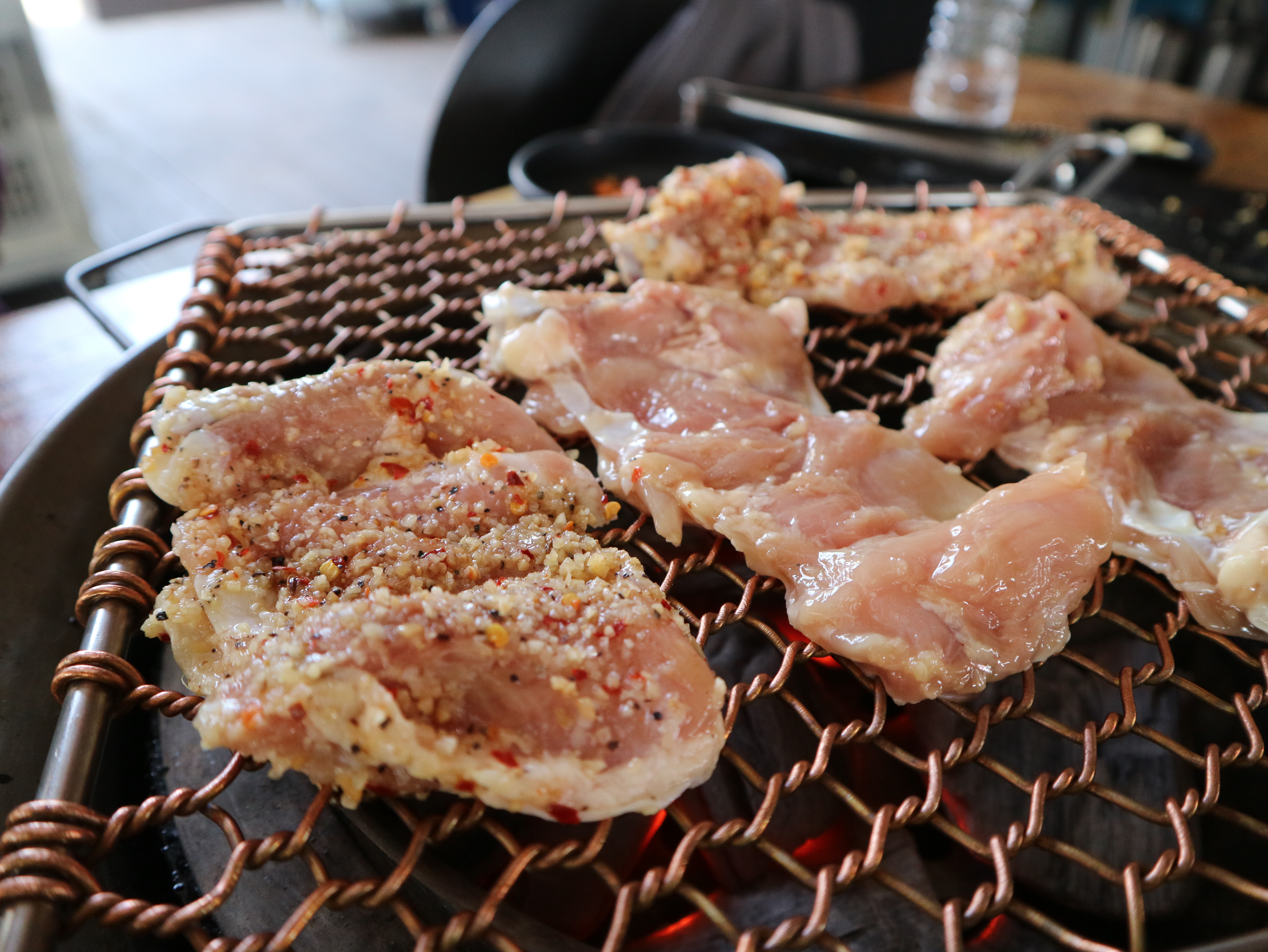 신선한 닭갈비를 숯불에 구워서 고소하고 쫀득한데 개인적으로 소금구이가 더 맛있었어요.
