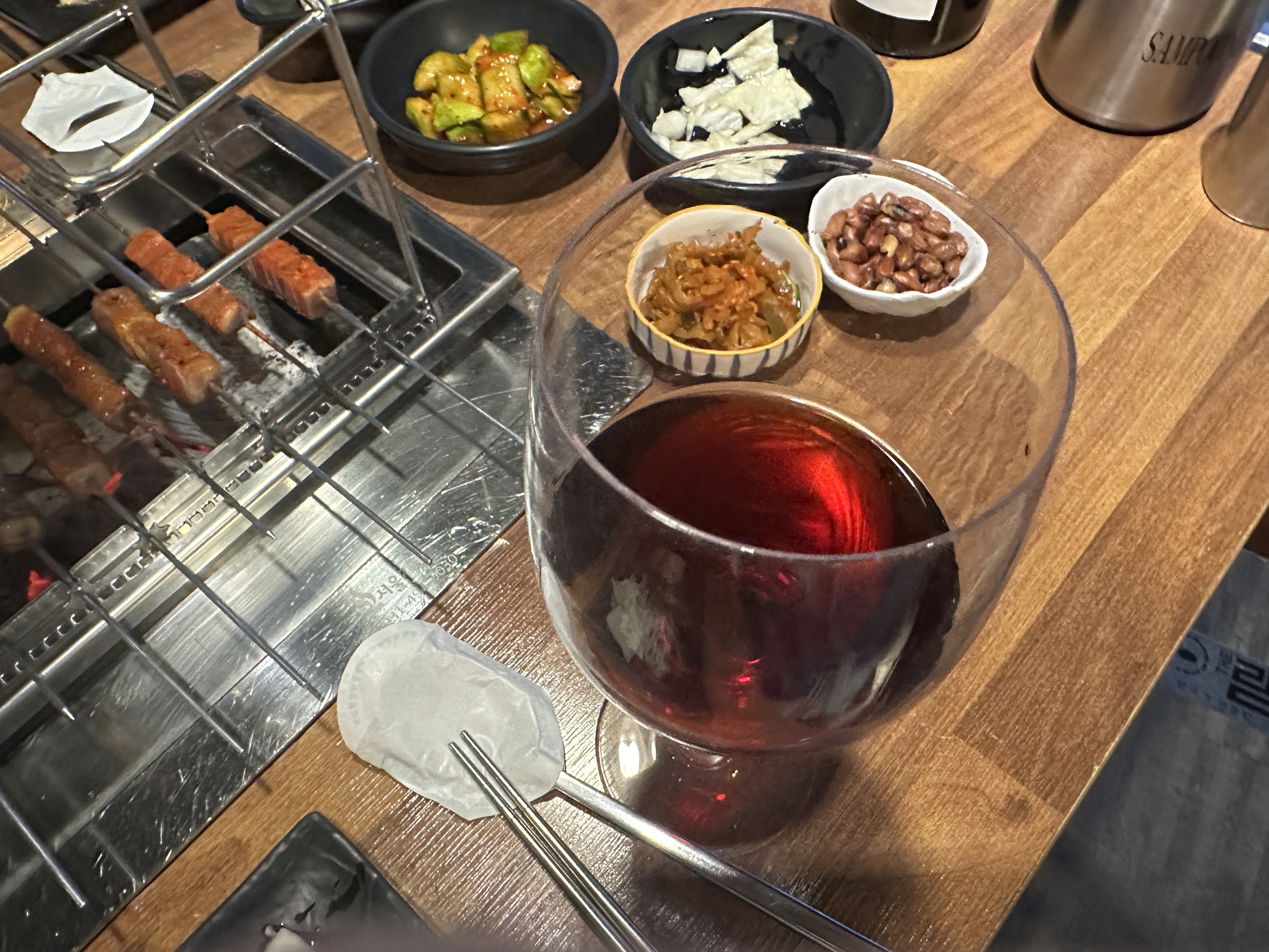 양꼬치가 다 익은 후 와인잔을 쫜~~~ 치얼스 하고