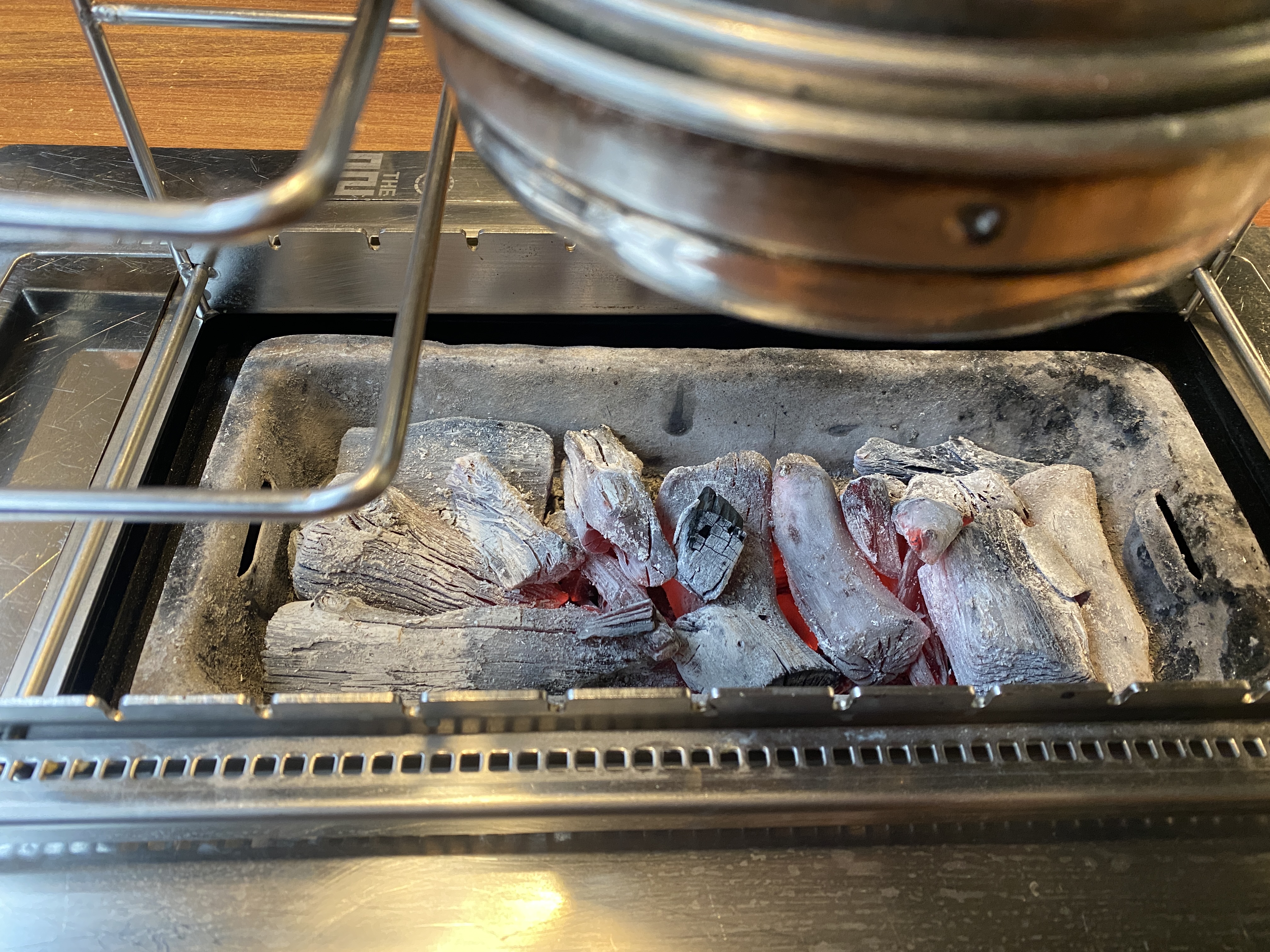 기본 반찬과 와인잔이 세팅되고 숯불도 넣어주셨어요.